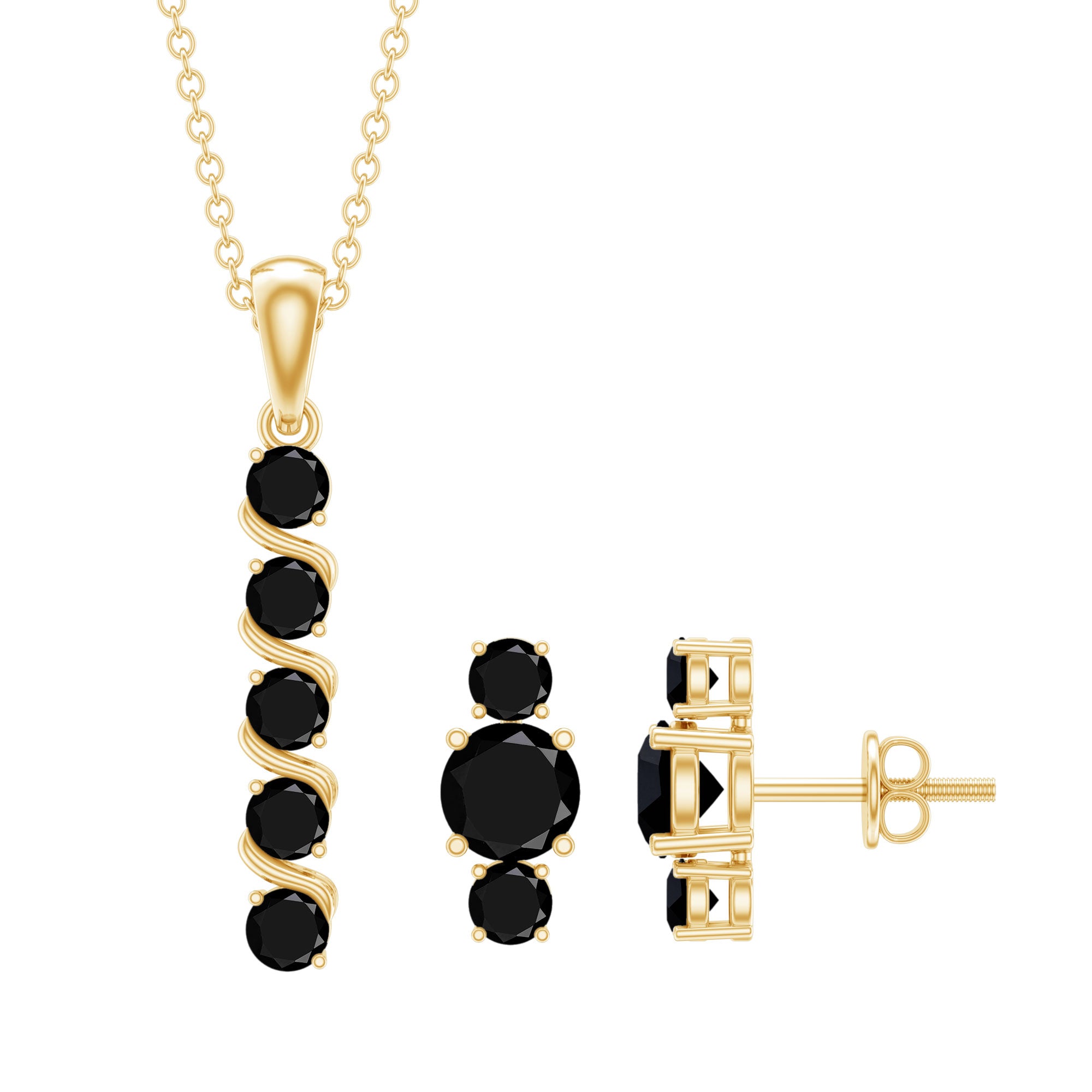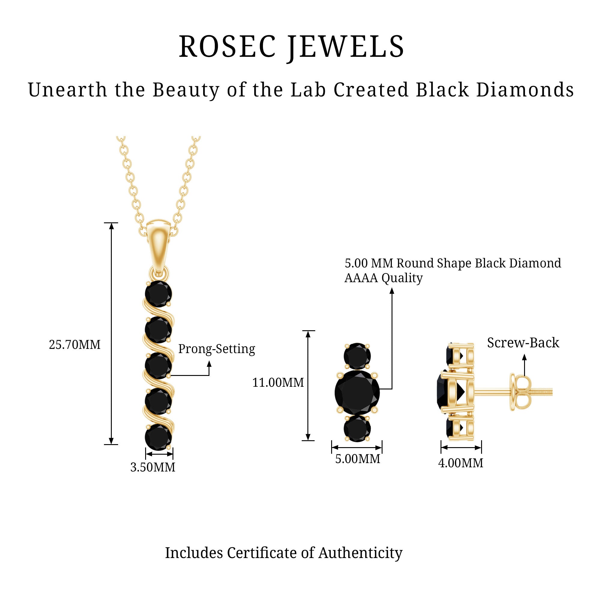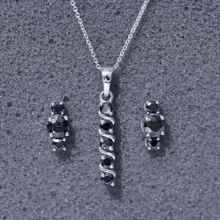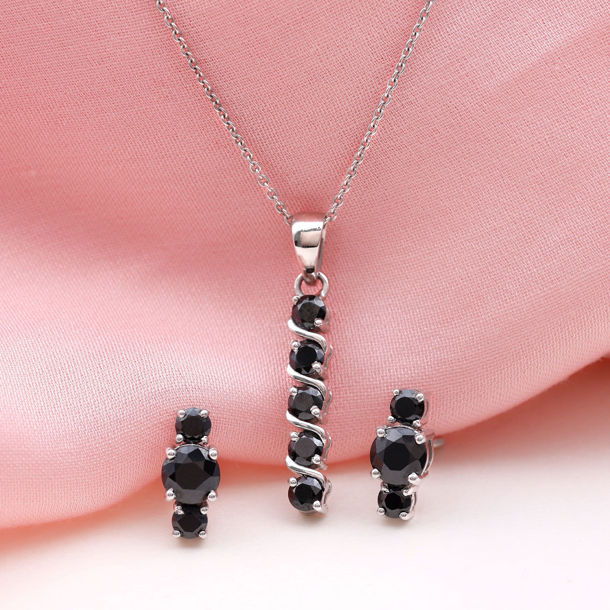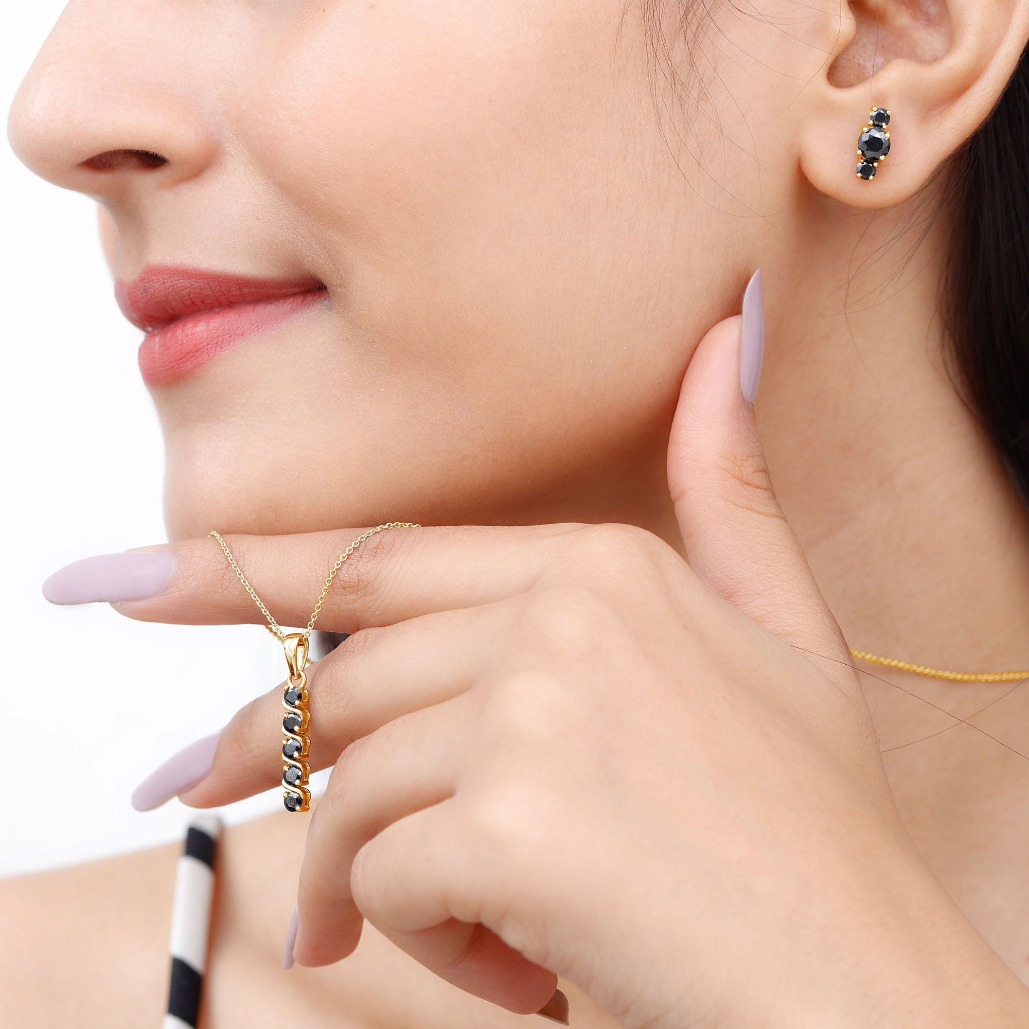 This exquisite necklace and earring set features a row of sparkling black diamond bar necklace in a drop & dangle style along with matching earrings featuring a trio of black diamond stud earrings. This necklace and earrings set is perfect for any occasion, from a casual day out to a formal event. It is also a great gift for any woman who appreciates beautiful and unique jewelry.