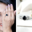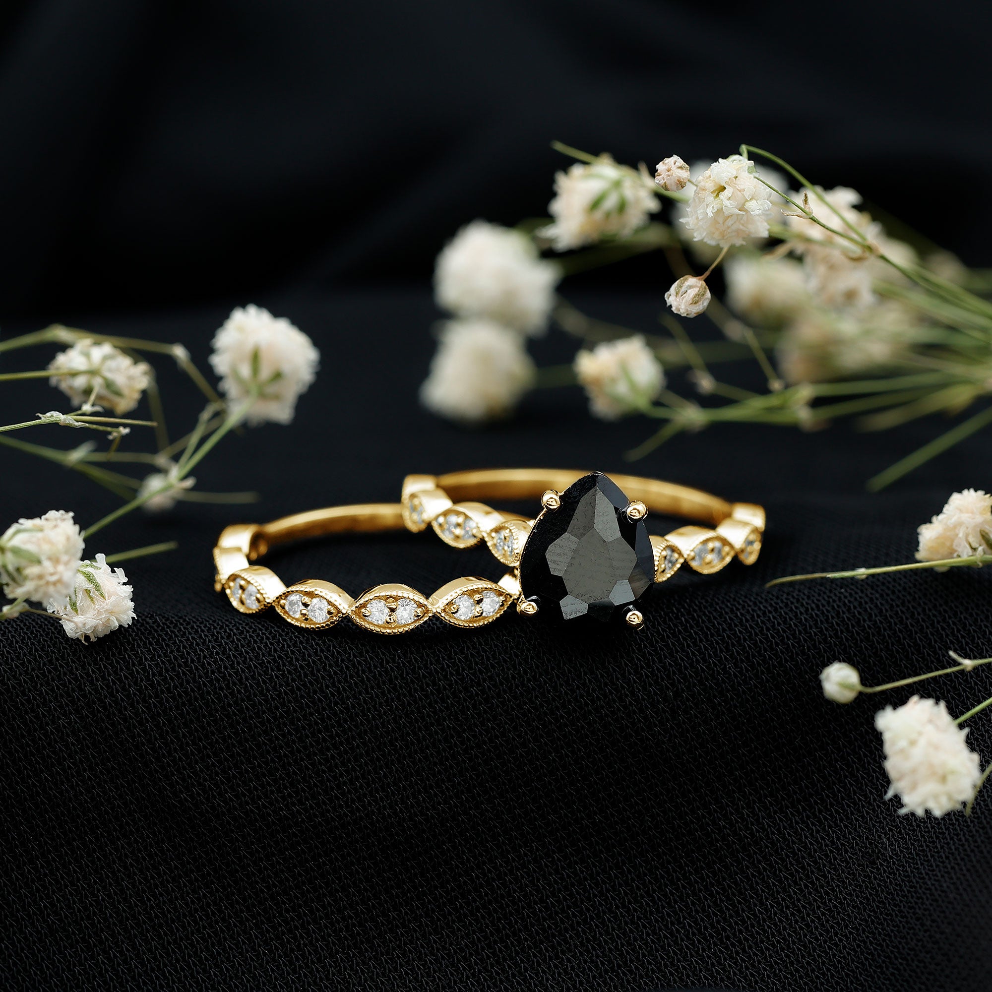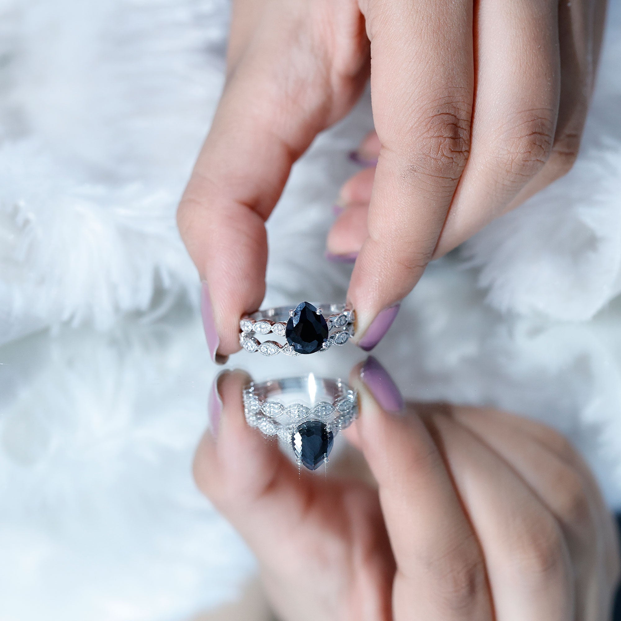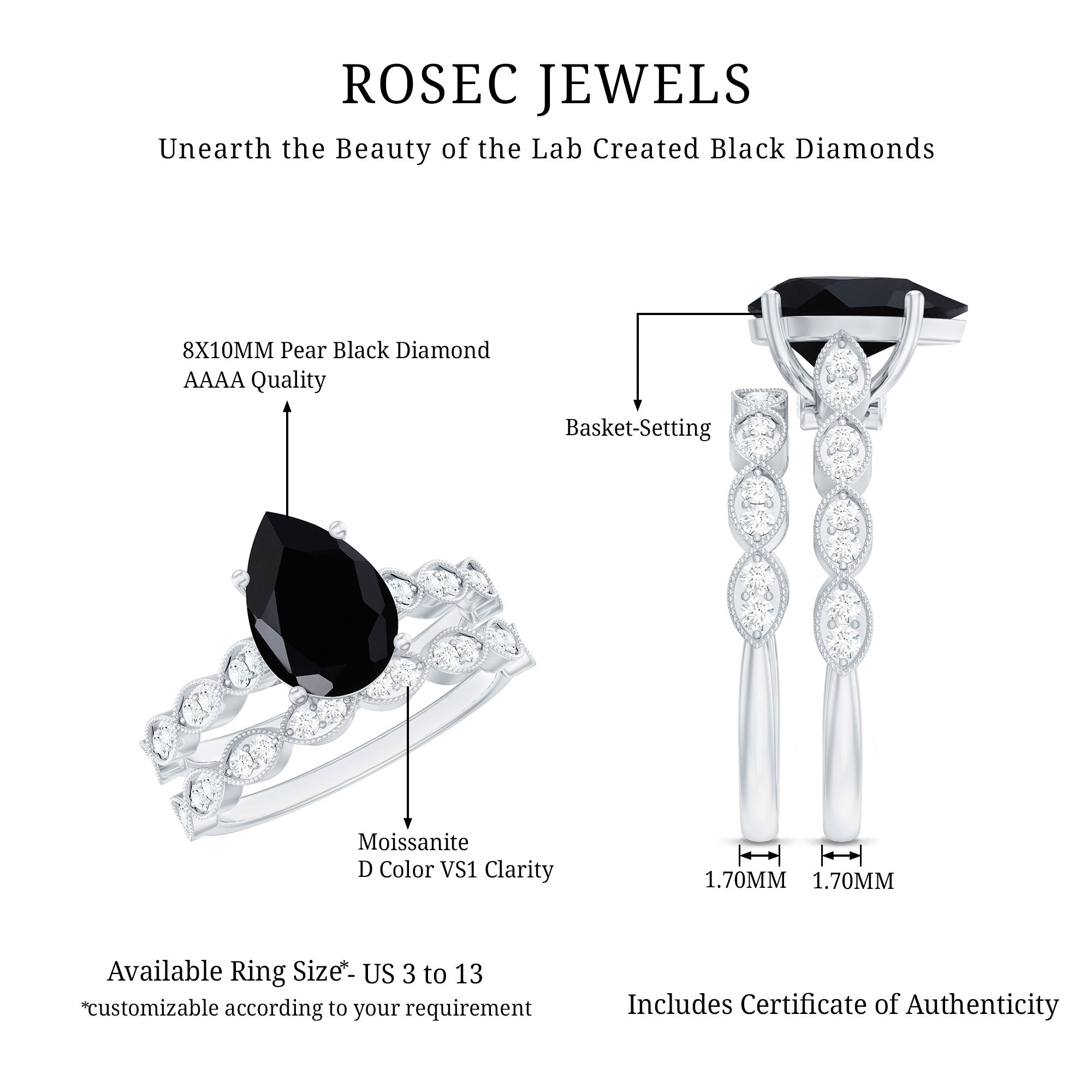 This Solitaire Engagement Ring is embellished with a Stunning Pear Cut Lab Created Black Diamond as Solitaire and Round Shape Moissanite in the Side Stone style and another ring has Round Moissanite set in Half Eternity Band. This gorgeous Bridal Ring Set will enhance your bridal look.
