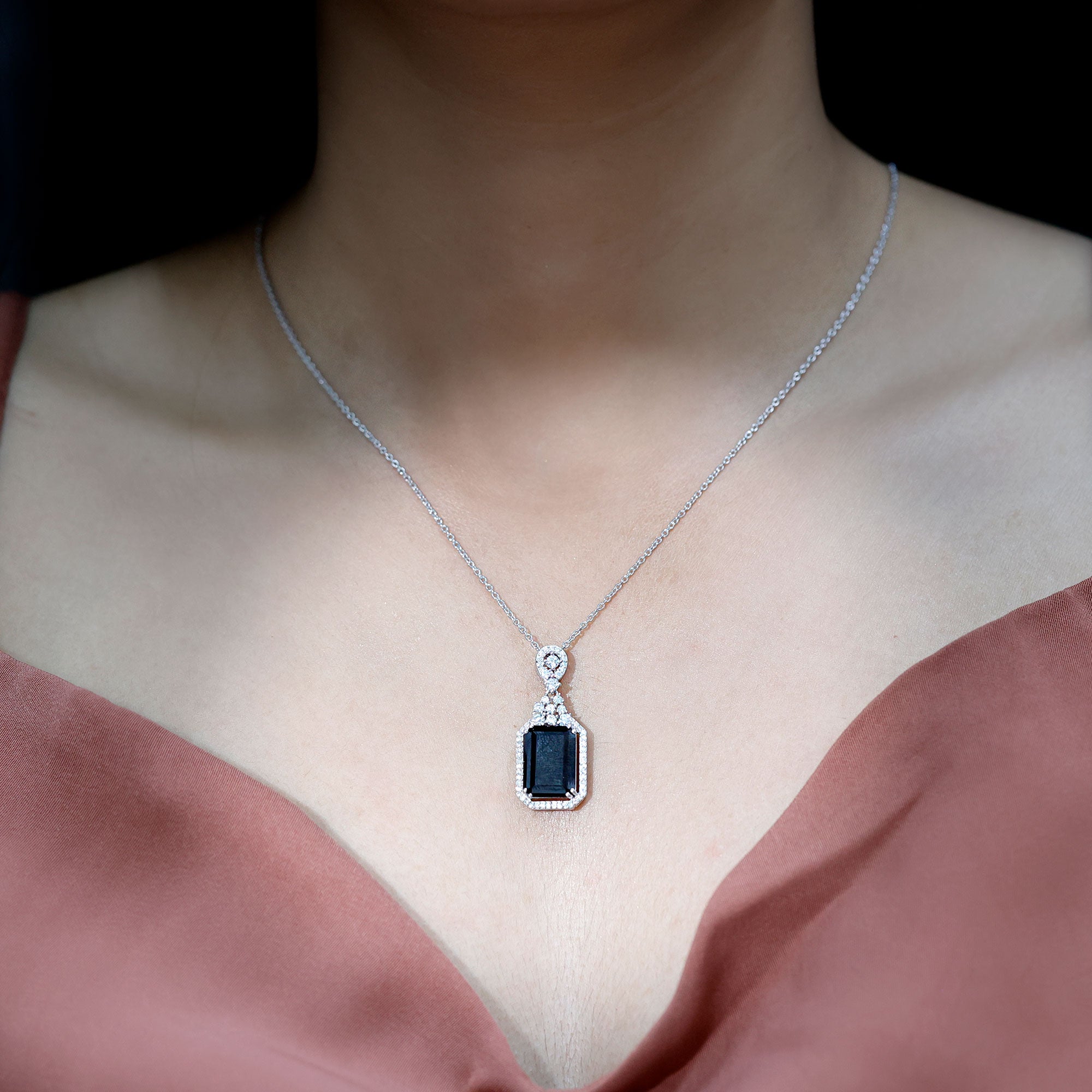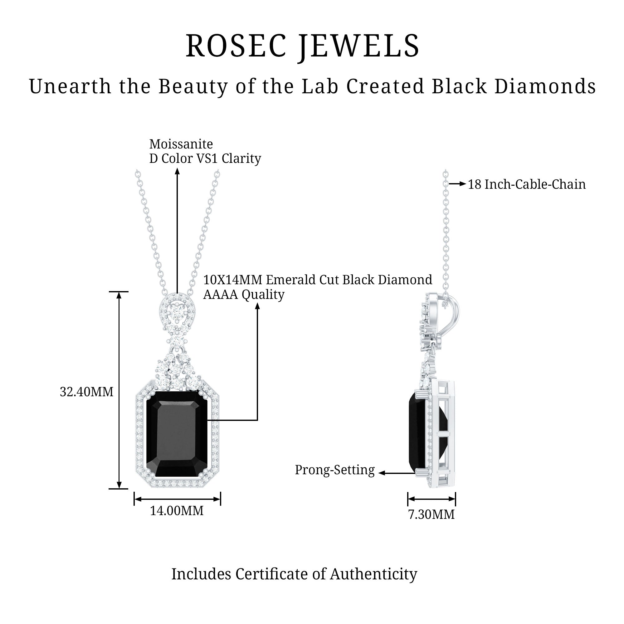 Reminding of the unique journey, this Lab Grown Black Diamond Necklace, encapsulates moments, emotions and aspirations. Crafted from White Gold Plated Silver, this Bridal Necklace is embellished with 10X14 MM Emerald Cut Lab Grown Black Diamond in Double Prong Setting with the Moissanite Halo. With Round brilliant cut Moissanite as a Cluster, sitting on top of the main gemstone, makes it a perfect Art Deco style piece of jewelry that is sure to make a statement. As a perfect show-stopping Emerald Cut Necklace, it has timeless elegance and vibrant allure. Having a bold design and simply captivating, this Wedding Necklace has unrivaled beauty that has stood the test of time, as a true symbol of elegance and everlasting love. The AAAA Quality Lab Grown Black Diamond and D-VS1 Quality Moissanite create a captivating contrast, evoking a sense of opulence and refined taste. With its captivating beauty and modern aesthetics, it will always hold a special place in her heart.