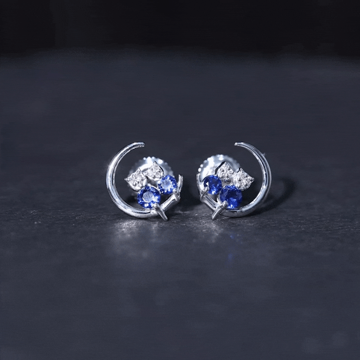 Lab Grown Blue Sapphire and Diamond Cat and Moon Stud Earrings