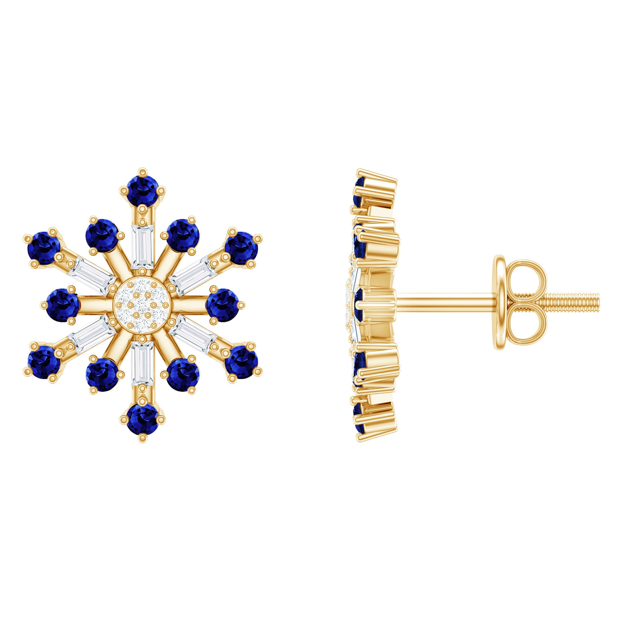 These Snowflake Stud Earrings is embellished with Round Shaped Lab Created Blue Sapphire with Round and Baguette Shape Diamond in Prong Setting.