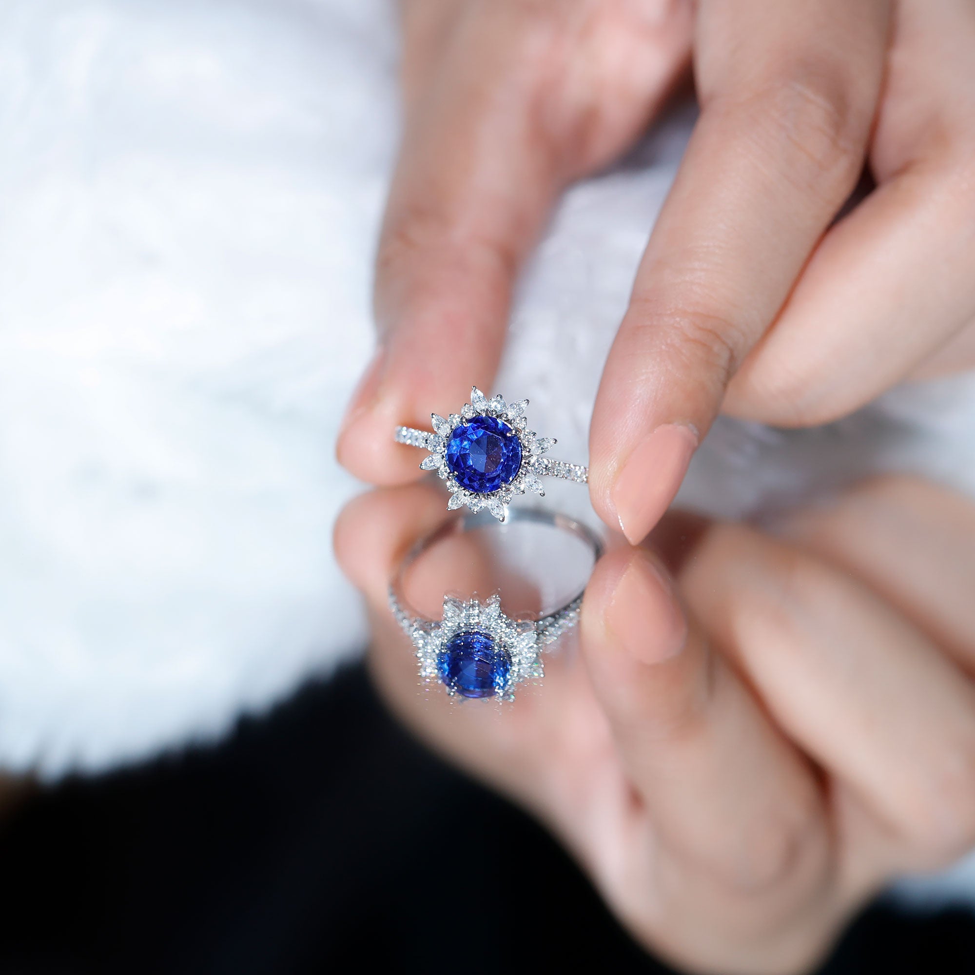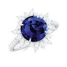 Transform your look into a diva when you wear this Blue Sapphire ring, designed just the way you wanted. The 8 mm round Lab Grown blue sapphire exquisitely set in claw setting surrounded by marquise and round moissanite as a halo. For an additional touch of sparkle the shank shimmers with moissanite making this sapphire ring a treasure piece. The blue sapphire ring also makes a perfect accessory for cocktail parties, date nights, evening parties or other special occasion as it matches a variety of style.