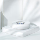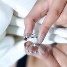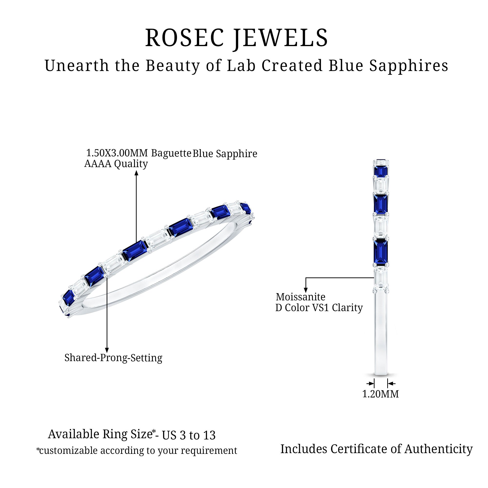 Designed with elegance, this Cultured Sapphire Band Ring is a trendy choice for casual outings. Baguette Cut Created Blue Sapphire and Moissanite stones adorn this Baguette Eternity Ring to create a charming appeal. This stackable band ring have a row of sparkling Lab Grown Sapphire and Moissanite. This Baguette Wedding Ring can be styled solely to achieve a classic look or can be worn as a stackable band with the engagement ring to get a statement look. The thin ring beholds the shimmer of AAAA quality Lab Grown Sapphire and D-VS1 Quality Moissanite.