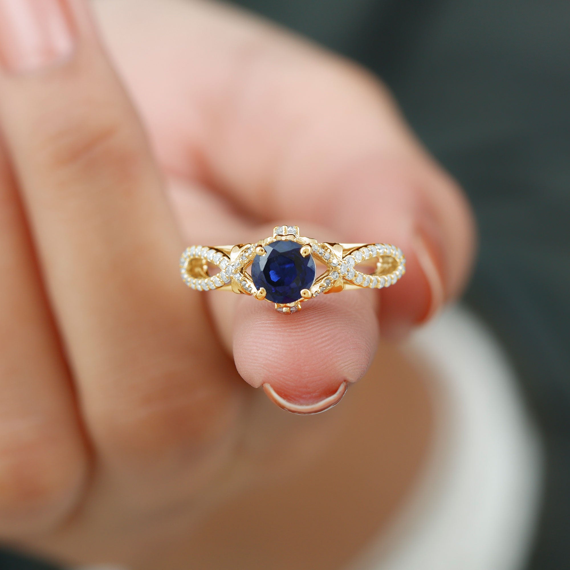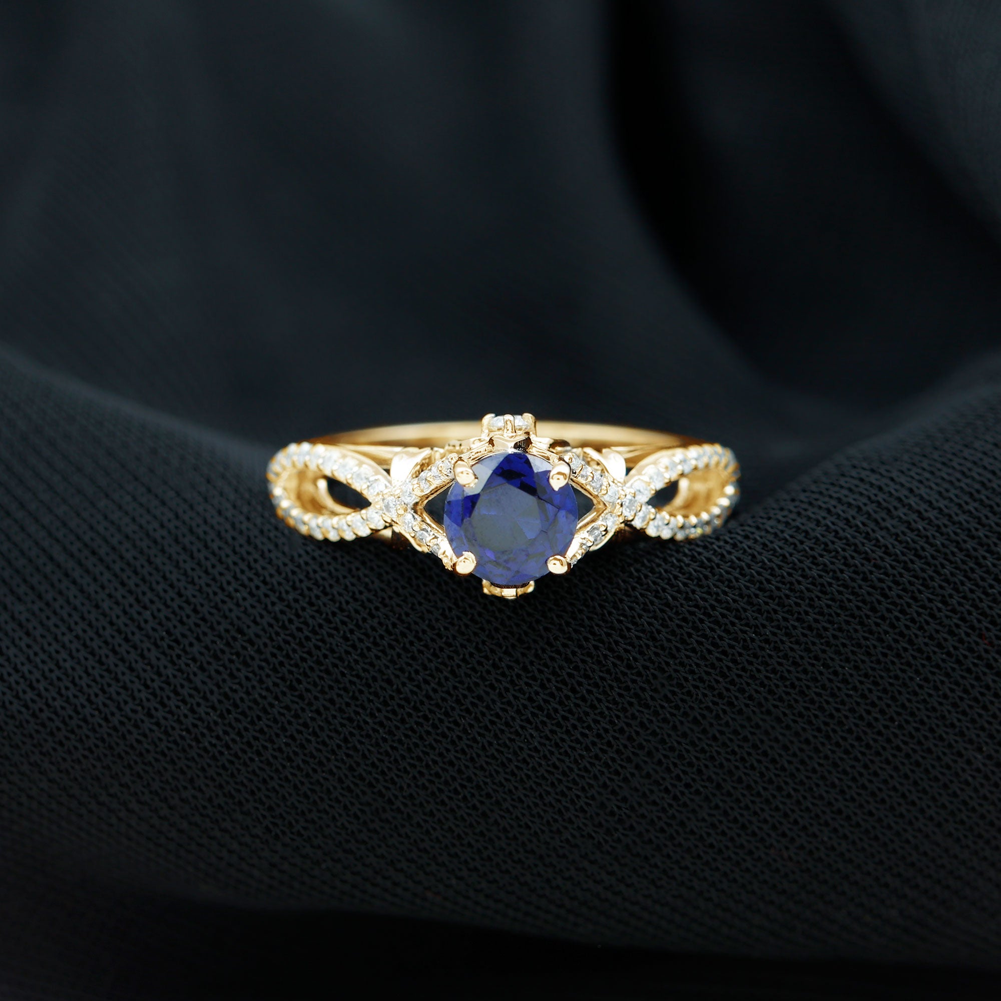 Elevate your style with a hint of enlightenment through this exquisite Lab Created Blue Sapphire Ring. This engagement ring is bound to set you apart in any setting. Showcasing a round shape lab created blue sapphire nestled in an elegant crossover shank decorated with Diamond stones, this ring becomes a perfect manifestation of your love and admiration for that exceptional woman in your life.