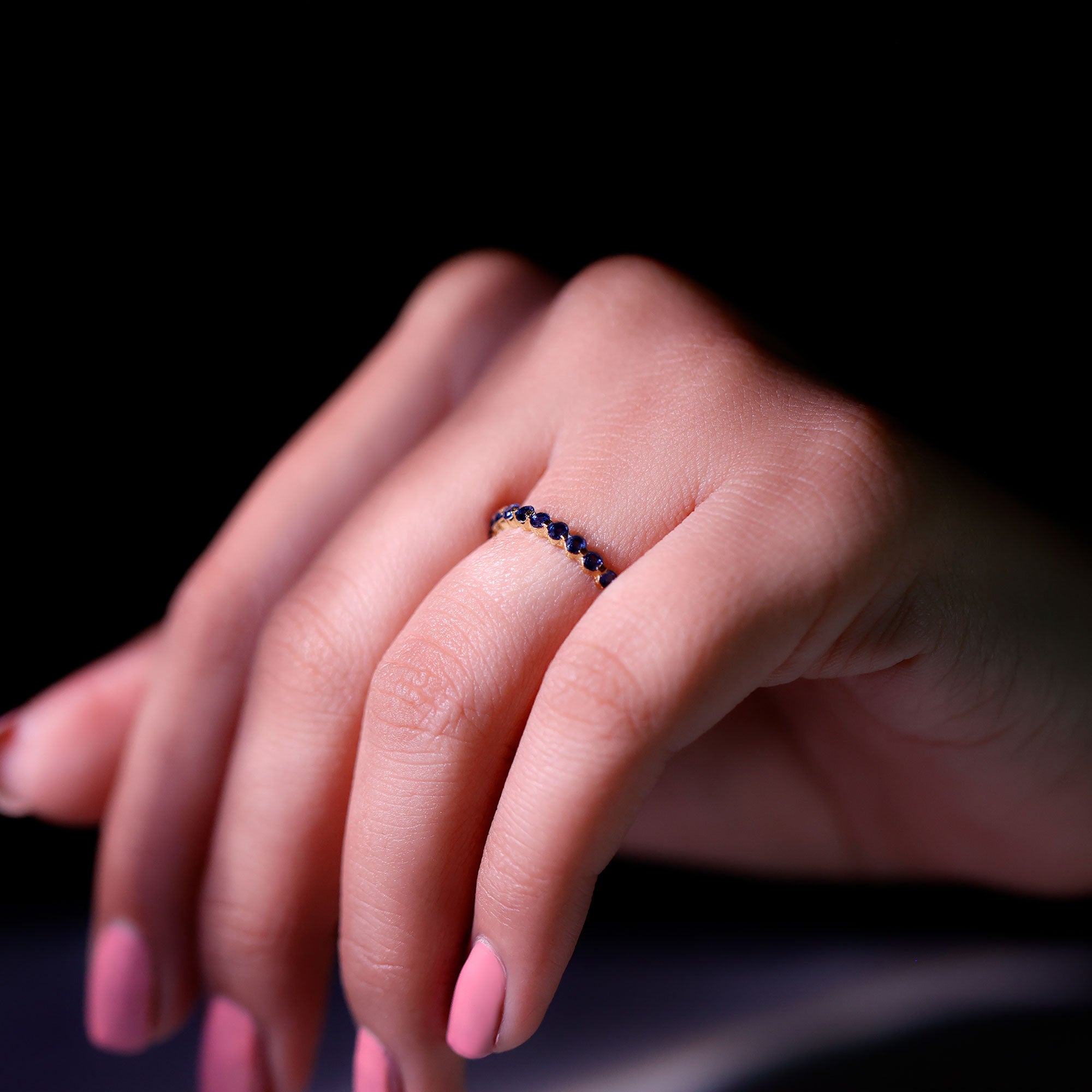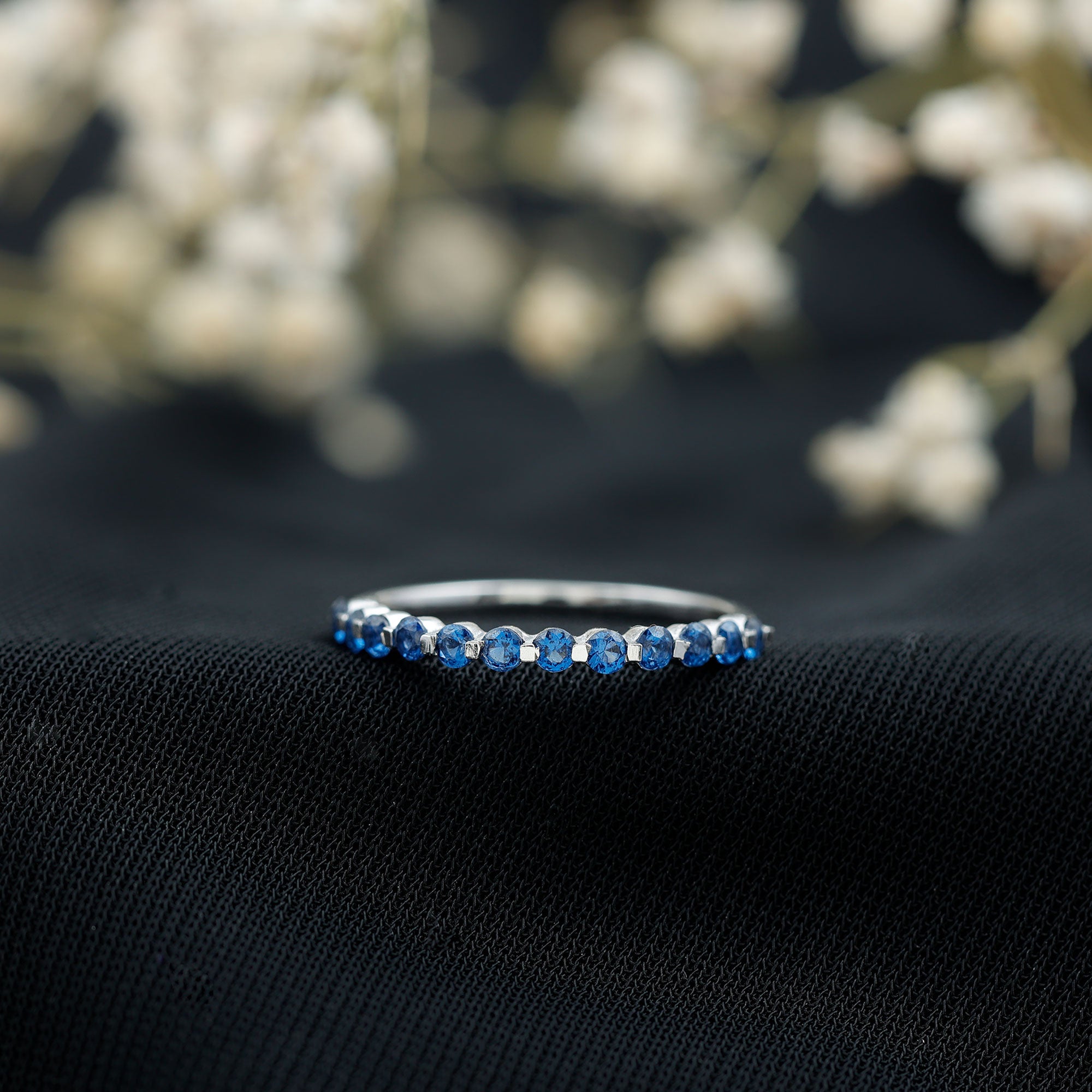 This stunning Half Eternity Band Ring is graced with the brilliance of Round Shape Created Blue Sapphire Gemstones, delicately placed along the band in a Floating Setting. Each gemstone appears to effortlessly float, creating a mesmerizing and elegant design.