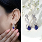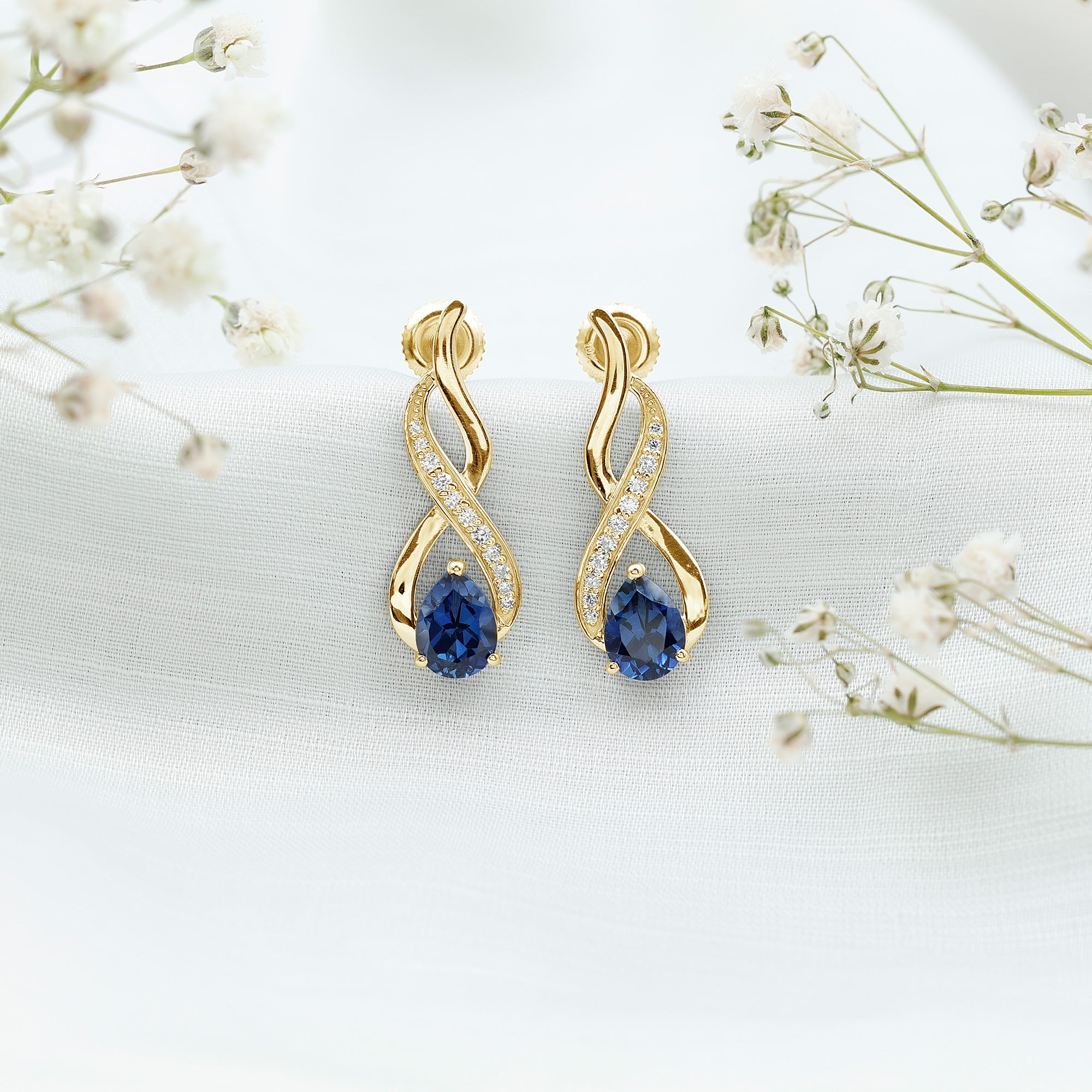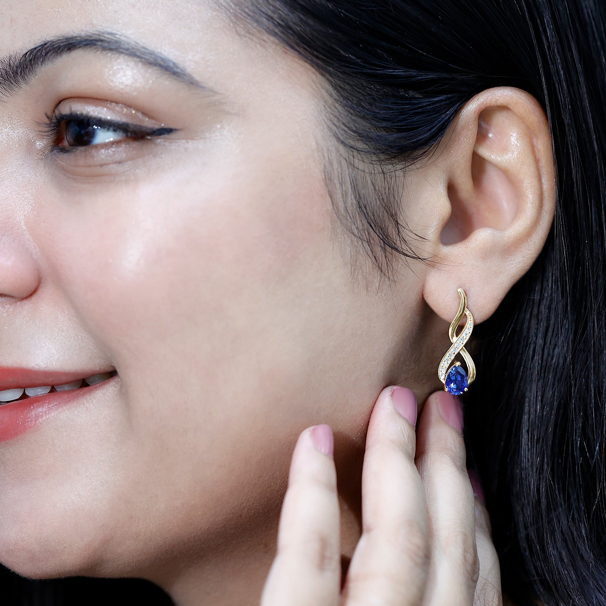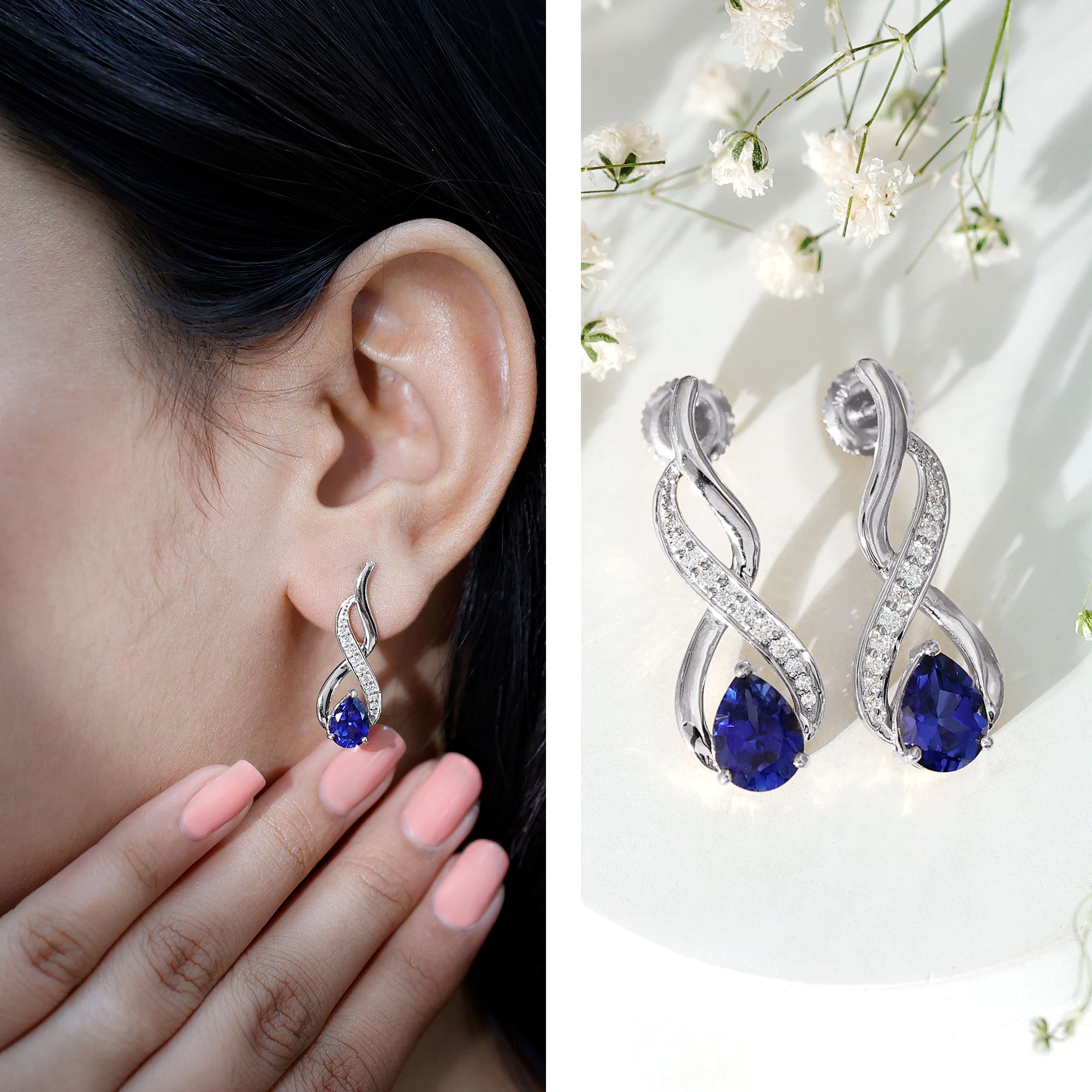 These captivating Sapphire Drop Earrings showcase timeless elegance with a modern twist. Crafted with perfection, they feature a 6x8 mm Pear Shape Blue Sapphire (Aaaa quality) set in a Prong Setting, highlighted by sparkling round shaped Lab Grown Diamond gemstones in an infinity sign, adding a touch of sophistication. Rosec Jewels Blue Sapphire Earrings come with a certificate of authenticity and a Screw Back Closure to ensure secure and comfortable wear. The overall appearance of these lab created Sapphire and Diamond Earrings is sophisticated and royal which makes them a perfect wedding anniversary gift. From Rosec Jewels, synonymous with quality and innovation, experience the epitome of refined beauty.