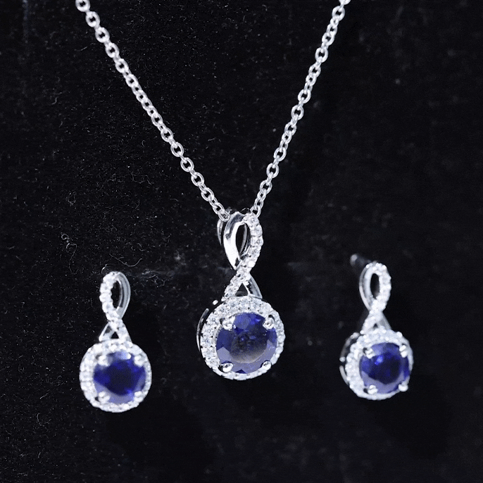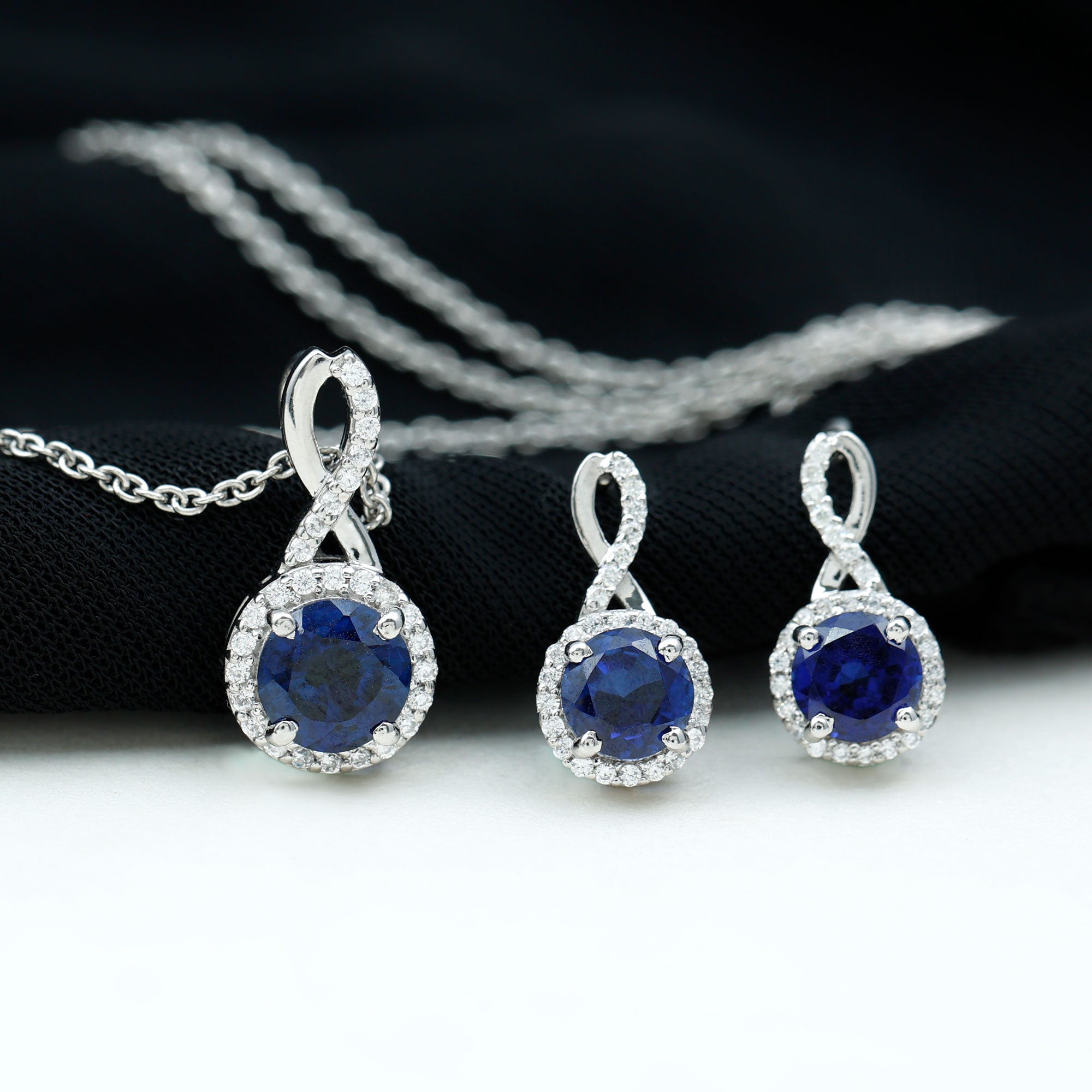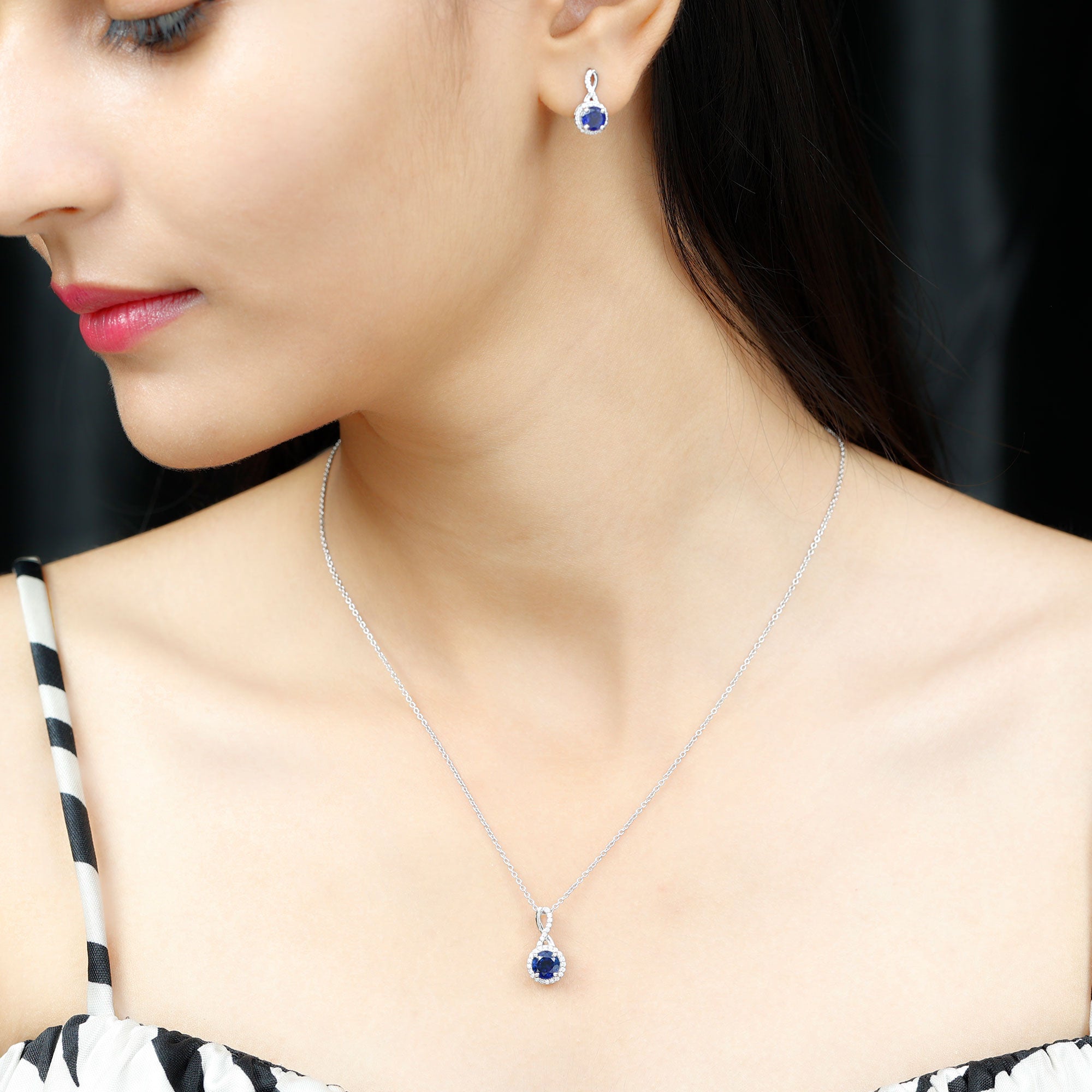 Lab Grown Blue Sapphire Infinity Jewelry Set with Moissanite is the perfect piece of jewelry for any occasion. This stunning jewelry set features a 6X6 mm blue sapphire center stone in the necklace surrounded with sparkling Moissanite overlapping to infinity symbol. The set includes a stud earring with 5X5 mm blue sapphire center stone surrounded by Moissanite. The infinity symbol represents eternal love and commitment.
