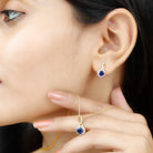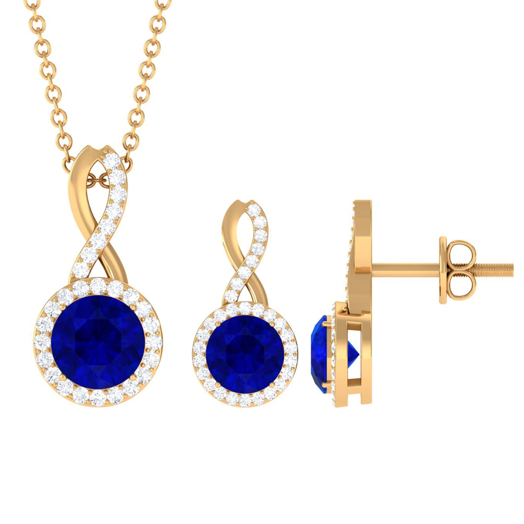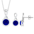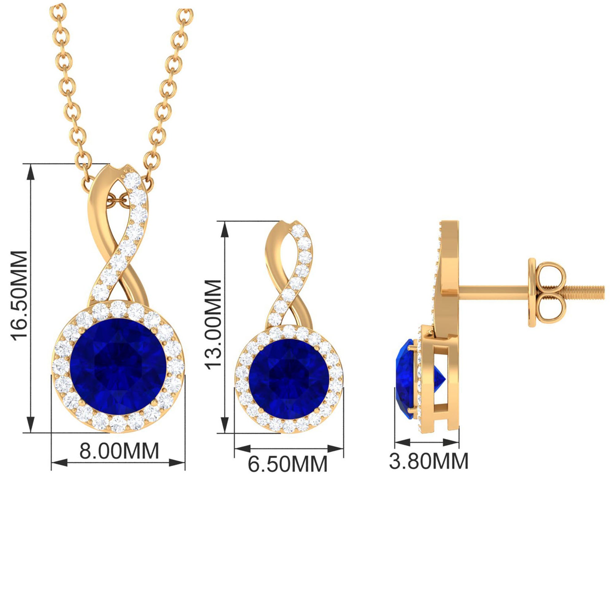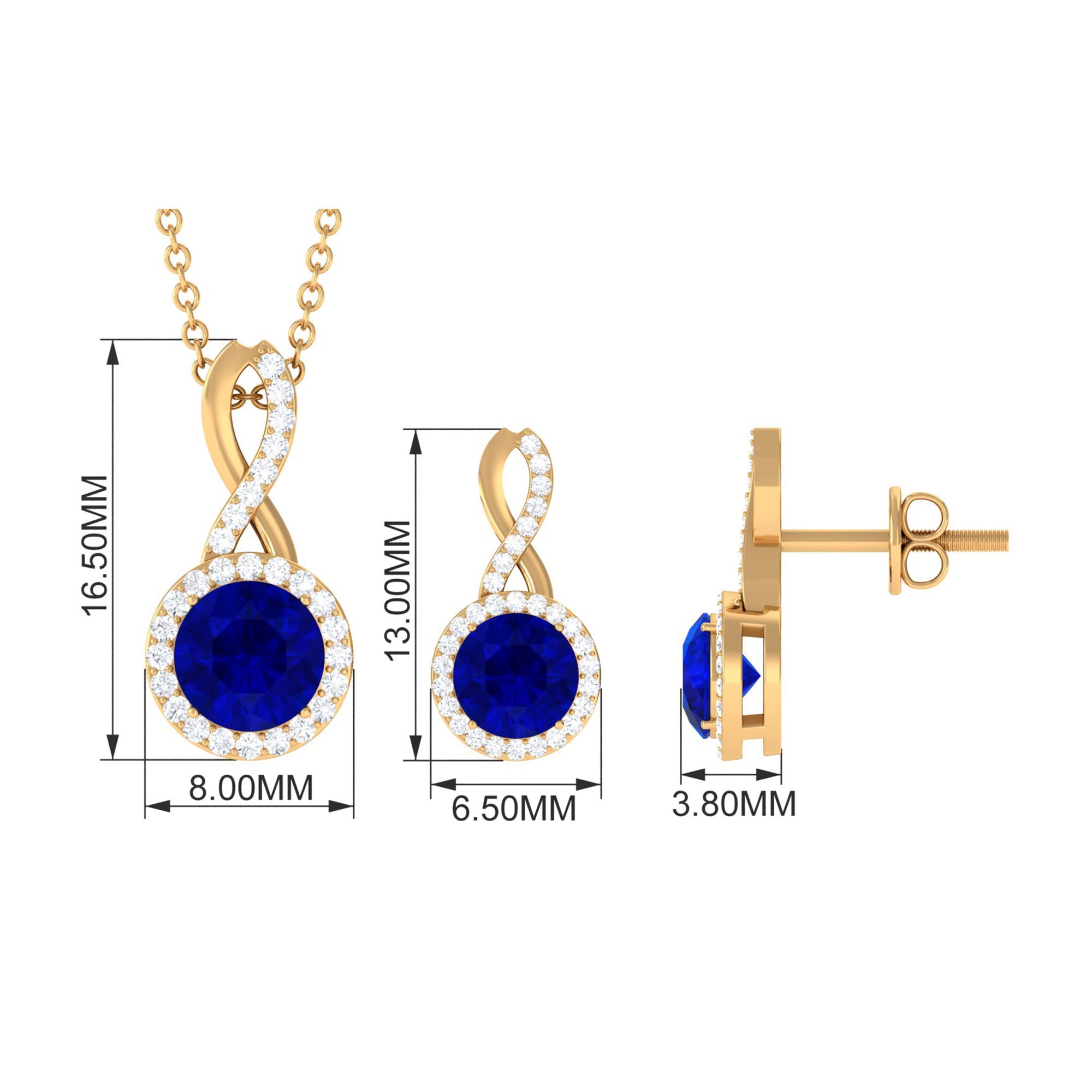 Lab Grown Blue Sapphire Infinity Jewelry Set with Moissanite is the perfect piece of jewelry for any occasion. This stunning jewelry set features a 6X6 mm blue sapphire center stone in the necklace surrounded with sparkling Moissanite overlapping to infinity symbol. The set includes a stud earring with 5X5 mm blue sapphire center stone surrounded by Moissanite. The infinity symbol represents eternal love and commitment.