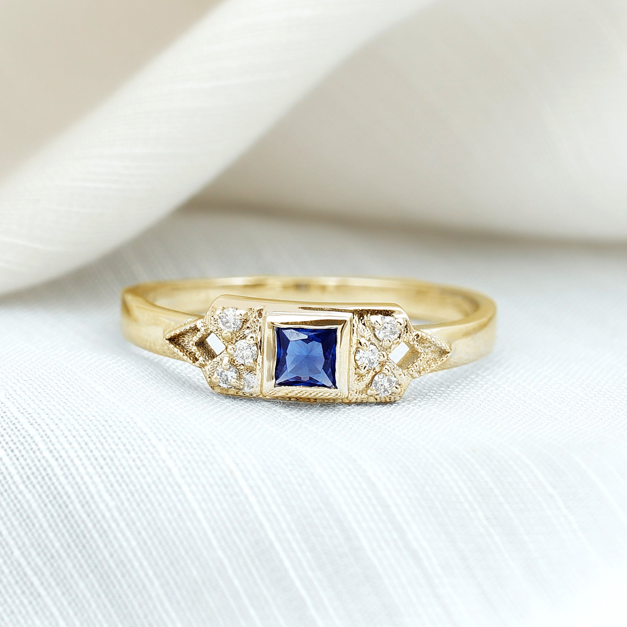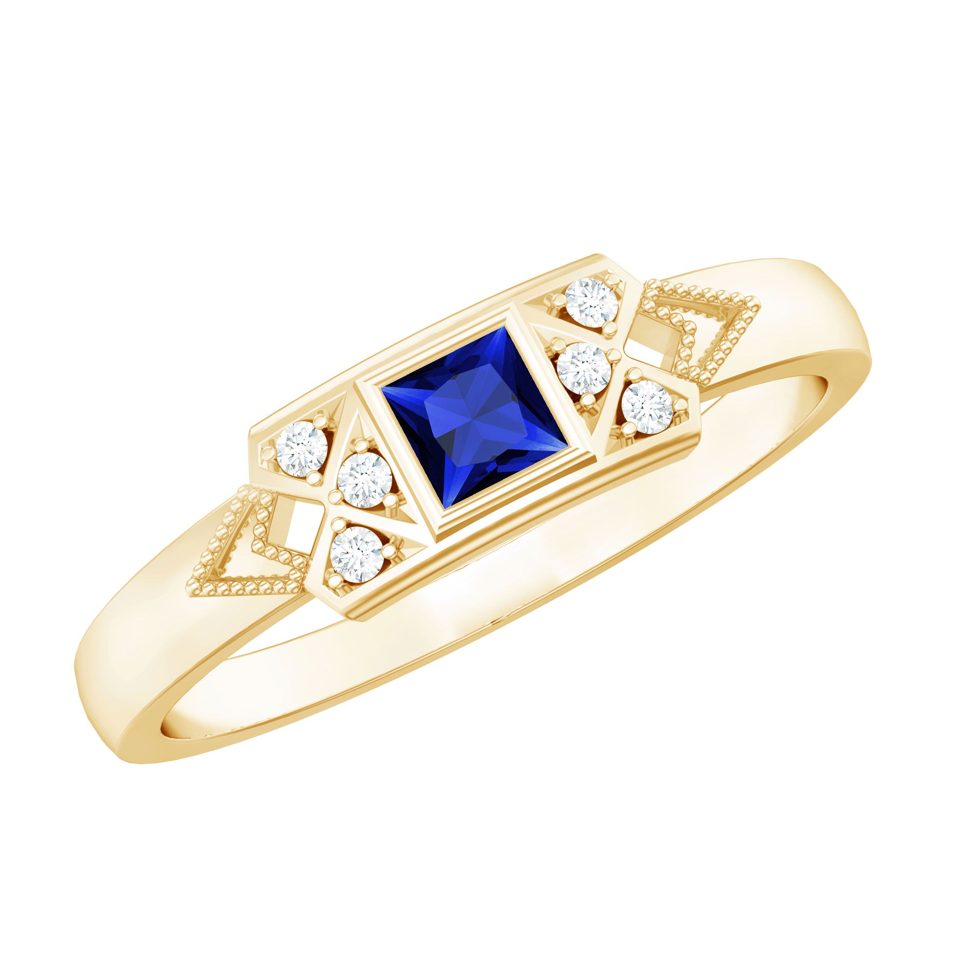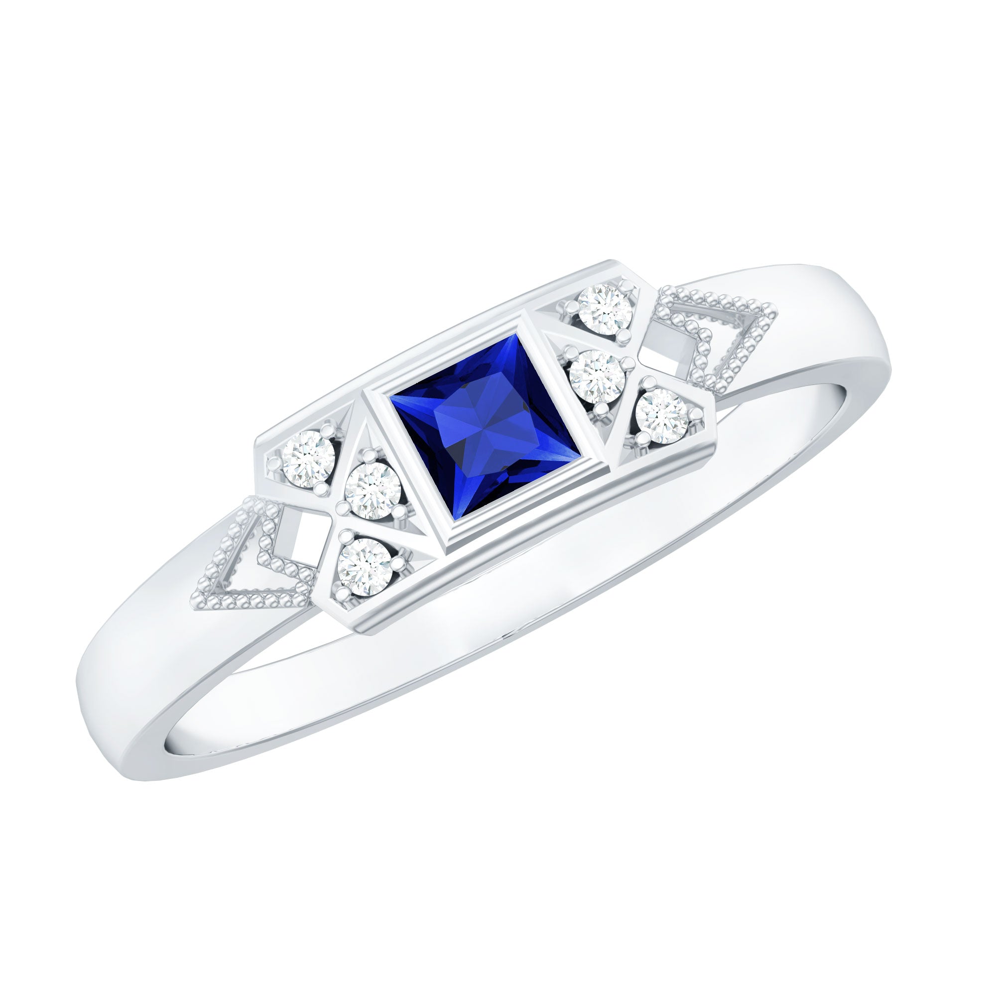 The timeless Unisex Promise Ring showcases a princess cut Lab Created Blue Sapphire, elegantly placed in a bezel setting, flanked by Round Shape Diamond gemstones in a prong setting. This exquisite Lab Grown Blue Sapphire Ring designed for women offers a range of metal options, adding to its versatility and charm.