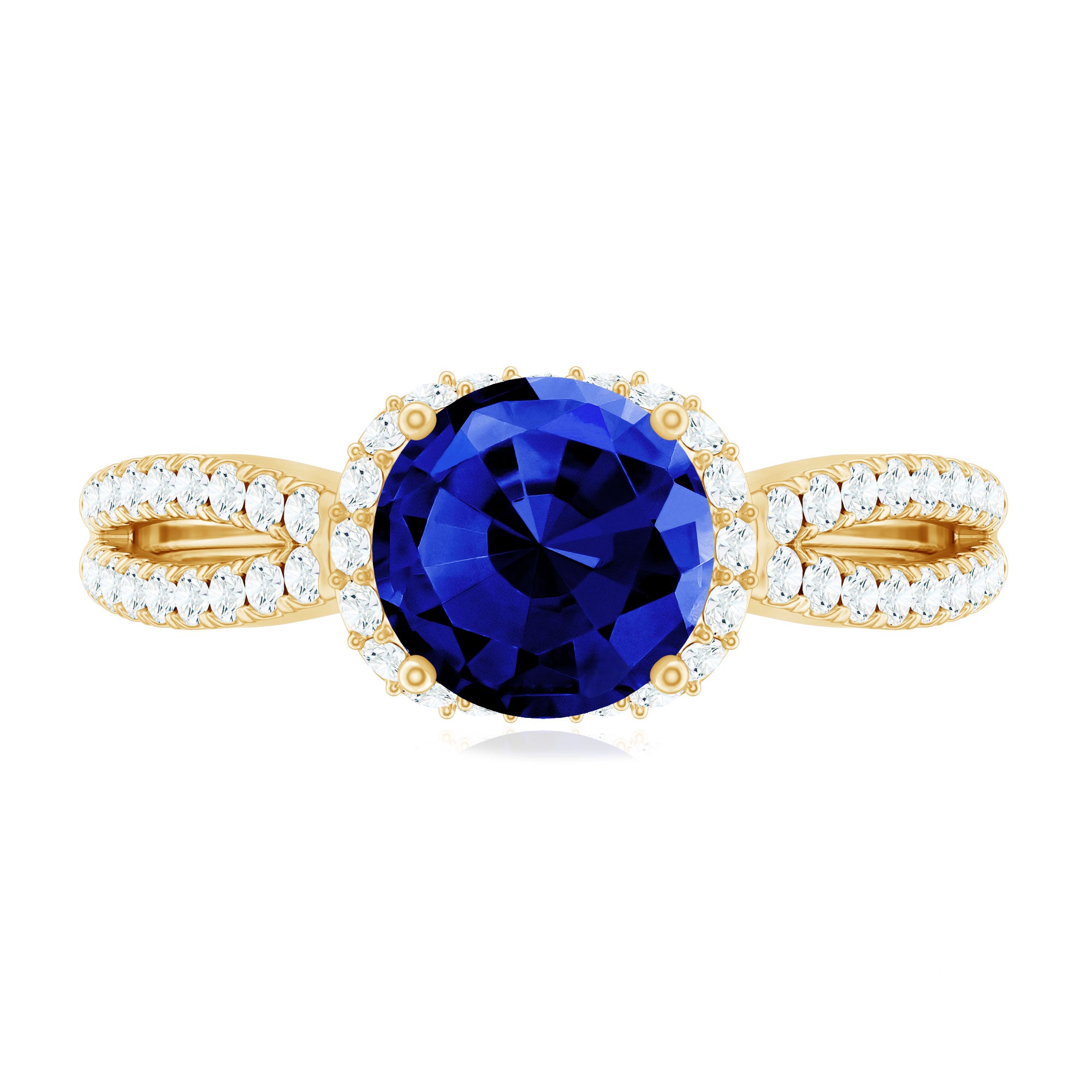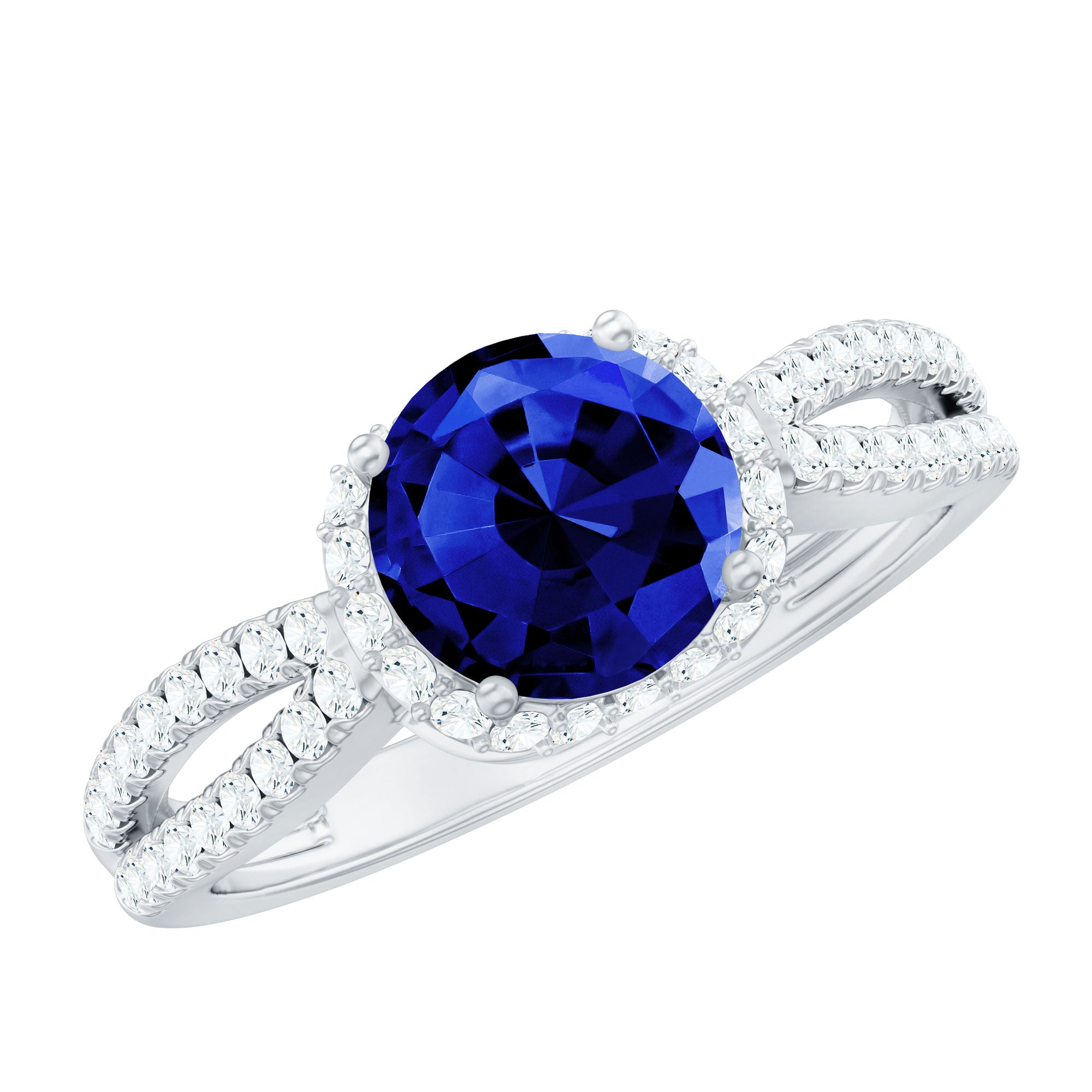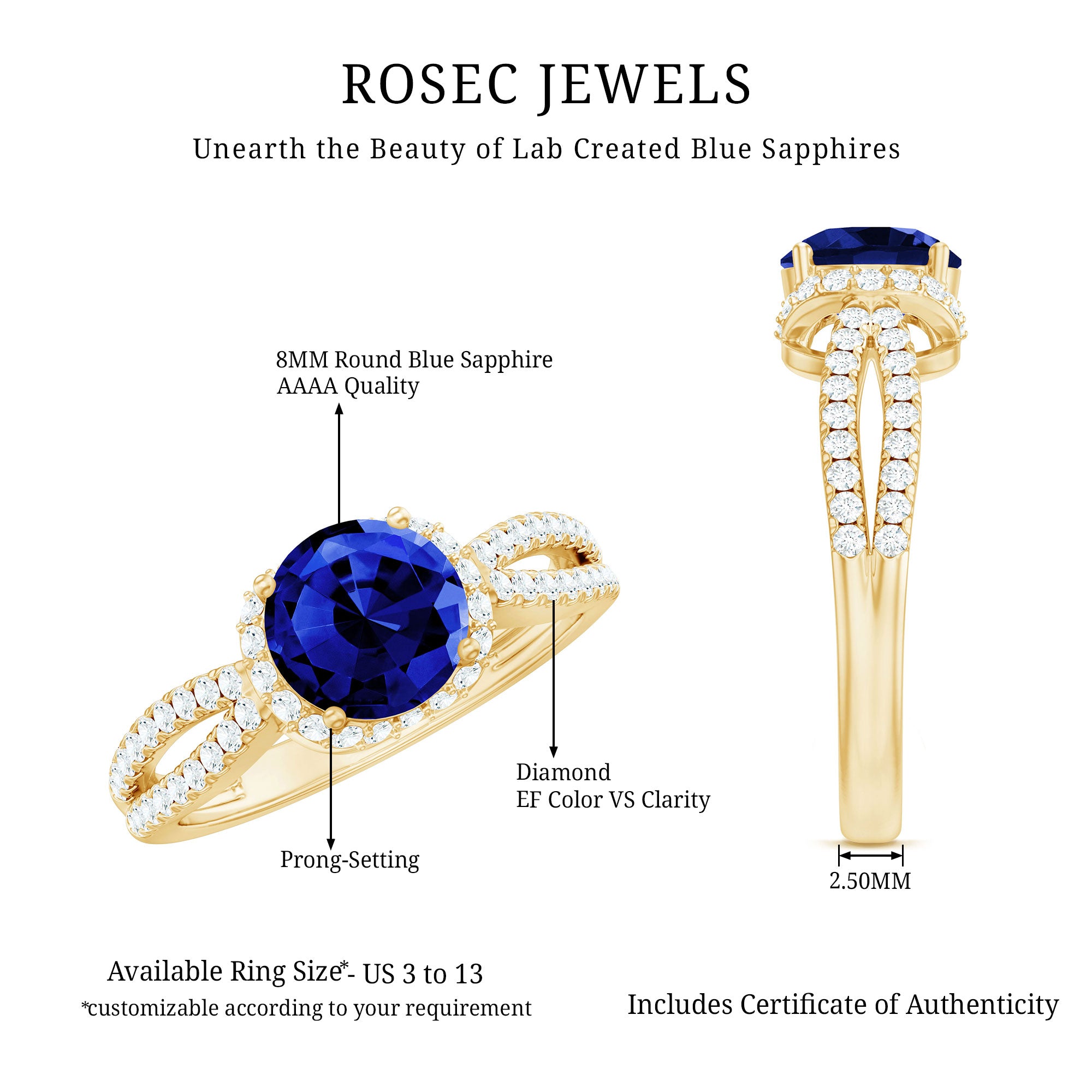 Add a royal touch to your love story with this mesmerizing Engagement Ring featuring a 8 mm Round Shape Created Blue Sapphire set in Prong Setting, surrounded by sparkling Diamond gemstones set in Collar Design, creating a mesmerizing sparkle. Meticulously crafted, this Blue Sapphire Diamond Ring (Simulated) embodies sophistication, a symbol of love that aligns with your values. From Rosec Jewels known for ethical luxury, embrace a commitment as beautiful as this Sapphire Diamond Ring itself.