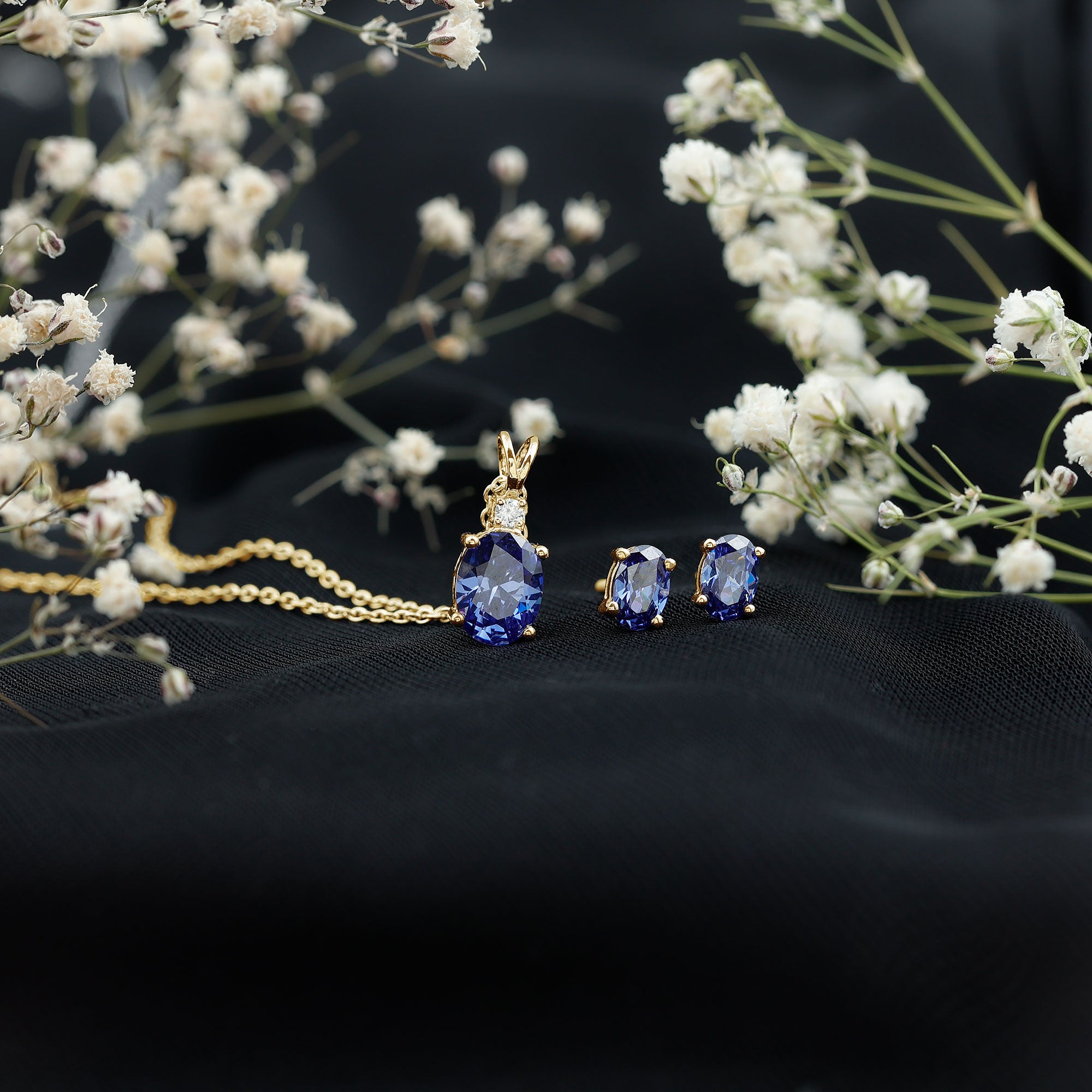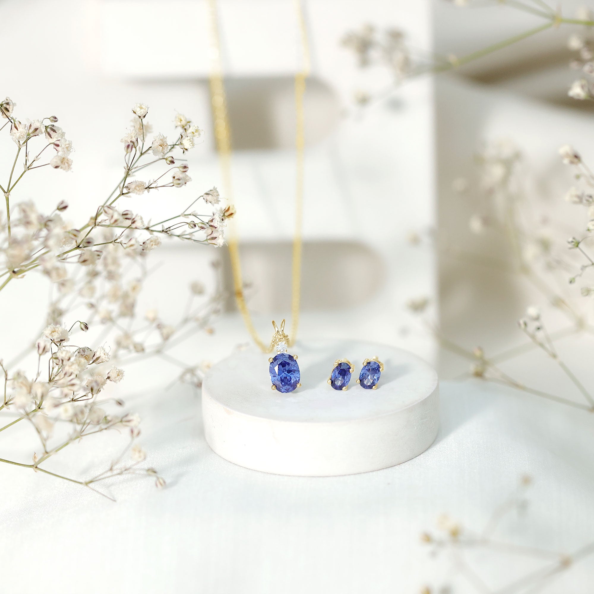 Add a touch of timeless beauty to your look with this stunning Blue Sapphire Necklace and Earrings Set. The Sapphire Jewelry Set includes a necklace and a pair of matching earrings, both crafted with care and attention to detail. The necklace features a beautiful 6X8 MM oval cut lab created blue sapphire as the center stone, topped with a sparkling moissanite. The pendant hangs gracefully from a rabbit ear bail on a classic cable chain, creating a delicate and elegant look. The stud earrings match perfectly with the necklace, each featuring a 4X6 MM oval cut lab created blue sapphire held securely in prong setting. The screw-back closures keep them comfortable and safe for all-day wear. Each stone in this Oval Pendant and Earrings is carefully chosen for its bright color, clarity, and sparkle. This Blue Sapphire and Moissanite Jewelry Set makes a thoughtful gift for birthdays, anniversaries, or any moment you want to make special. Elegant and versatile, it is a piece that will be treasured for years to come, a perfect blend of modern luxury and classic charm.