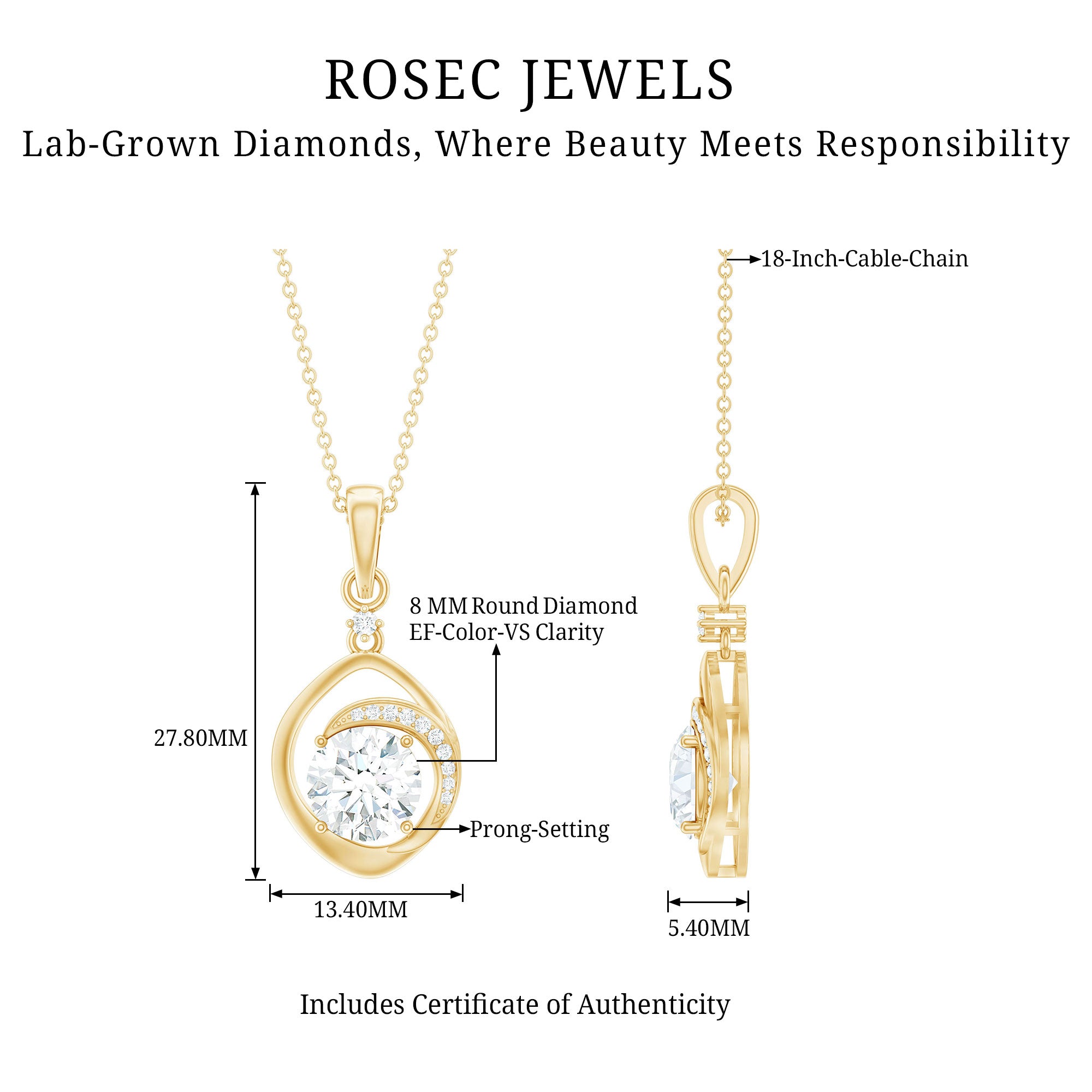 Discover the captivating glow of this sophisticated Lab Grown Diamond Solitaire Pendant. It artfully merges the sparkle of diamond gemstones with the allure of polished metal, making it an ideal accessory for any special event or a stylish everyday piece. The exquisite 8 MM Round Shape Lab Grown Diamond is securely set in prong setting as the centerpiece, accentuated by delicate smaller gemstones. This Diamond Pendant Necklace showcases your exceptional taste. Our Round Pendant Necklace is perfect for gifting on special occasions such as Valentines Day, Anniversaries, Birthdays, New Year, Christmas, and many more.