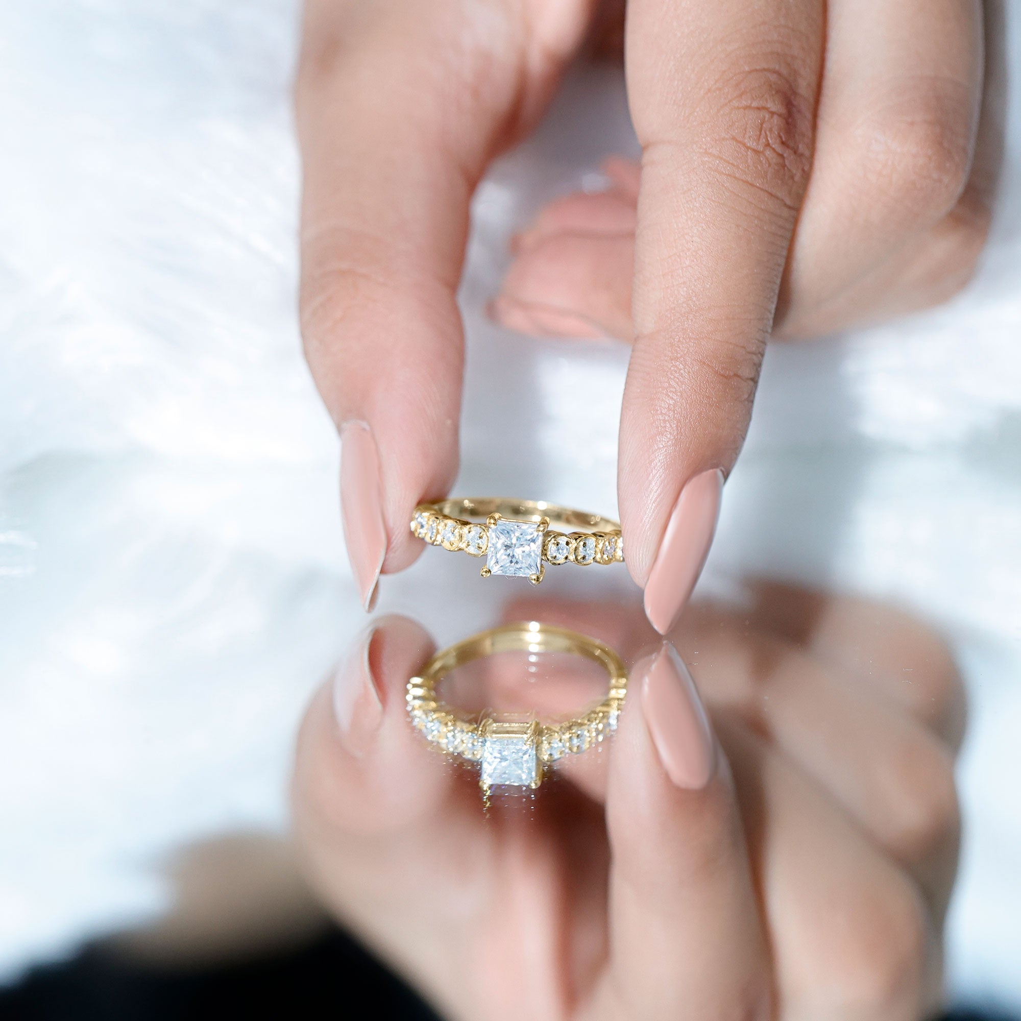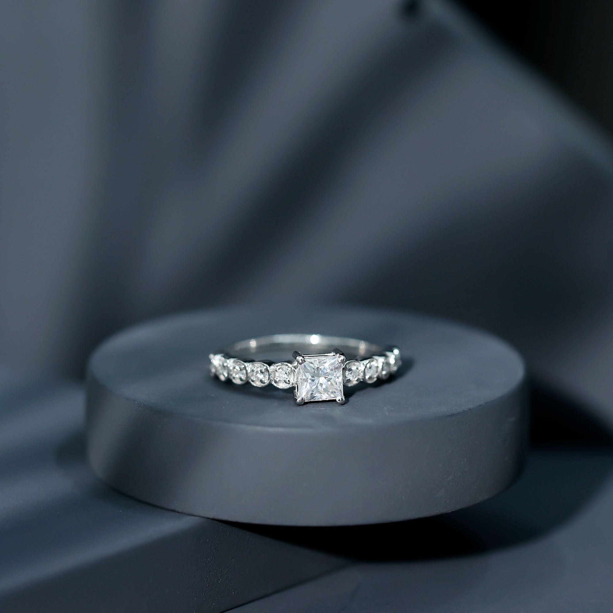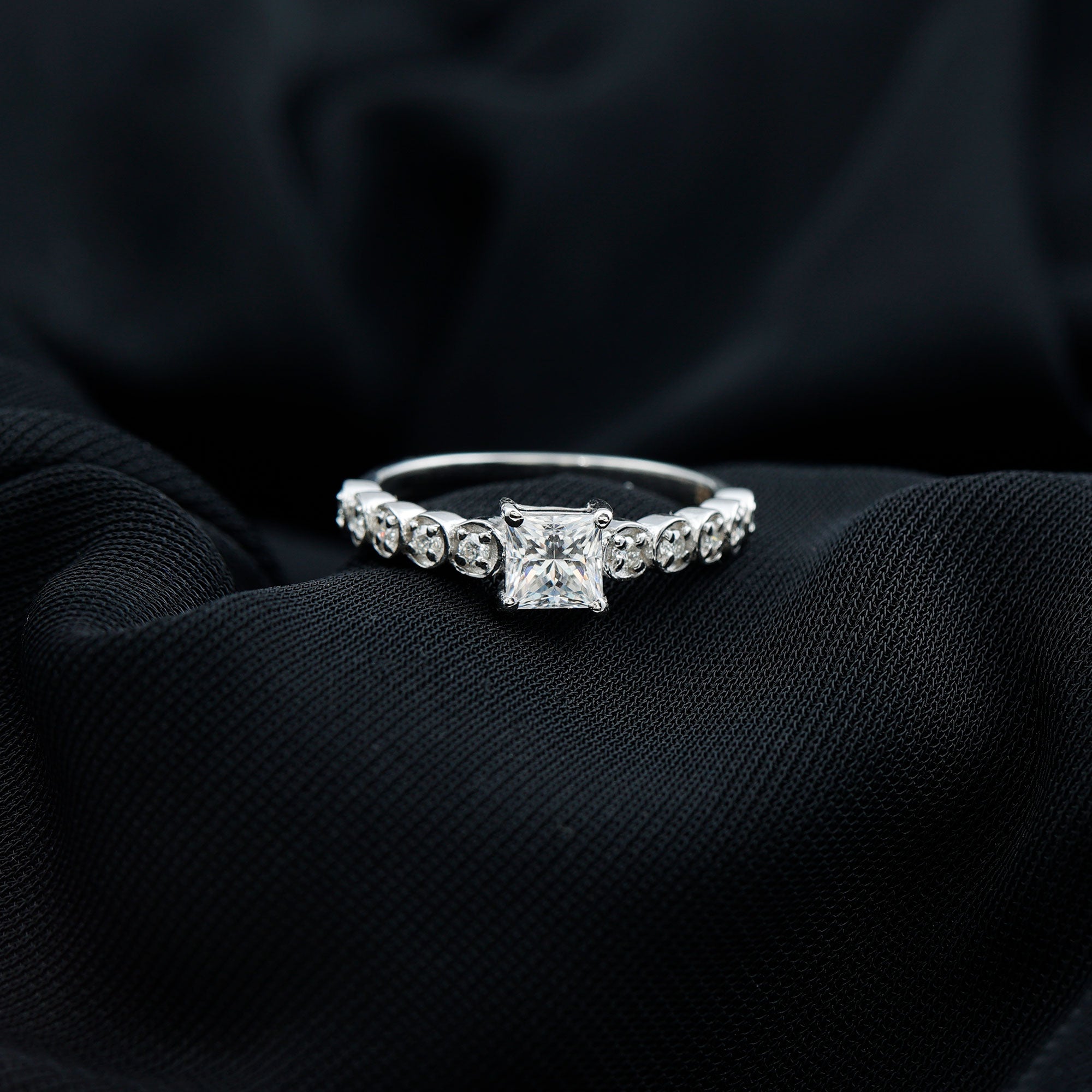 Lock her in your love with a Diamond Proposal Ring that shines as bright as your feelings for her. This elegant Solitaire Engagement Ring features a princess cut lab grown diamond of EF-VS quality in the center, held securely in a 4 prong setting. On either side of the focal stone, a series of round cut diamonds are set individually within a circular frame. This 1 ct Princess Cut Diamond Ring beautifully combines timeless beauty with contemporary artistry, making it an ideal choice for your big day. Your purchase also includes a certificate of guarantee for quality assurance and comes in a chic, protective box packaging, ideal for gifting or safe storage when not in use.