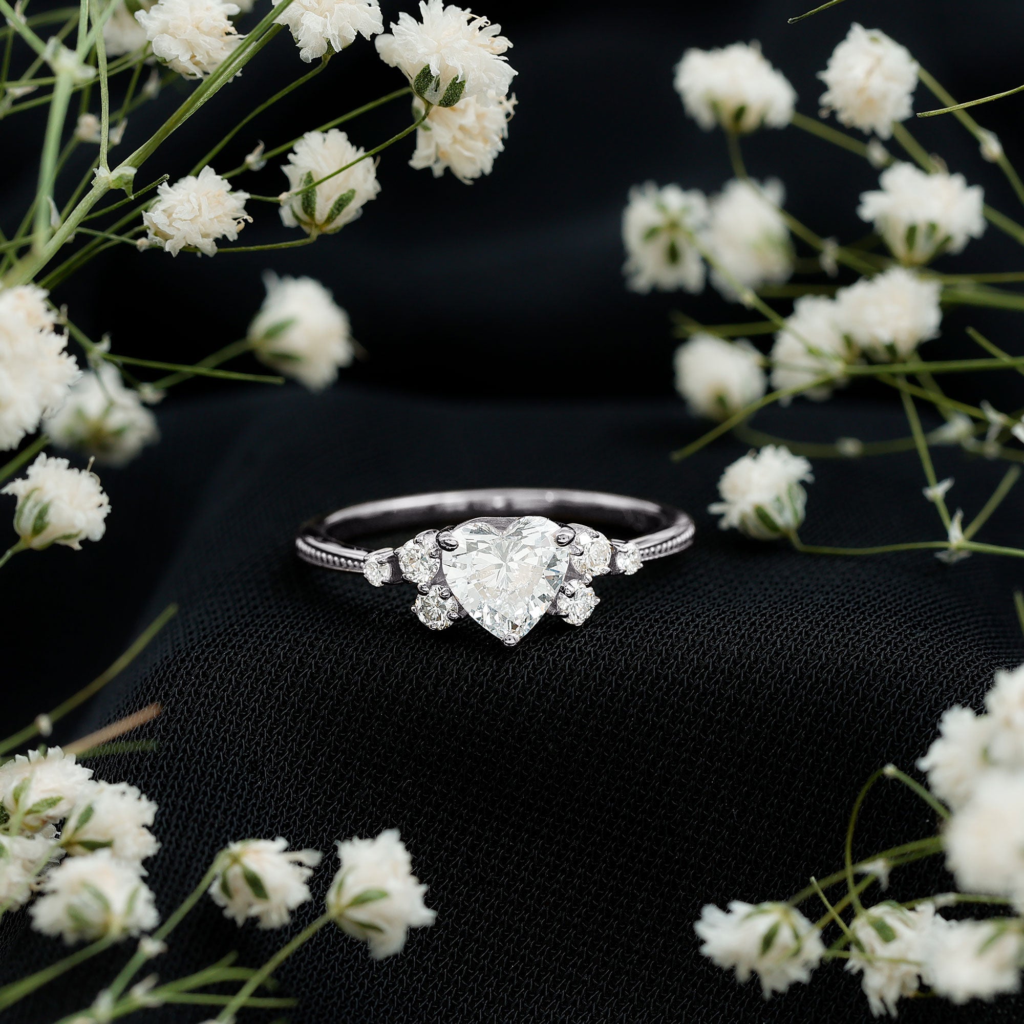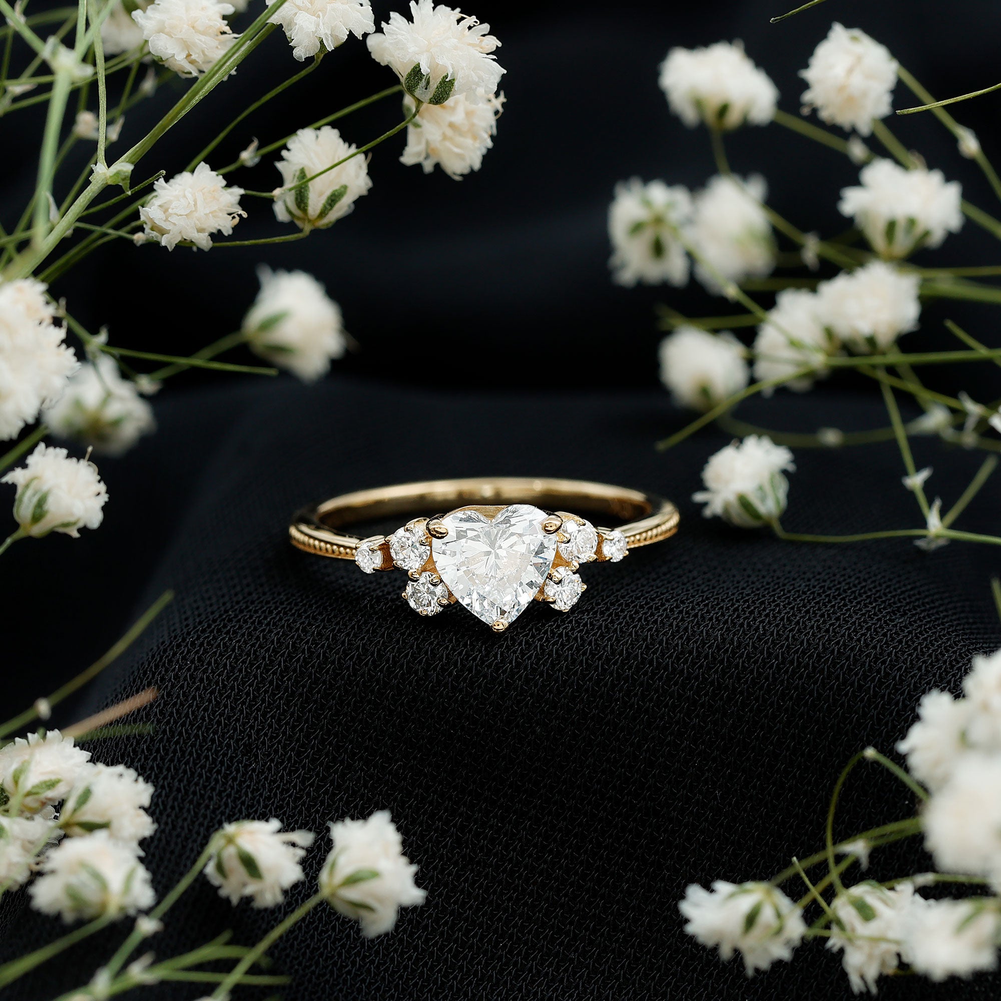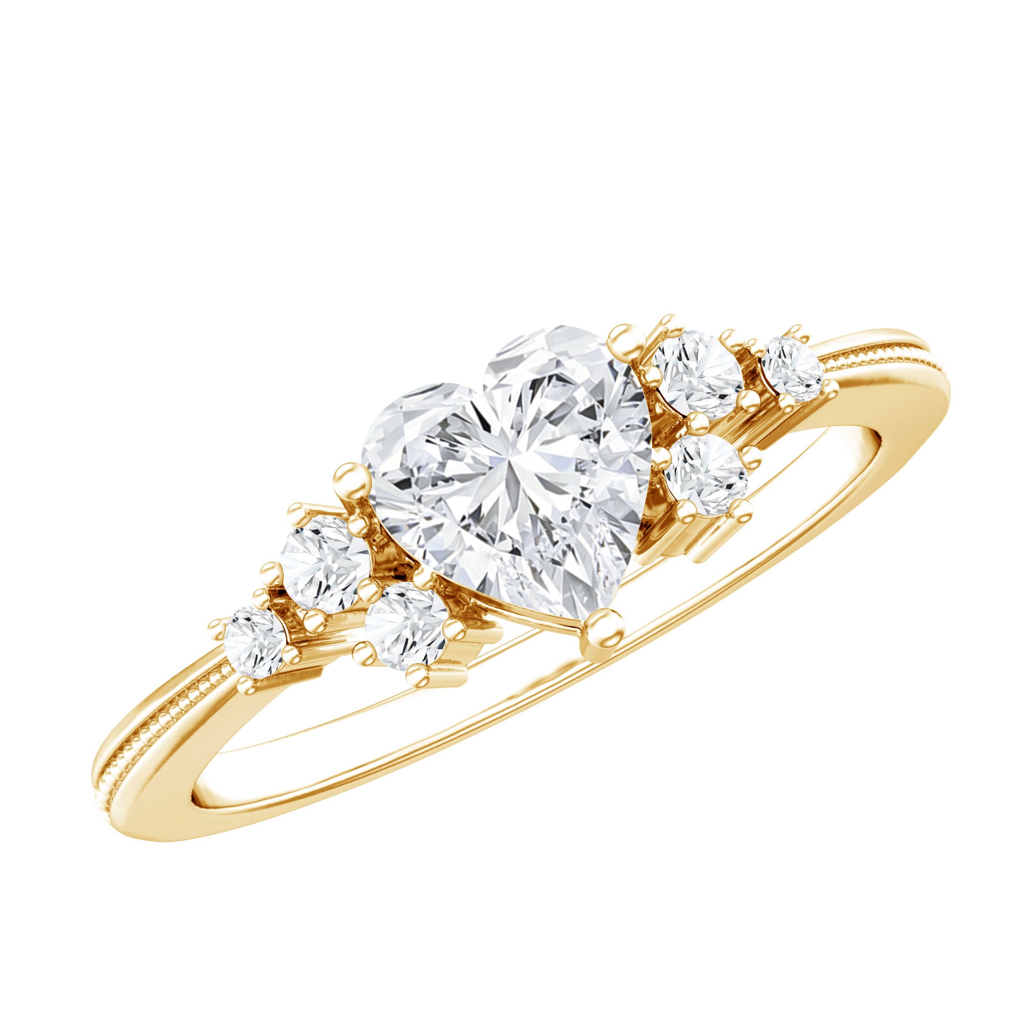 Seal the deal with a Heart Diamond Ring that screams passion, romance, and happily ever after. This Promise Engagement Ring is designed with lab grown gemstone, a 6 MM heart shape diamond is set in the center with a scattered cluster of smaller round stones on either side, arranged like tiny twinkling stars. The prong set stones and slim band with beaded detailing give the Diamond Proposal Ring a touch of old-world charm and add a unique flair to the overall design. Whether you are proposing, celebrating a milestone, or simply making a grand gesture, this Heart Engagement Ring is one shell never forget. No matter what youre celebrating, a glamorous evening dinner, or a festive celebration, this Gemstone Ring will ensure that she shines with confidence and style.