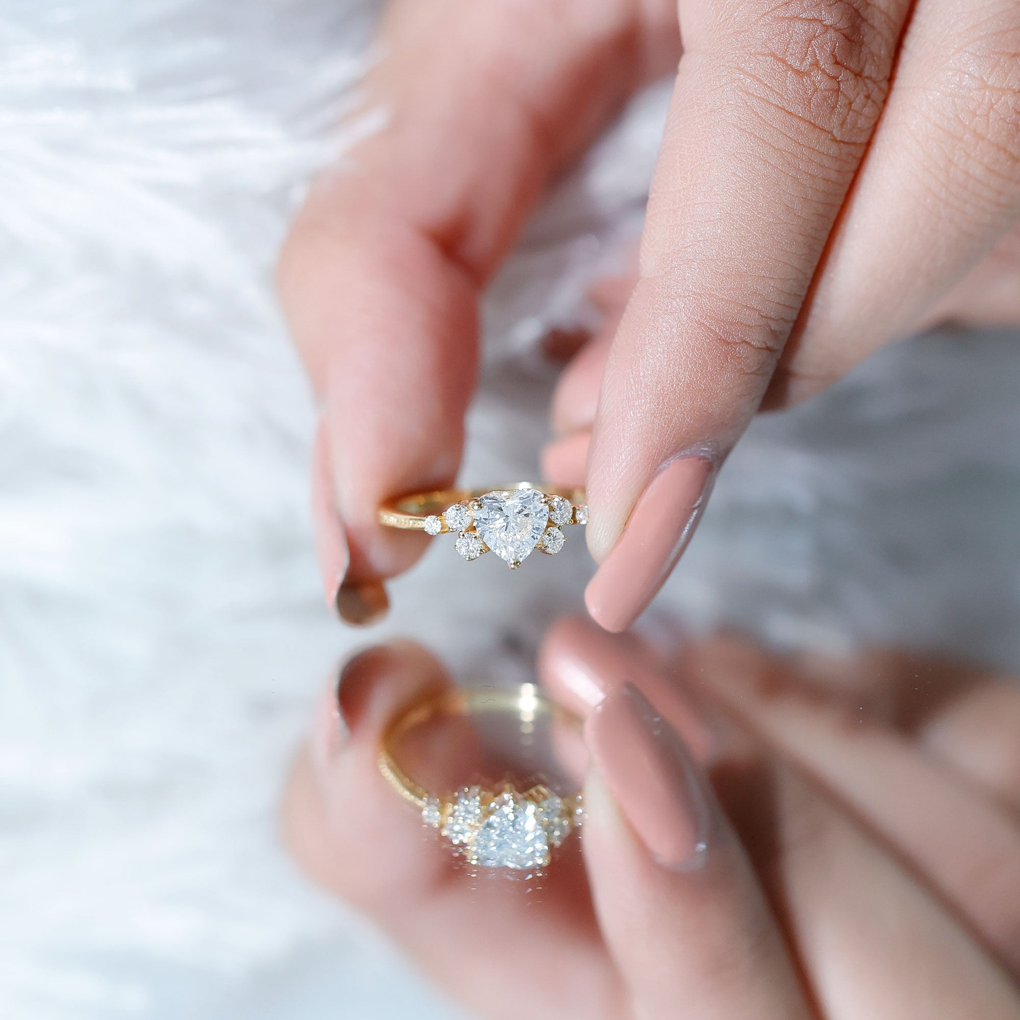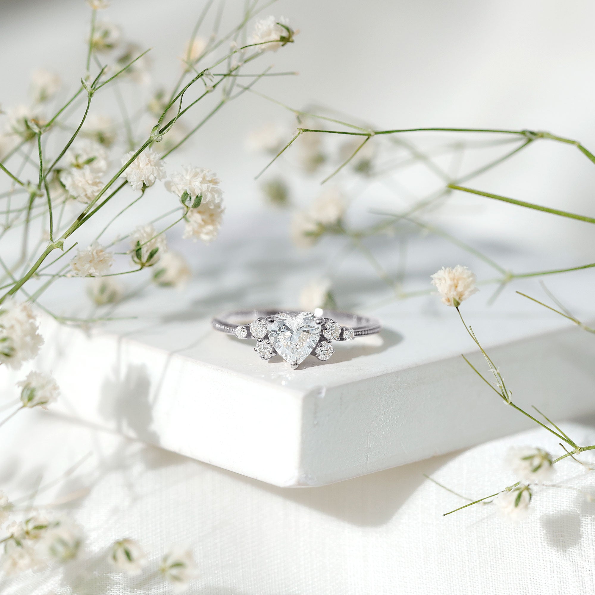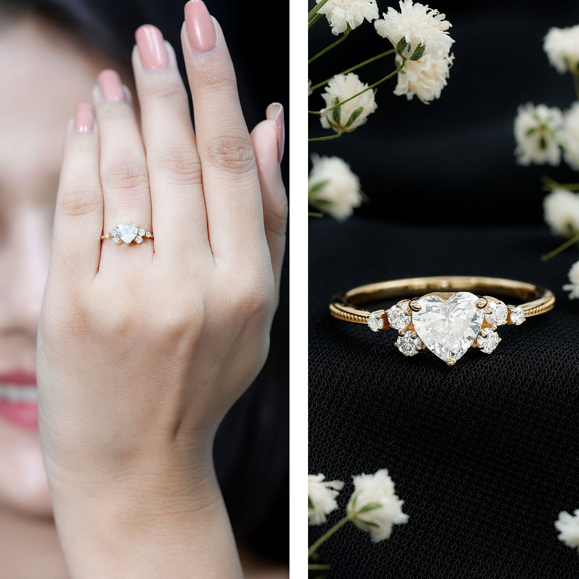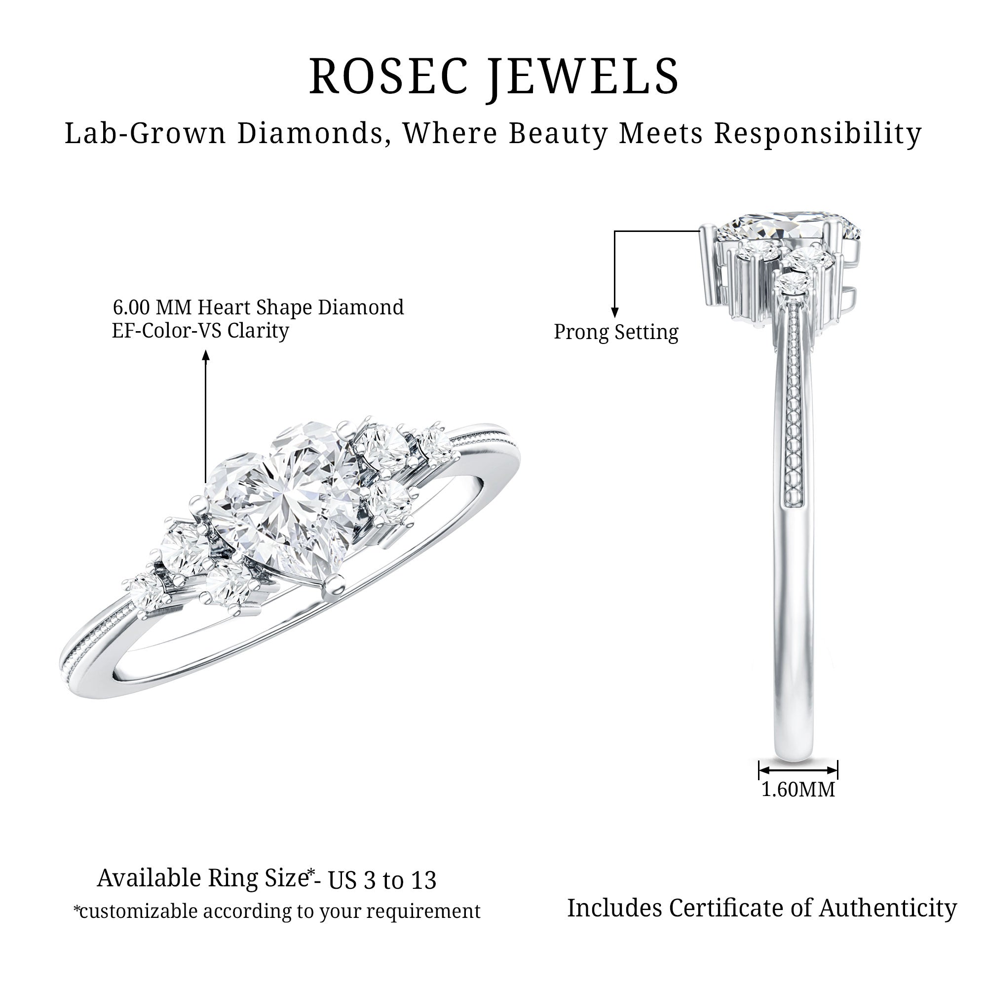 Seal the deal with a Heart Diamond Ring that screams passion, romance, and happily ever after. This Promise Engagement Ring is designed with lab grown gemstone, a 6 MM heart shape diamond is set in the center with a scattered cluster of smaller round stones on either side, arranged like tiny twinkling stars. The prong set stones and slim band with beaded detailing give the Diamond Proposal Ring a touch of old-world charm and add a unique flair to the overall design. Whether you are proposing, celebrating a milestone, or simply making a grand gesture, this Heart Engagement Ring is one shell never forget. No matter what youre celebrating, a glamorous evening dinner, or a festive celebration, this Gemstone Ring will ensure that she shines with confidence and style.