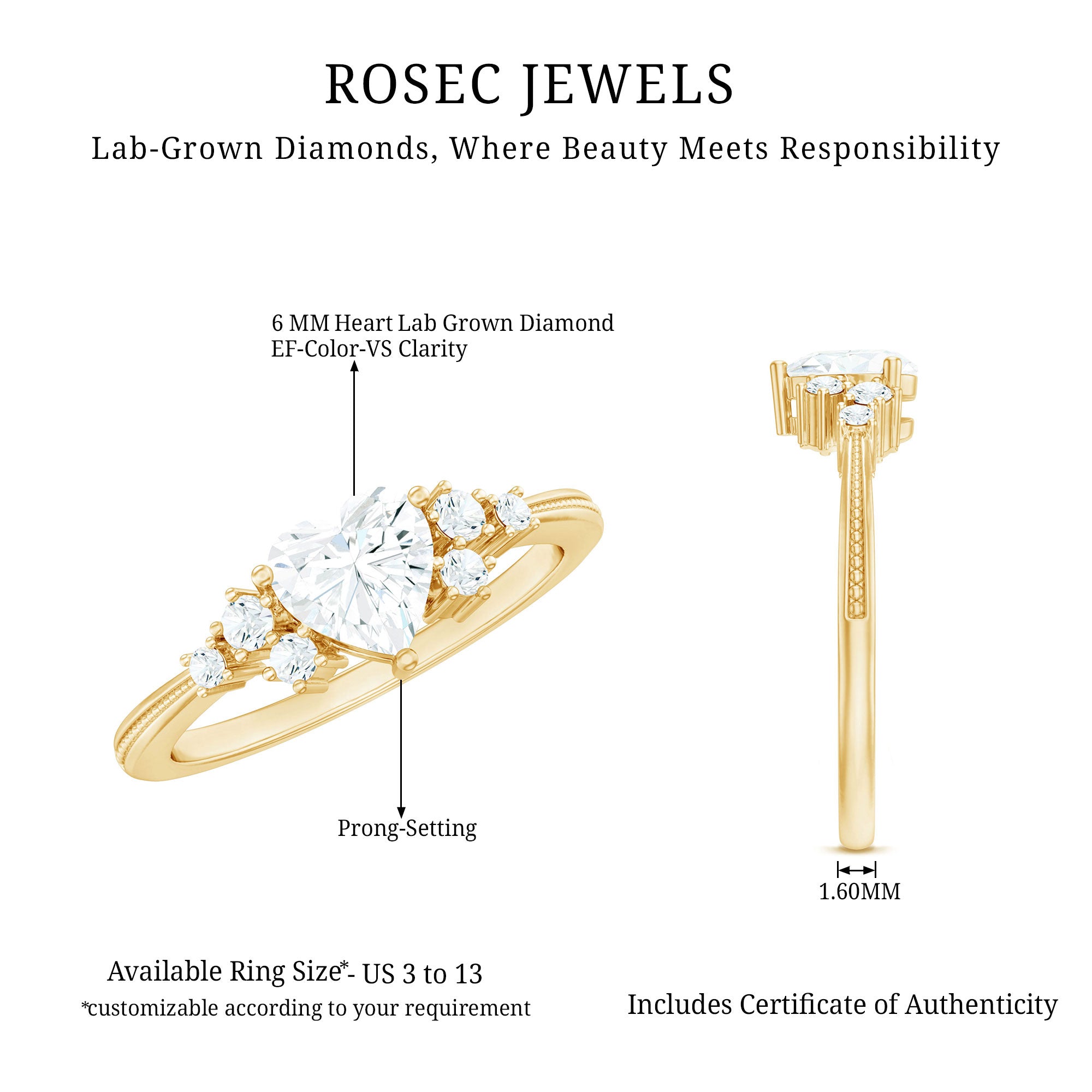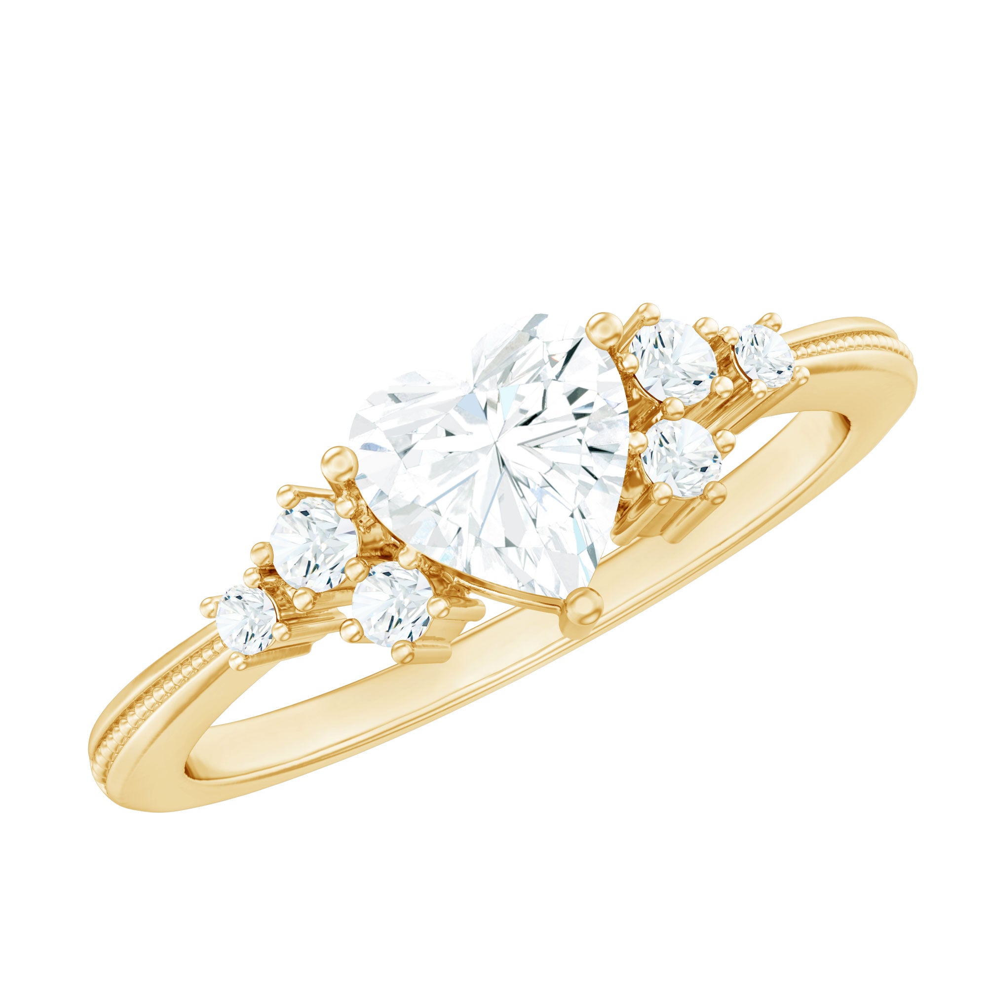 Seal the deal with a Heart Diamond Ring that screams passion, romance, and happily ever after. This Promise Engagement Ring is designed with lab grown gemstone, a 6 MM heart shape diamond is set in the center with a scattered cluster of smaller round stones on either side, arranged like tiny twinkling stars. The prong set stones and slim band with beaded detailing give the Diamond Proposal Ring a touch of old-world charm and add a unique flair to the overall design. Whether you are proposing, celebrating a milestone, or simply making a grand gesture, this Heart Engagement Ring is one shell never forget. No matter what youre celebrating, a glamorous evening dinner, or a festive celebration, this Gemstone Ring will ensure that she shines with confidence and style.