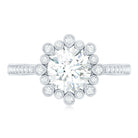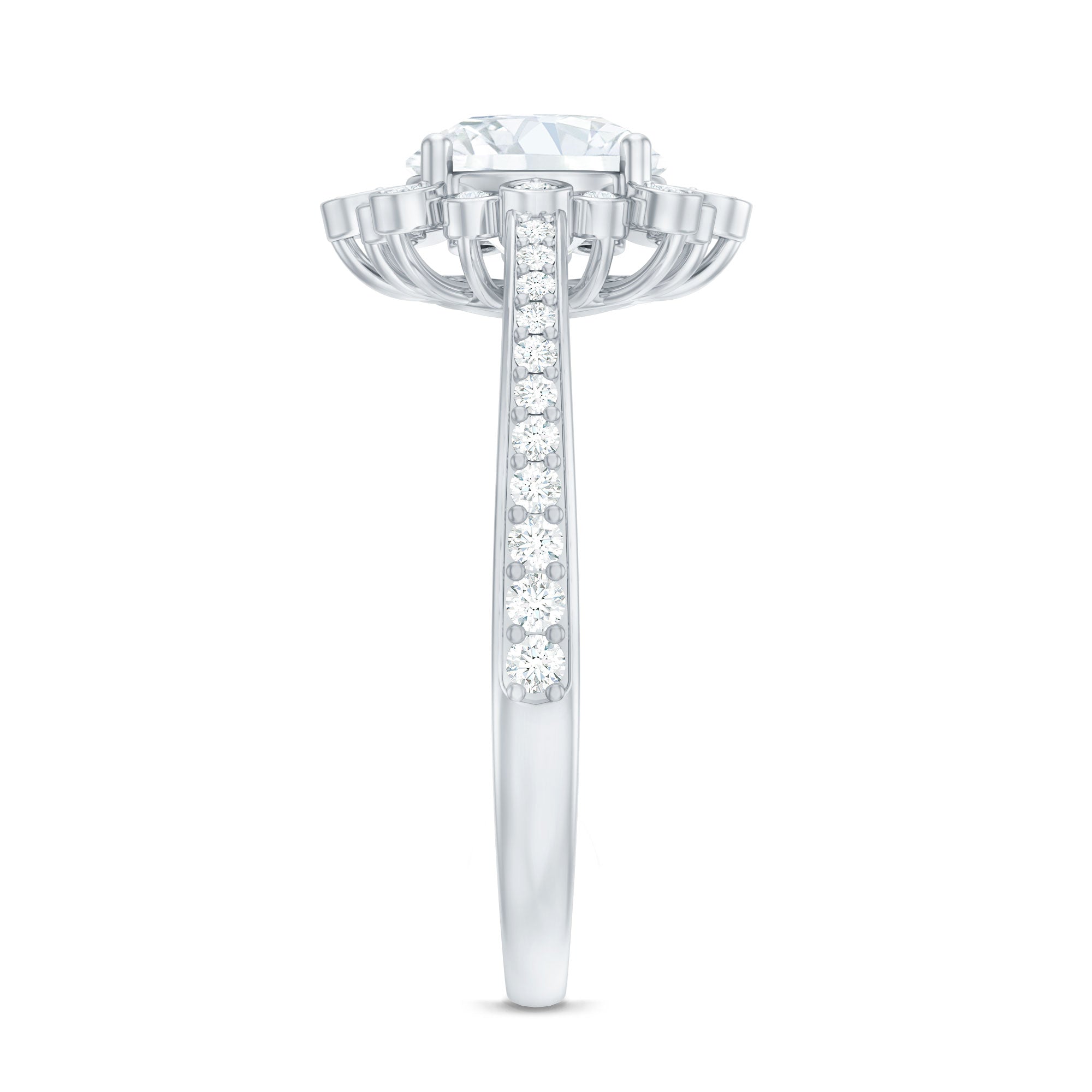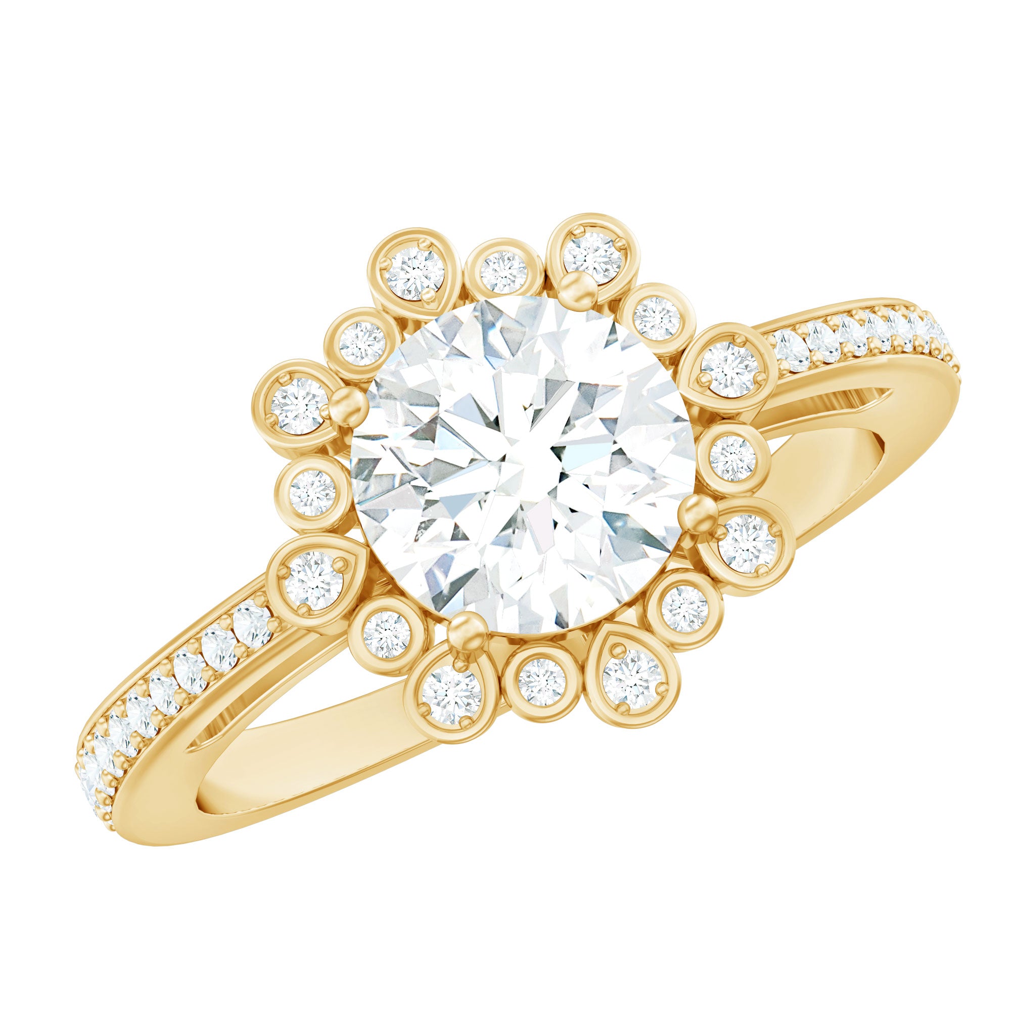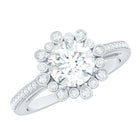 A sparkling token of your love, this Vintage Style Engagement Ring is a perfect choice to make your special day truly unforgettable. This stunning piece showcases an 8 MM round shaped diamond of EF-VS Quality at its heart elevating its allure, surrounded by a halo of smaller gemstones. The band is lined with dazzling side stones, adding extra shimmer with every move she makes. The diamonds in this Halo Engagement Ring are lab-grown which means they are ethically made, responsibly sourced and provide you the same sparkle and durability as the mined ones but at a more affordable price tag. Mark the moment of love with this masterpiece and let her cherish it forever. Order this 2 carat Diamond Ring by Rosec Jewels, which specializes in crafting stunning jewelry pieces using certified lab-cultured gemstones.