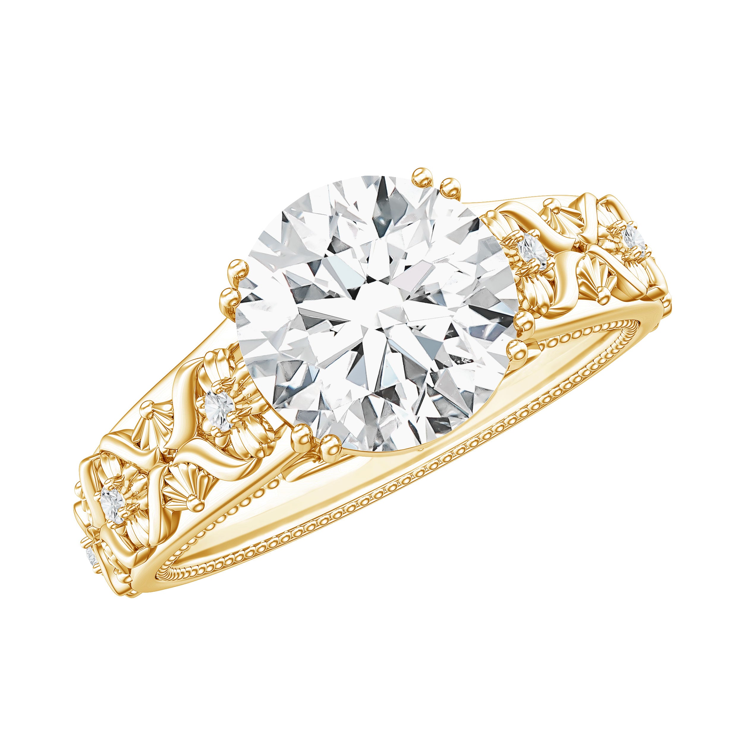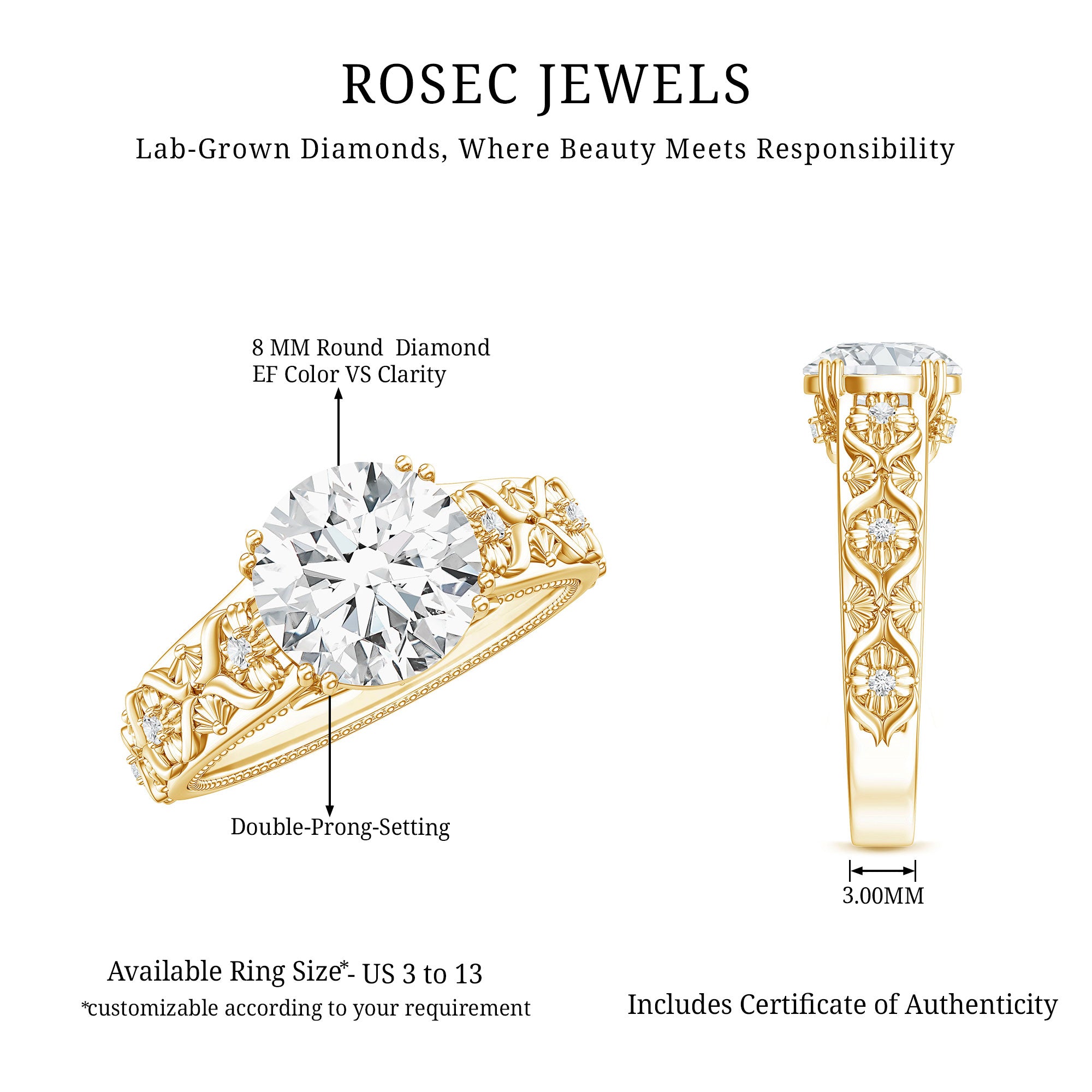 This Lab Grown Diamond Engagement Ring is truly one-of-a-kind and captivating, inspired by the beauty of nature and featuring a stunning sparkle. It showcases an 8 MM round cut lab grown diamond set in double prong as a Solitaire, with floral engravings on the shank and beaded detailing that adds extra elegance. The floral engravings, sparkling with delicate diamonds, create a unique shine and a nature-inspired theme that blends perfectly. This Vintage Style Engagement Ring symbolizes beauty, curated to be admired. The flower motif beneath the main stone is embellished with peek-a-boo diamond, enhancing the overall sparkle without drawing attention away from the dazzling solitaire. As a token of love with endless options, this Solitaire Diamond Engagement Ring is both pretty and delicate, capturing all the memories of your special day. Show off a floral vibe with this stunning 2 Carat Diamond Ring featuring EF-VS Quality lab diamonds, which she will adore as a symbol of commitment and eternity. It is designed for brides seeking a unique piece that embodies romance while also reflecting a touch of old-world charm and the beauty of nature. This Flower Engagement Ring is a timeless expression of love. Celebrate your love with this exquisite piece and let her treasure it forever.