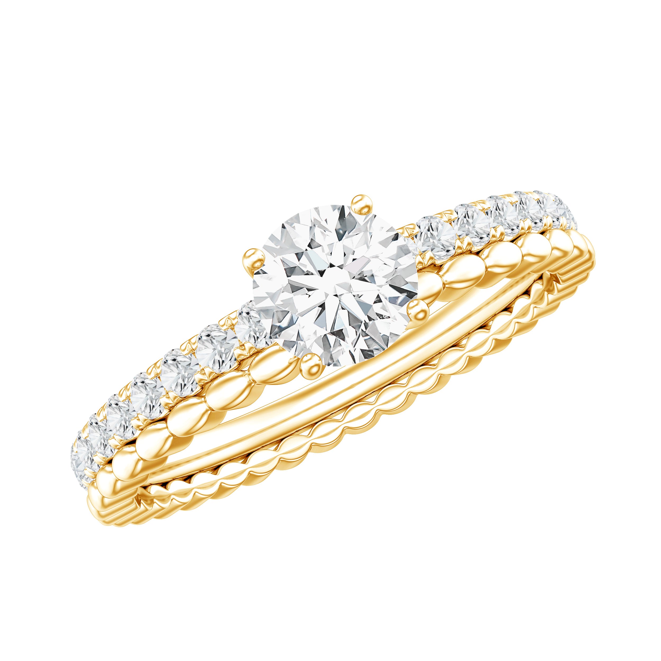 This Solitaire Diamond Engagement Ring is the perfect finishing touch for those moments when love is in the air, designed to radiate timeless beauty. At the heart of this Solitaire Ring, a 5 MM round lab-grown diamond takes center stage, securely held in prong setting. To enhance its elegance, the unique band features two rows one is adorned with round cut diamond side stones and the other one is made of plain metal in a designer pattern that complement the main diamond beautifully and giving this beauty a stackings rings like appearance. This Lab Grown Diamond Ring for Women comes with a certificate of authenticity and a signature jewelry box, allowing you to keep your ring safe when it is not being worn. With options for customization, you can make this Round Engagement Ring truly unique. Add a touch of sparkle to your style with our handcrafted jewelry, made with precision and passion. All EF-VS quality diamonds are lab-grown, and this Promise Engagement Ring includes a certificate of authenticity to guarantee you get excellent value for your investment. Delight your future bride with this gorgeous ring, and see her eyes light up with joy and happiness.