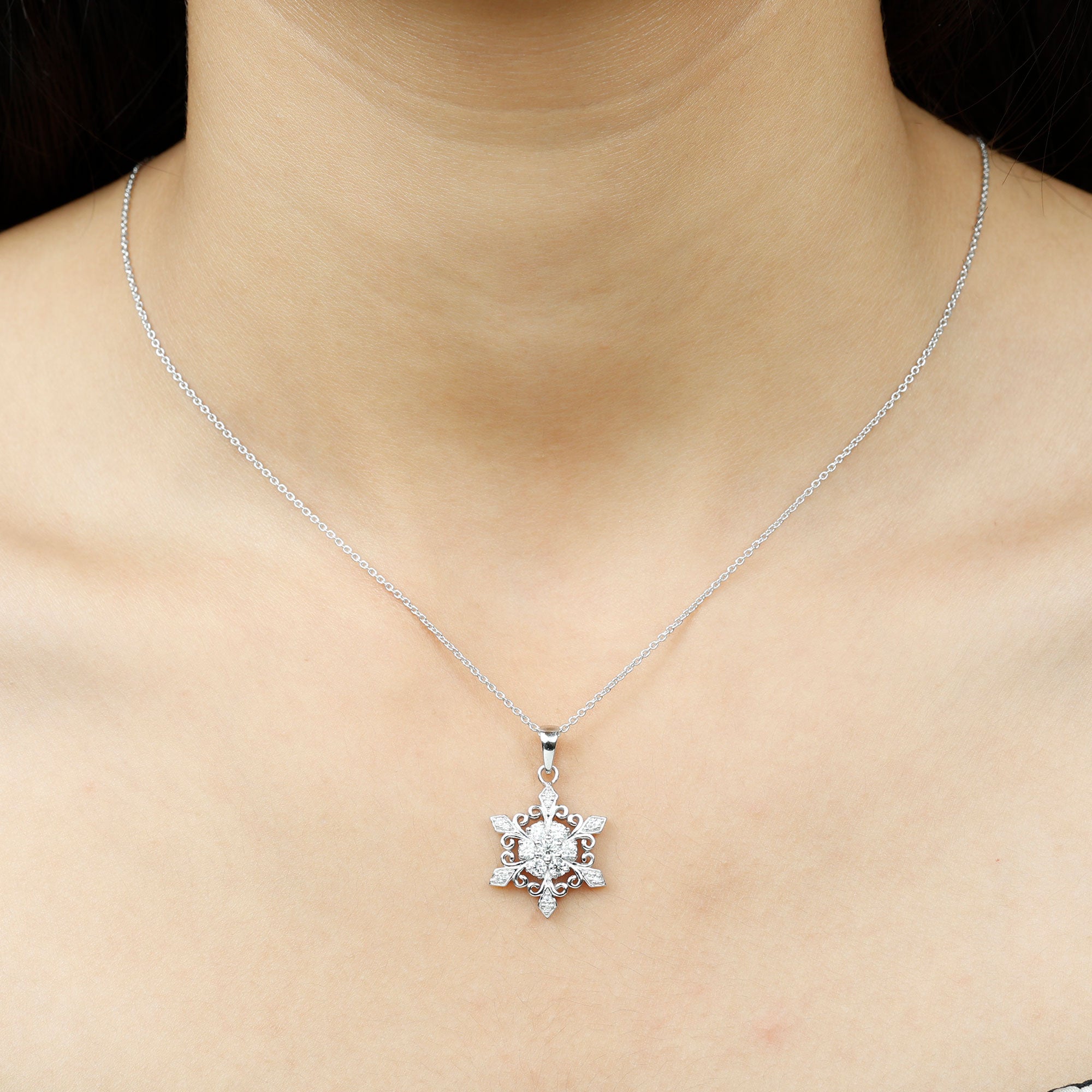 Captivating and full of charm, this Snowflake Pendant brings a fresh sparkle to your jewelry collection. Inspired by the delicate beauty of real snowflakes, this Fine Pendant is designed to shine with graceful detail. Each angle of the snowflake is carefully crafted and adorned with shimmering Round Shape Lab Grown Diamond stones, giving it an elegant glow that catches the light beautifully. Made with EF-VS Quality Lab Diamond stones, this necklace reflects the same brilliance and clarity as natural stones, but with a more thoughtful and eco-friendly touch. The snowflake design is eye-catching, making this Lab Grown Diamond Necklace perfect for everyday wear or dressing up for special occasions. Suspended on a fine chain, the snowflake sits gracefully at the neckline, adding a subtle sparkle that feels timeless and winter-kissed. Whether you are gifting it to someone special or adding it to your collection, this Lab Diamond Necklace is a lovely way to express your unique style, beautifully captured in a stunning snowflake. Presented in a beautiful jewelry box, this Lab Created Diamond Pendant is ready to become a favorite piece in any wardrobe. Elegant, meaningful, and easy to wear, this Diamond Snowflake Necklace (Lab Diamond) adds a little magic to every moment.