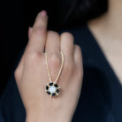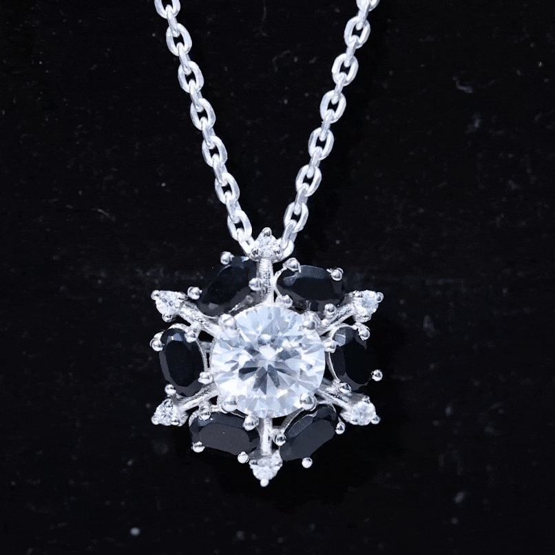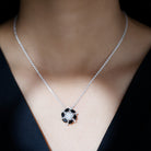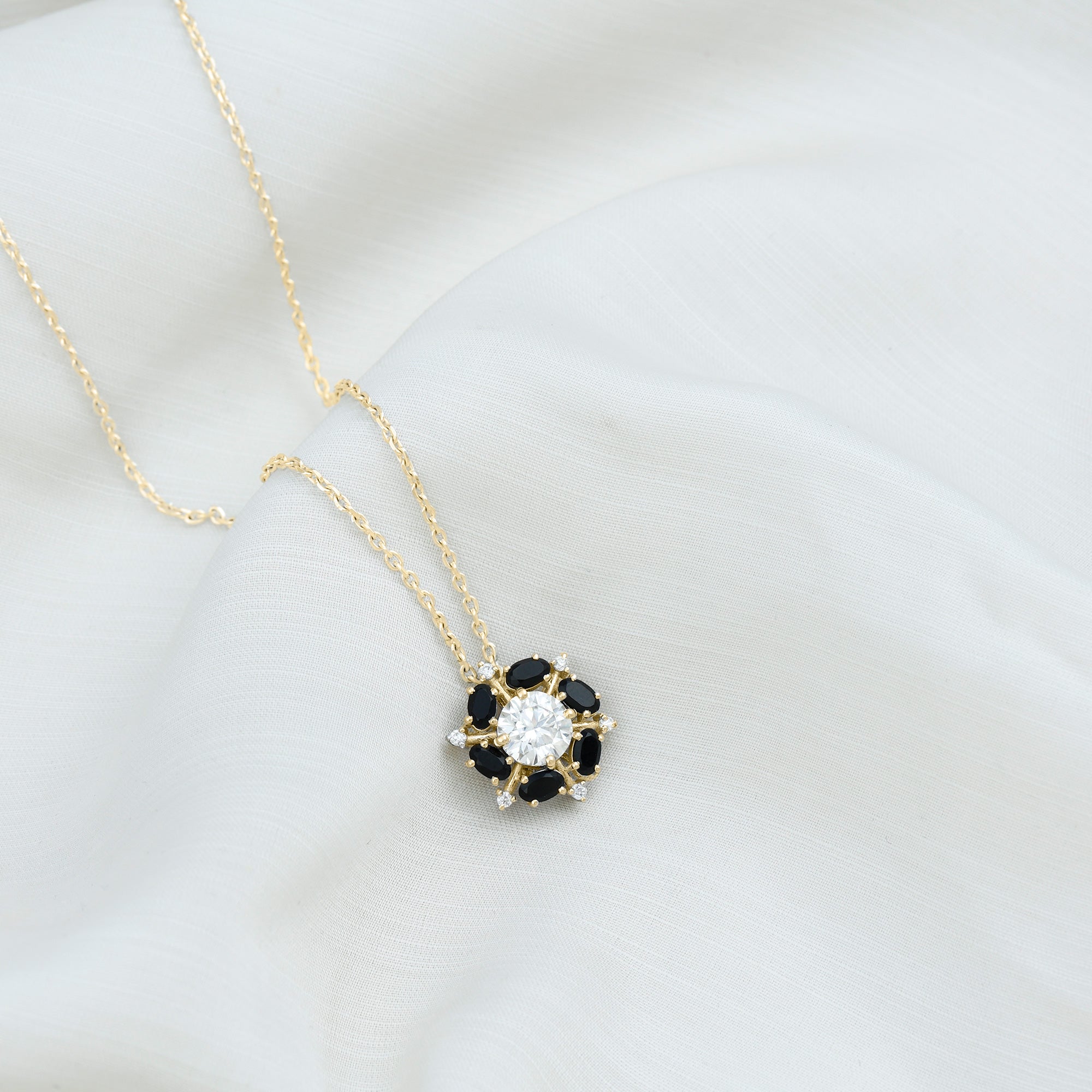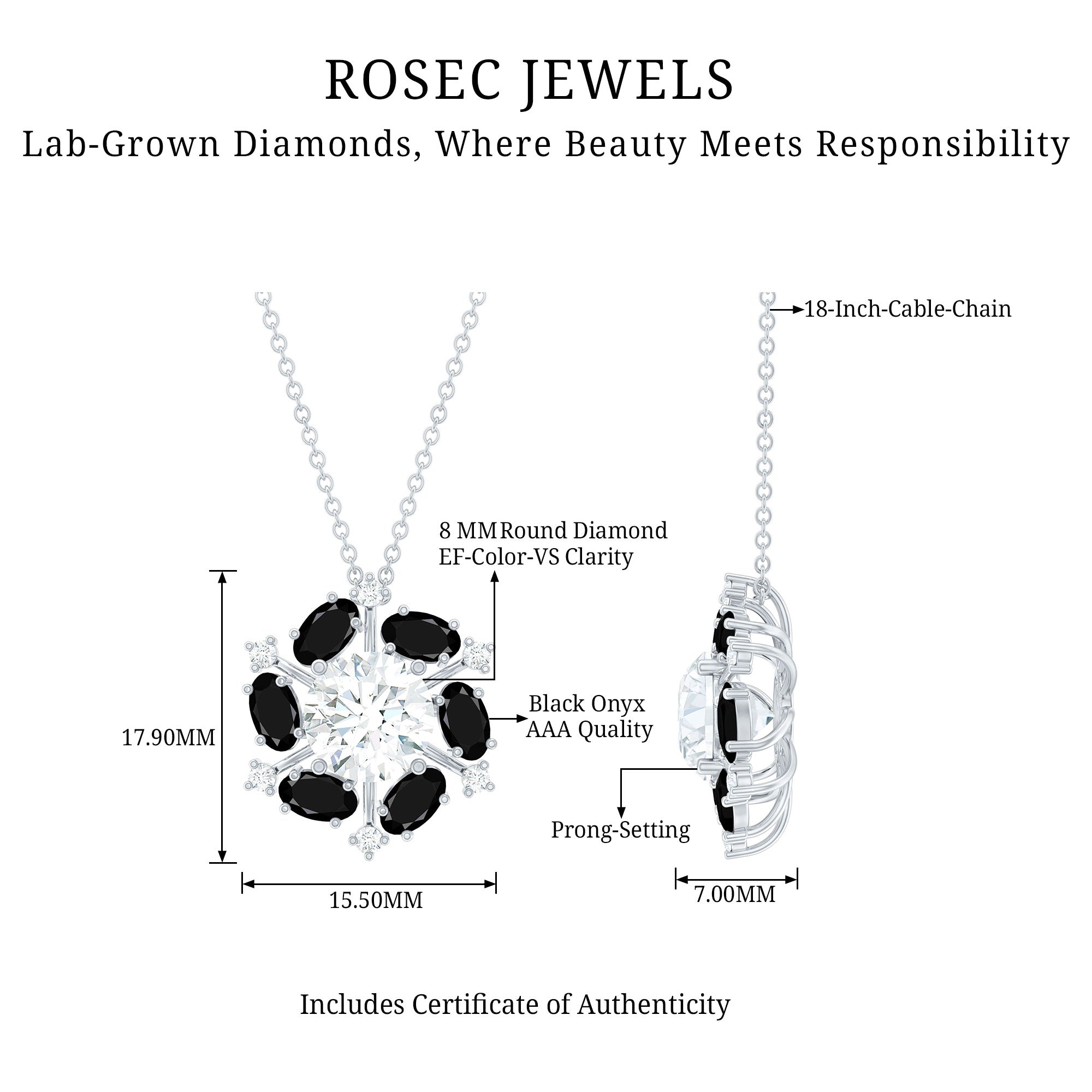 Make a bold statement of elegance with our Diamond Pendant Necklace, where timeless brilliance meets modern sophistication. This stunning Monochrome Necklace features a 2 Carat Diamond of round shape, responsibly sourced and ethically made in a lab. Surrounding it, oval shaped black onyx and round cut diamonds create a striking contrast, giving this Statement Flower Necklace a bold and classy look. The Diamond and Onyx Necklace has the perfect touch of contrast, making it ideal for any outfit. It is ideal for events like weddings, parties, or formal dinners, where you want to stand out with timeless beauty.