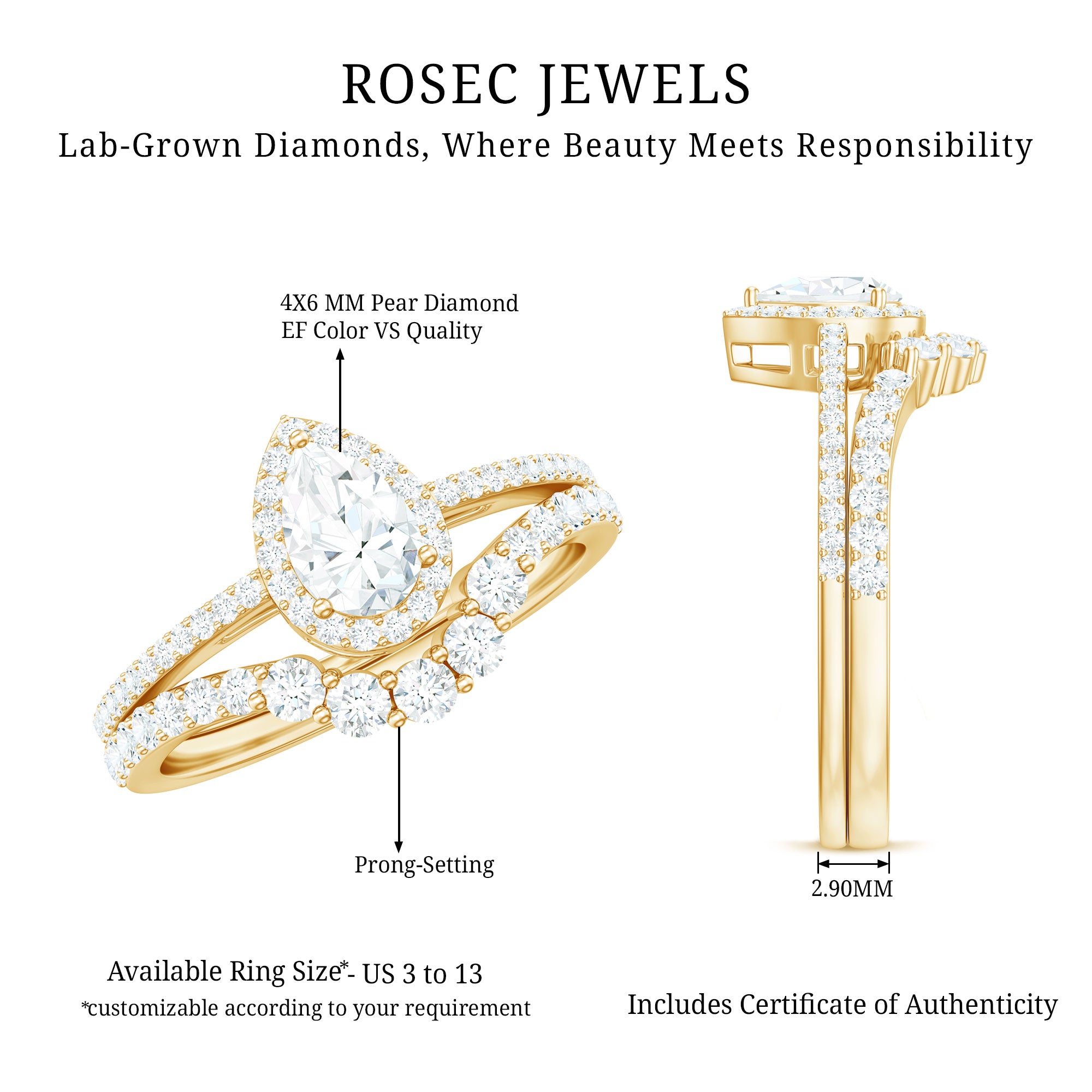 Make your forever shine with a blend of modern brilliance and timeless charm. This gorgeous Lab Grown Diamond Bridal Ring Set includes a Teardrop Engagement Ring along with a matching Curved Wedding Band, designed to celebrate your love in the most elegant way. The 4X6 MM pear-shaped lab-grown diamond center stone radiates exceptional clarity, effortlessly capturing light and attention. Surrounding this stunning focal stone is a diamond halo, which also adorns the band as side stones, adding a graceful sparkle with every movement. Made with care and sustainability in mind, this Diamond Engagement Ring Set offers all the beauty of natural gemstones. Available in US ring sizes 3 to 13, this Wedding Engagement Ring Set guarantees a perfect fit for every bride-to-be. Delivered in a luxurious jewelry box, this Teardrop Wedding Ring Set is ready for proposals and memories. Timeless, elegant, and ethically crafted, it provides a sparkle that endures for generations.