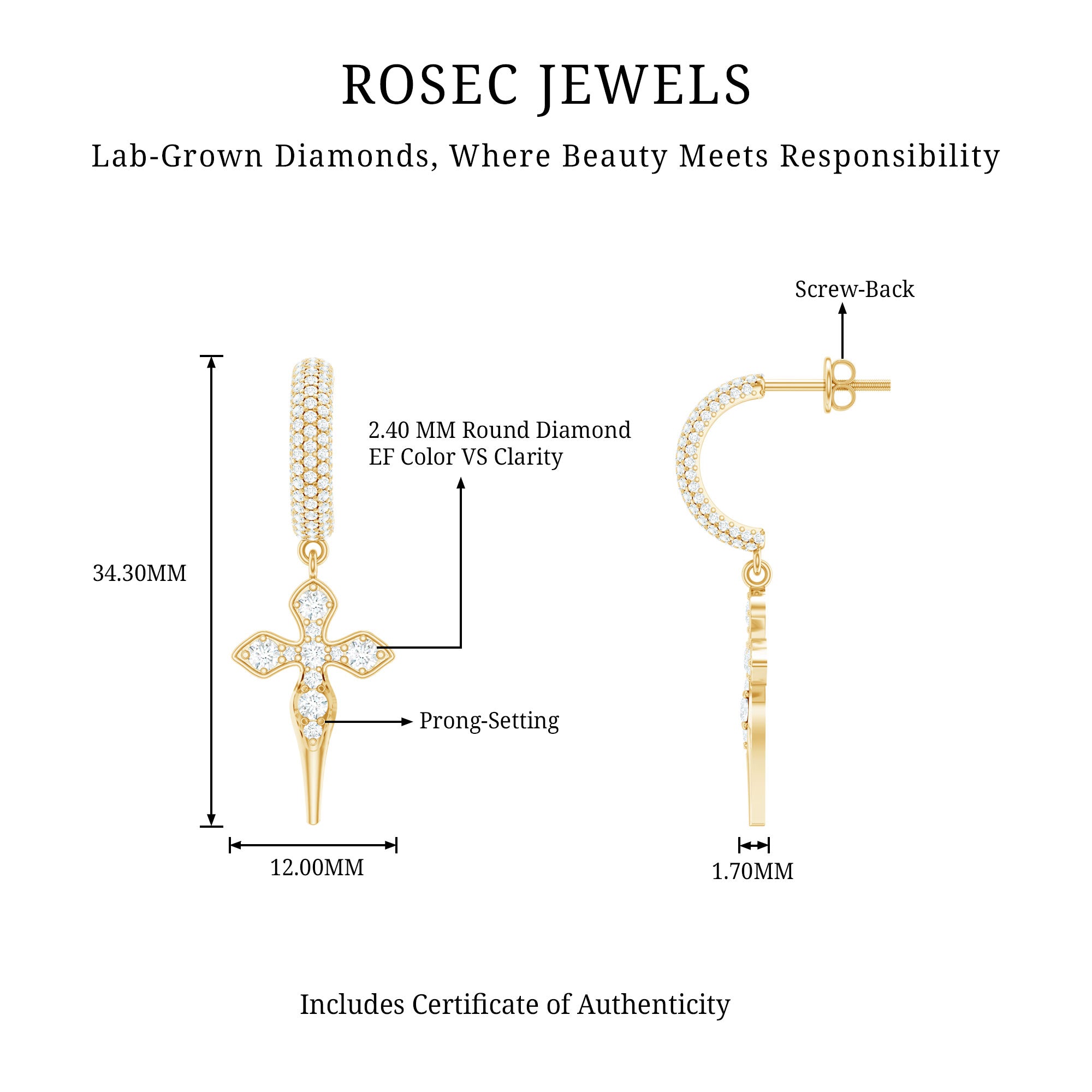 These Vintage Inspired Diamond Cross Earrings are a stunning blend of old world charm and modern craftsmanship. Featuring an elongated cross adorned with dazzling round lab grown diamonds dangling from a gemstone-studded curved bar at the top. Designed with a secure screw back closure, these Minimalist Earrings offer both style and comfort, ensuring a perfect fit for all day. These Diamond Drop Earrings are incredibly versatile and ideal for both casual and formal occasions. You can wear them to church, religious occasions, or weddings as a beautiful expression of faith. For making a statement pair them with a matching necklace and bracelet - also available on our website.