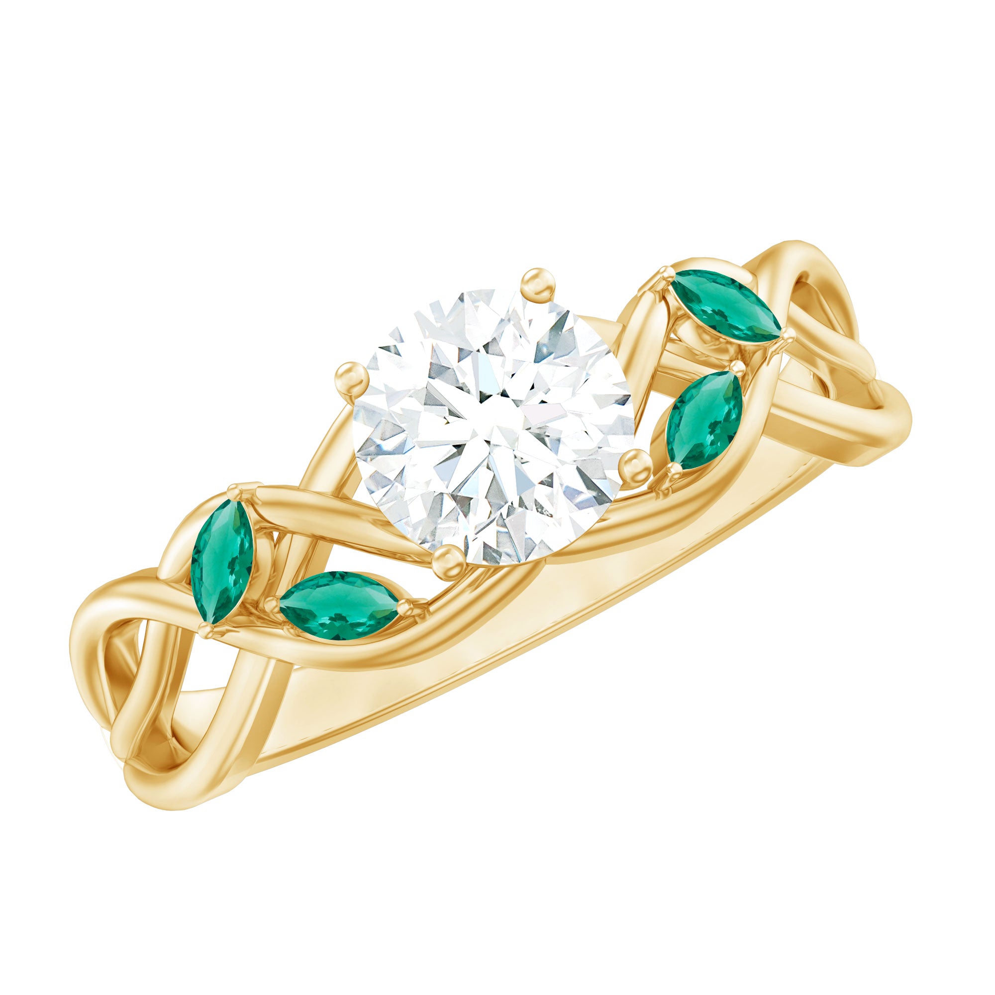 Make the day special with this Diamond Round Engagement Ring. This Engagement ring features 6 mm Round Shape Lab Grown Diamond in the Prong Setting on the Criss Cross Shank adorned with Marquise Shape Lab Grown Emerald. The High Set Ring beholds the shine of Ef-Vs Quality Diamond and Aaaa Quality Emerald. The 1 Carat Diamond Ring depicts love and purity in the relationship perfect to initate the promiss of togetherness. Rosec Jewels Diamond Emerald Ring will mark the day memorable with its giltery apperance.
