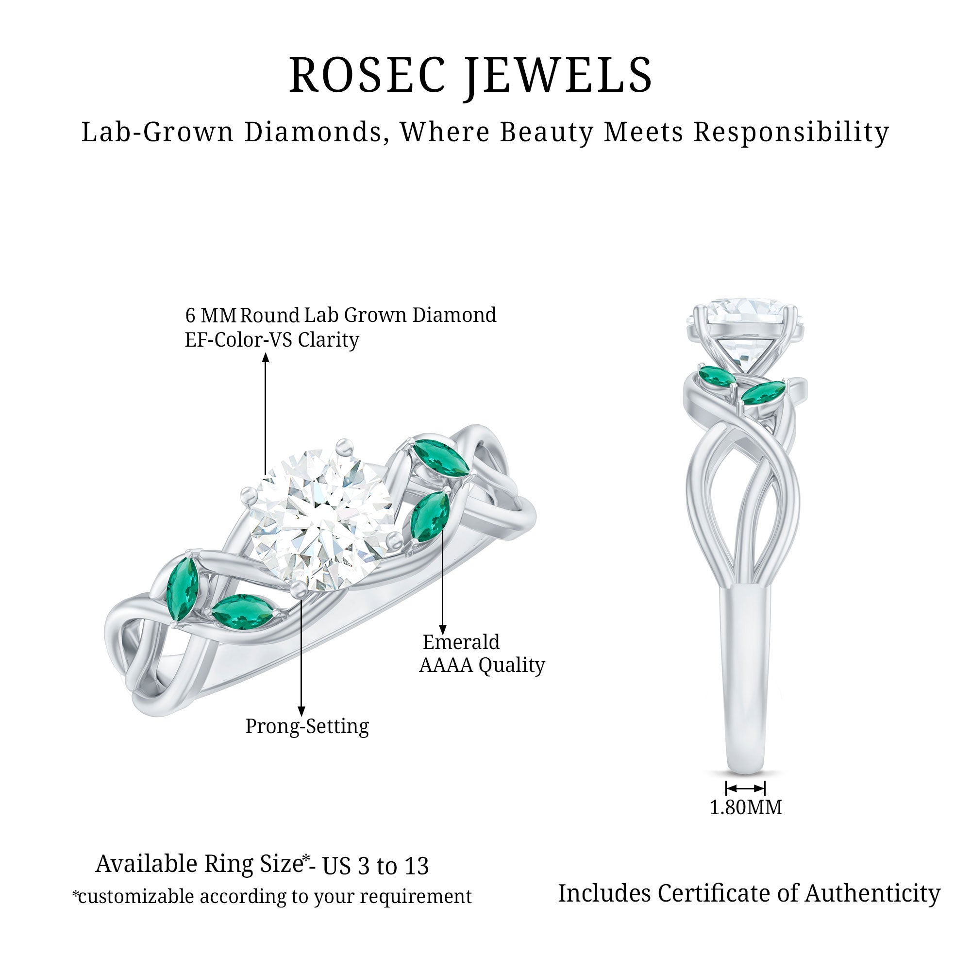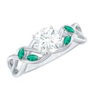 Make the day special with this Diamond Round Engagement Ring. This Engagement ring features 6 mm Round Shape Lab Grown Diamond in the Prong Setting on the Criss Cross Shank adorned with Marquise Shape Lab Grown Emerald. The High Set Ring beholds the shine of Ef-Vs Quality Diamond and Aaaa Quality Emerald. The 1 Carat Diamond Ring depicts love and purity in the relationship perfect to initate the promiss of togetherness. Rosec Jewels Diamond Emerald Ring will mark the day memorable with its giltery apperance.