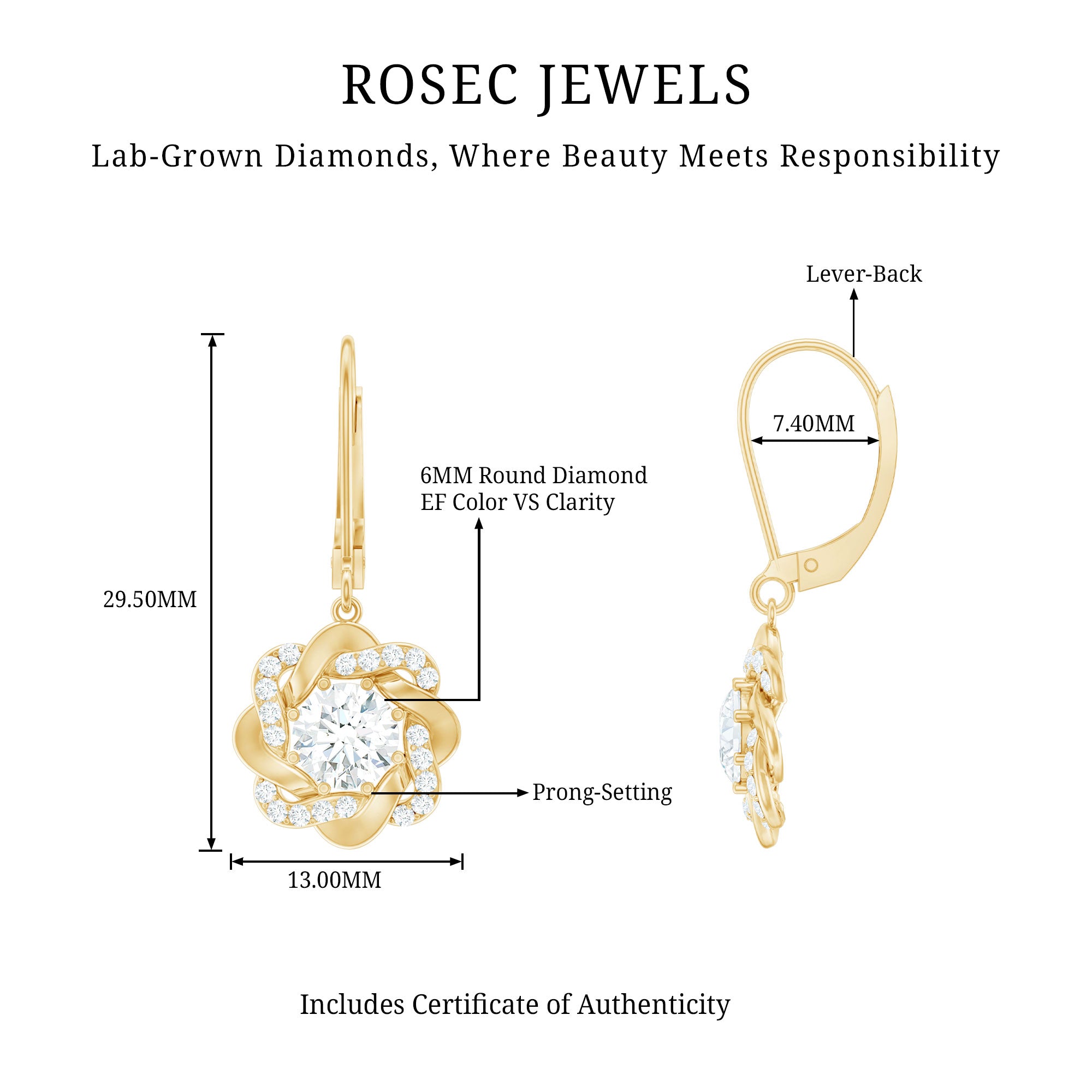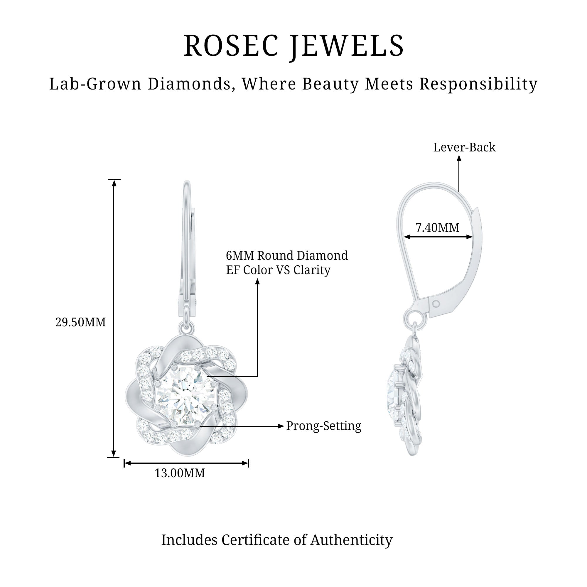 Let your style blossom with these Diamond Drop Earrings, designed to add a touch of natures grace to your jewelry collection. These beauties feature a radiant 6 MM round cut lab grown diamond of EF-VS Quality set in prong setting, surrounded by a floral motif. The intertwined curves of the flower are adorned with smaller diamonds that enhance the overall shimmer. These Flower Dangle Earrings are handcrafted with a secure and comfortable lever back closure, they stay in place allowing you to move with confidence. These Nature Inspired Diamond Earrings are a versatile addition to your jewelry collection, perfect for a wedding, cocktail party, or any grand celebration - wear them and watch every eye in the room turn to you.