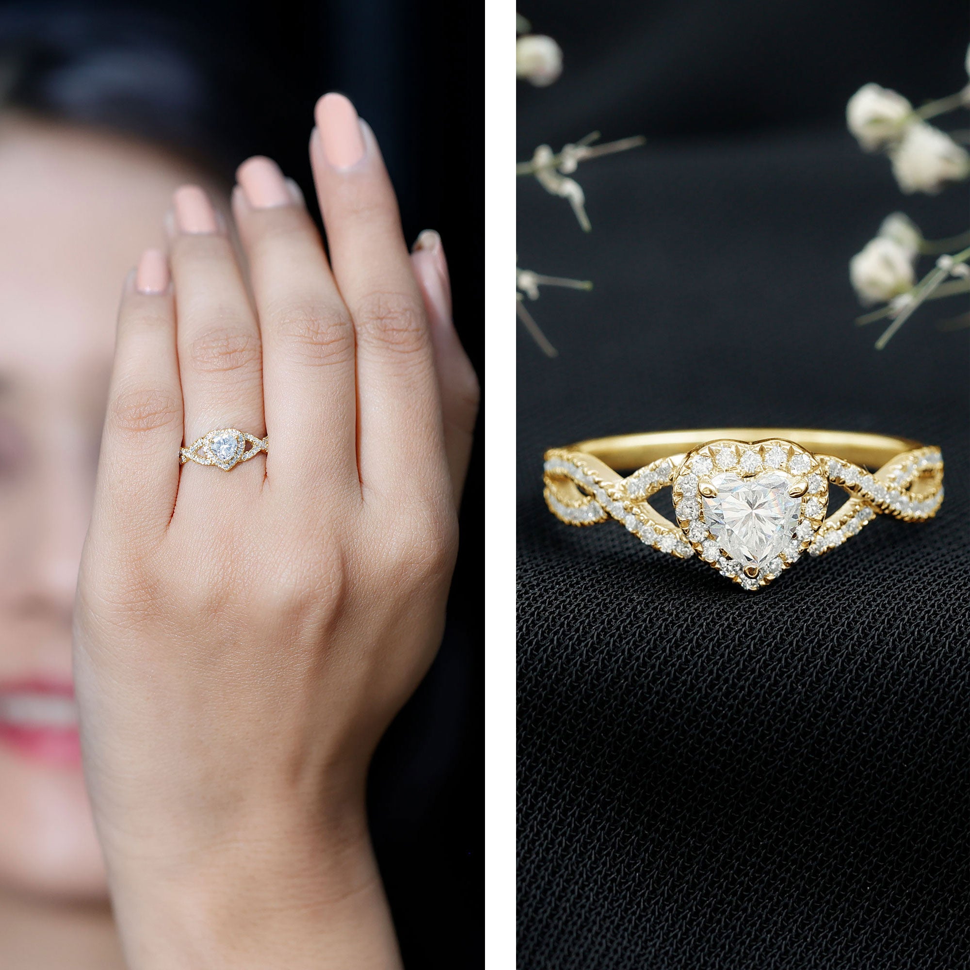 When love shines through sparkle, this Heart Shaped Engagement Ring becomes the ultimate symbol of forever. It features a gorgeous 5 MM Heart Shape Lab Grown Diamond set in Prong Setting at the center, surrounded by a diamond halo. This Criss Cross Engagement Ring is all about romance with a contemporary twist. The EF-VS Quality Lab Diamond sparkles with clarity and brilliance, while the delicate Side Stones along the crossover band enhance its charm with a radiant, graceful glow. This Half Carat Diamond Ring captures emotion in a timeless design, perfect for the one who holds your heart. Presented in a stylish jewelry box, this Lab Grown Diamond Engagement Ring is ready to be gifted and cherished from the very first moment she sees it. Whether you are proposing, celebrating a milestone, or just expressing your love in the most unforgettable way, this Diamond Heart Ring is a stunning choice. Made for romantic souls and daring hearts, it transforms every glance into a memory and every moment into something magical.
