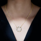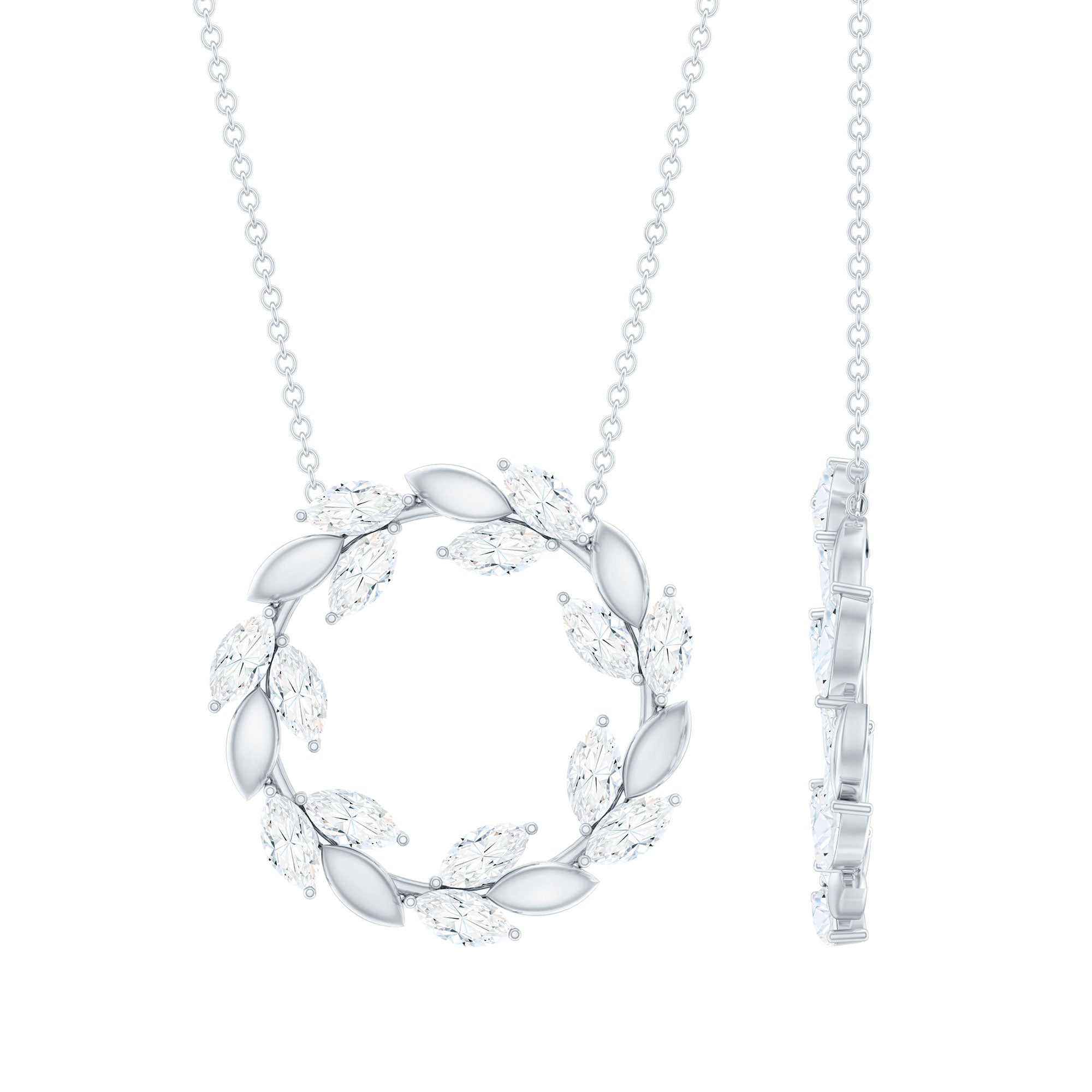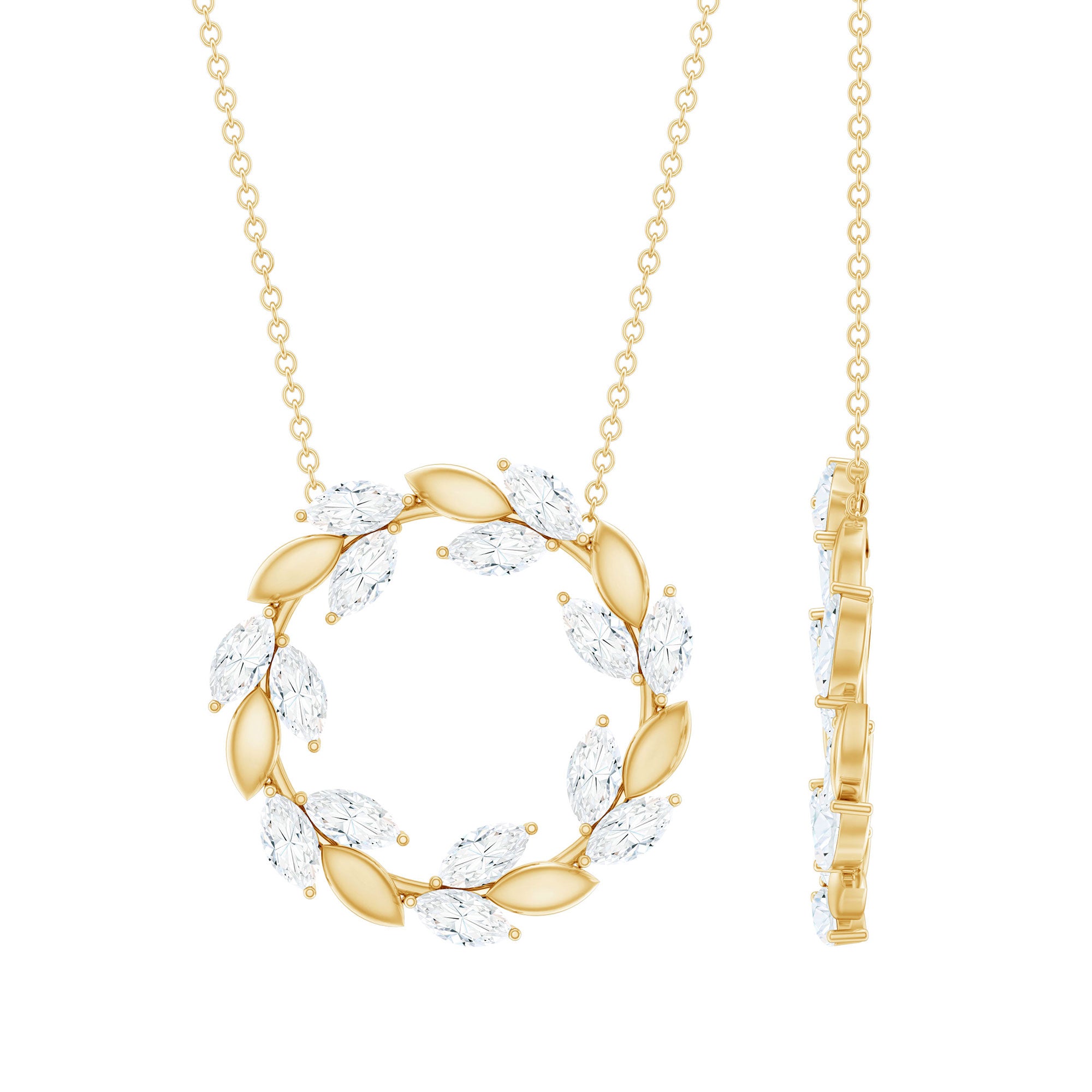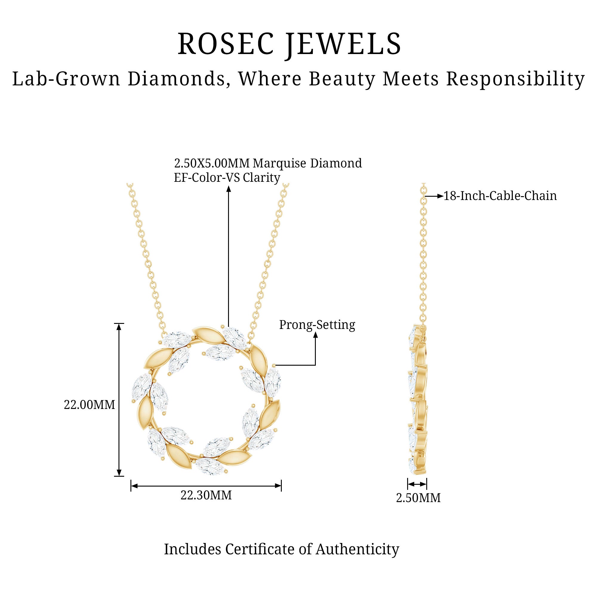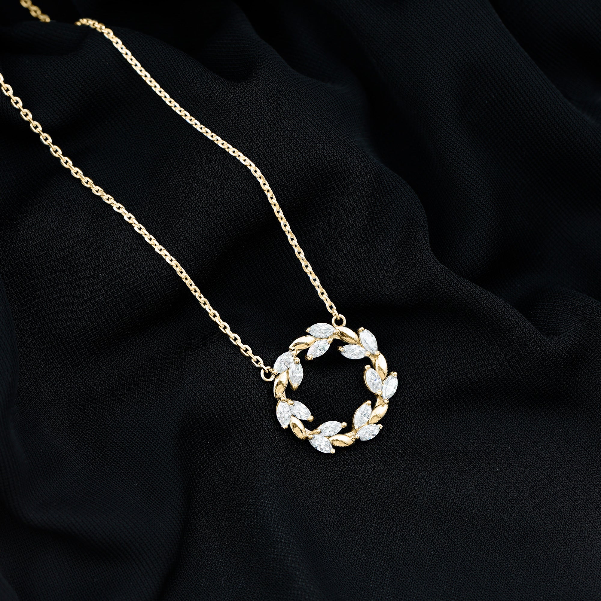 Inspired by the charm of nature, this Diamond Eternity Necklace captures the essence of a blooming wreath in full splendor. This Open Circle Necklace is intricately designed with alternating polished metal leaves and marquise shaped lab grown diamonds, resembling a graceful vine woven into a perfect circle. Each EF-VS Quality Diamond is set in secure prong setting, designed for comfort and a modern look. Whether worn as an everyday statement or on special occasions, this Diamond Necklace for Women serves as a reminder of natures eternal beauty and the endless cycle of love and life.