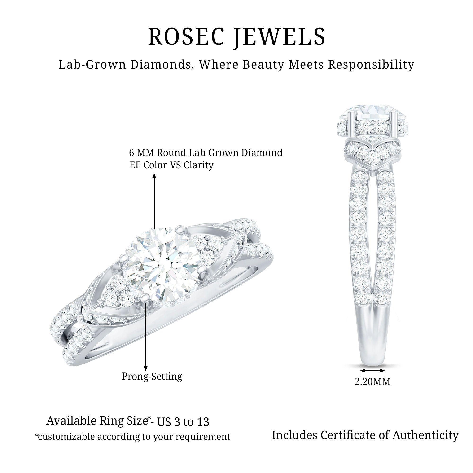 A perfect embodiment of timeless elegance, this Classic Engagement Ring captivates with its exquisite design. Meticulously crafted, this ring features a 6x6 mm Round Shape Lab Grown Diamond as a centerpiece over the mesmerizing shank, accented with dainty Lab Grown Diamond gemstones, symbolizing enduring love. This Vintage Diamond Ring seamlessly combines sophistication and sustainability with Ef-Vs Quality Diamonds. With a blend of tradition and modernity, Rosec Jewels stands as a beacon of responsible luxury. Embrace a symbol of everlasting love with our Lab Grown Diamond Engagement Ring, a testament to enduring beauty.