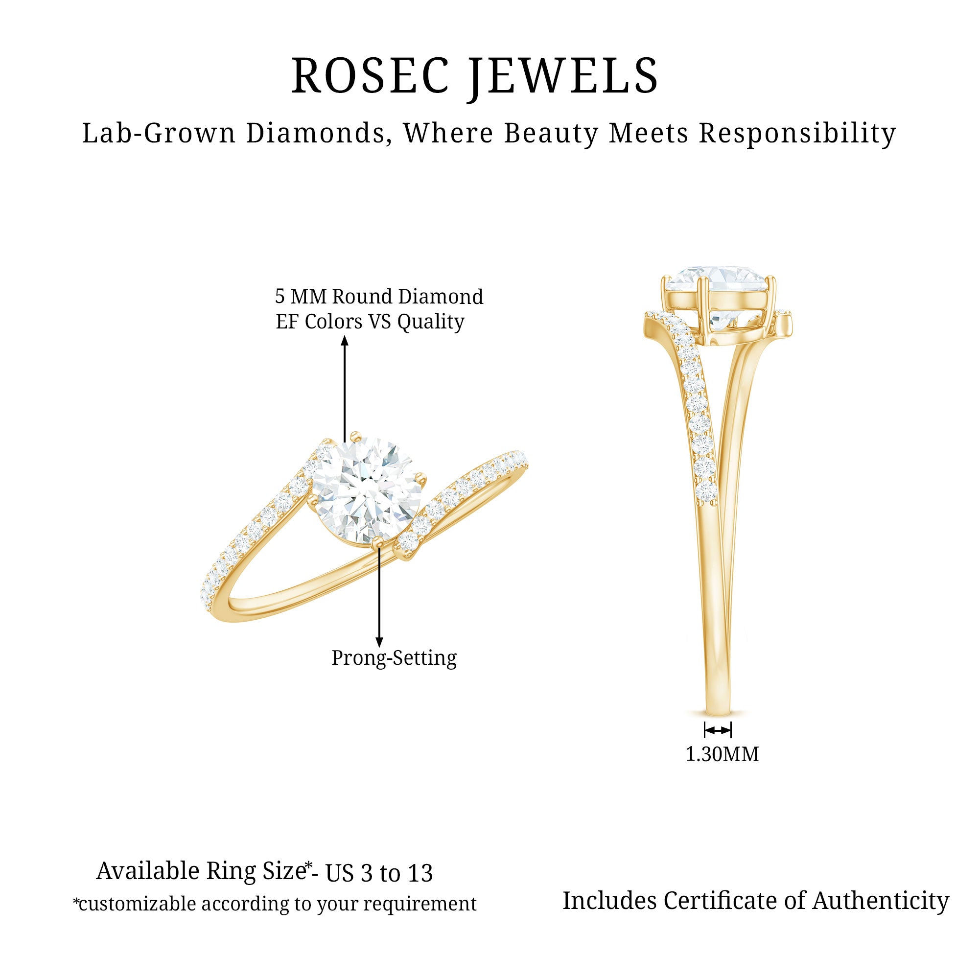 If she is a modern diva, this Lab Grown Diamond Engagement Ring would make a place in her heart without a miss. Boasting a one of a kind sparkle, the Single Stone of 5 MM Round Shape Lab Grown Diamond encased in Prong Setting takes all the center stage here. The Bypass Shank lends a contemporary twist to its classic design, encrusted with side-stones of Lab Grown Diamond for added brilliance.