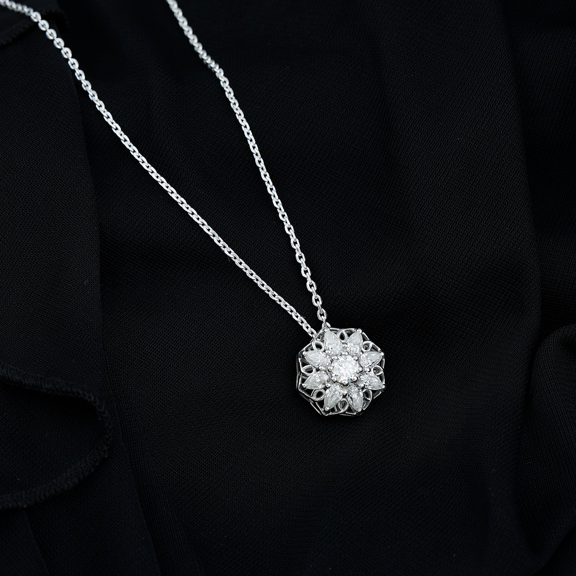 The irresistible beauty of a flower is perfectly expressed in our delicate Diamond Flower Necklace. It features a 5 MM round shaped lab grown diamond in the center set in heart-prong setting, adding a romantic touch to the design. Crafted with our master artisans unmistakable eye for detail, the center stone is encircled by a pear shaped diamond halo, while the intricate metalwork surrounds the EF-VS Quality diamonds giving a vintage charm to the piece. The Diamond Pendant Necklace is a classic piece of jewelry and its irresistible beauty catches everyones eye. To ensure its Quality, this Floral Pendant comes with a certificate of authenticity, providing peace of mind.