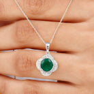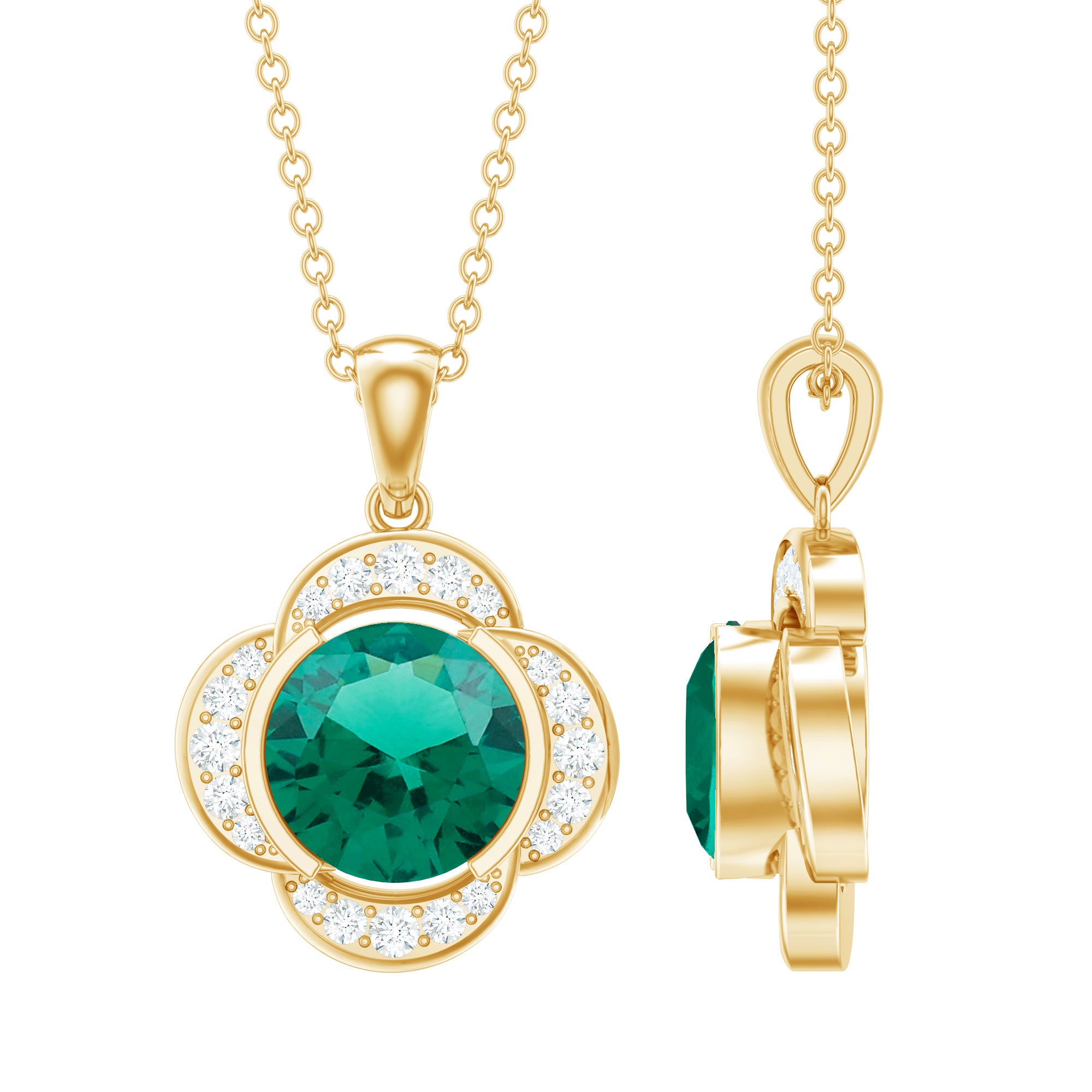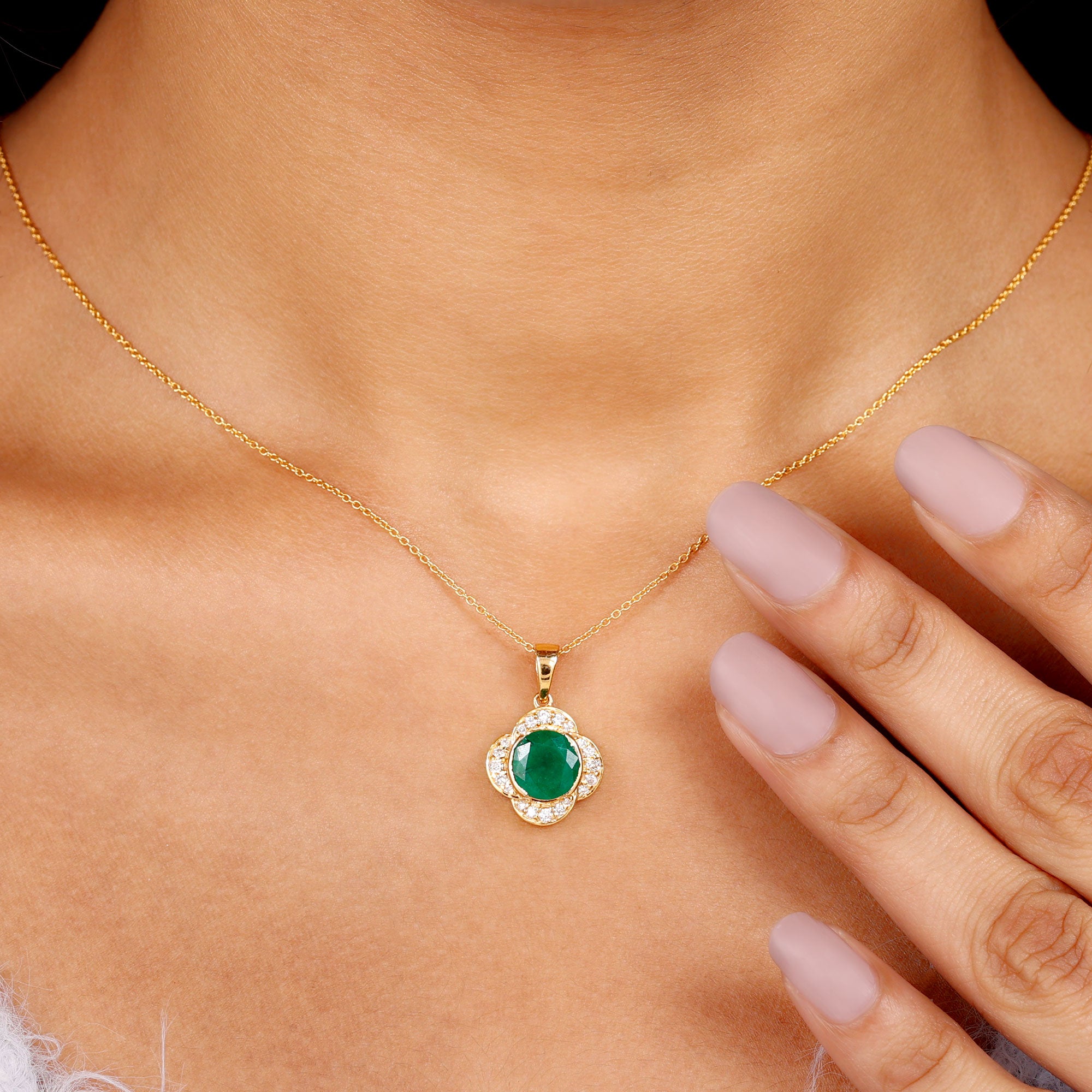 Cherish every moment with our Lab Grown Emerald Pendant Necklace, precisely designed to capture attention. It features an 8 MM Round Shaped Lab Created emerald securely held in a half bezel setting encircled with a halo of smaller diamonds that creates a captivating contrast. This Flower Pendant Necklace is suspended with a bail that provides a carefree wearing all day and night. Whether looking for a versatile accessory for yourself or just want to surprise someone special, this Halo Necklace is a perfect piece you must choose.