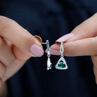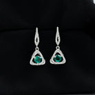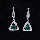 You are sure to be completely captivated by these Lab Created Emerald Drop Earrings, which truly exemplify stunning beauty and a unique design. Crafted with only the highest quality materials, this piece showcases beautiful prong set stones skillfully placed in 14k white gold plated silver. Enhancing the breathtaking design are the AAAA quality lab created emeralds that create a striking contrast with the D color, VS1 clarity moissanite stones. Our unique Dangle Drop Earrings feature a 6 MM round cut emerald at the center of an interlocked triangle frame embellished with round cut moissanite stones. Perfectly engineered in lab, their secure screw back closures beautifully complement the elegant flow of their design. They are guaranteed to stay in place when fastened correctly, whether you are dancing the night away, enjoying the activities, or simply stealing the show at a gathering. These Emerald and Moissanite Earrings will bring a touch of elegance to any outfit, making it a perfect choice for gifts, everyday wear, or special events.