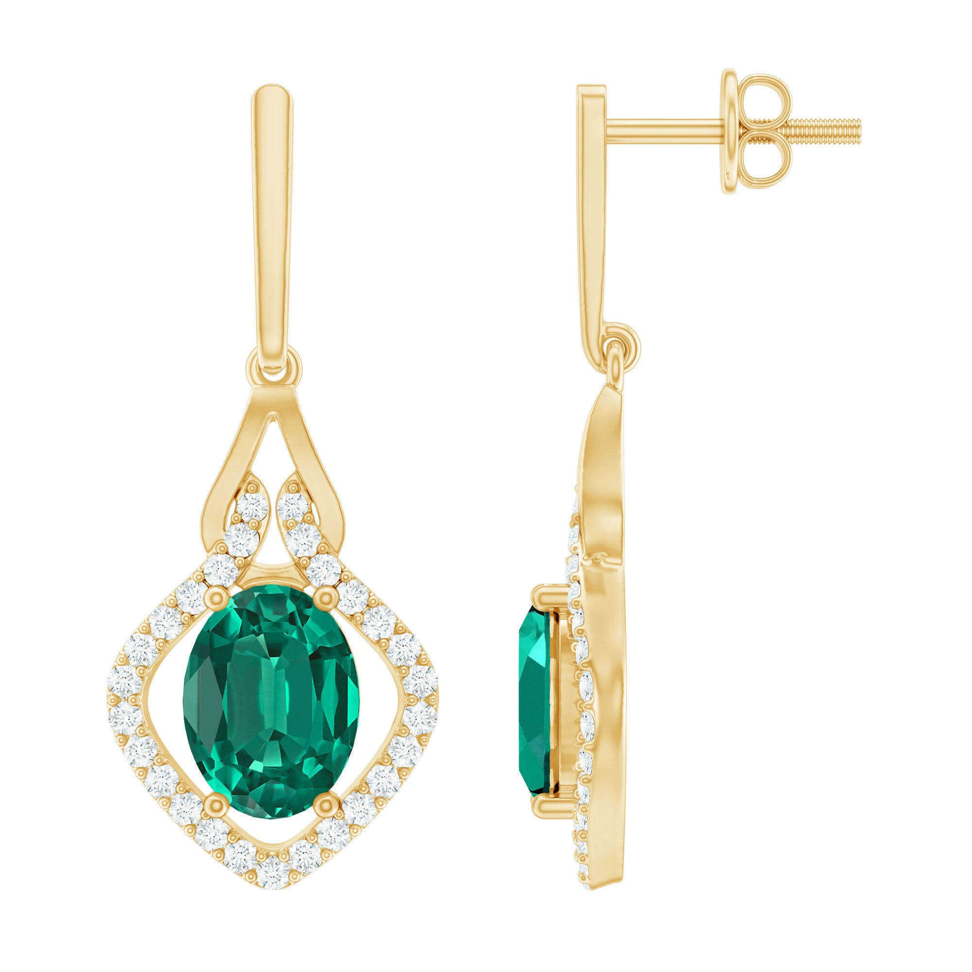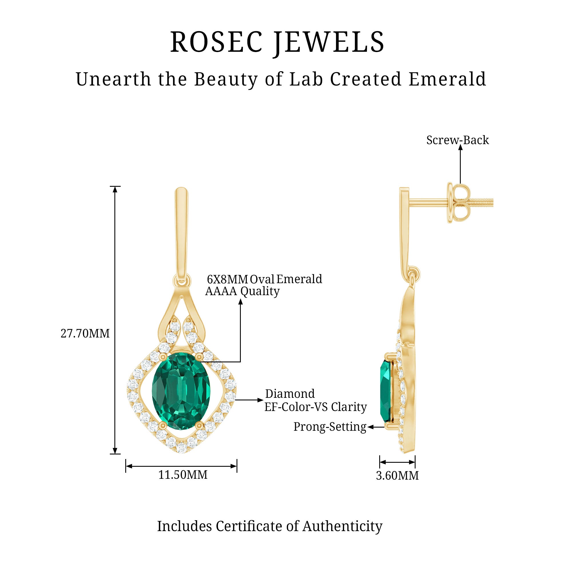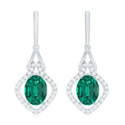 Discover the allure of elegance with our Created Emerald Drop Earrings, adorned with a mesmerizing 6x8mm Oval Shaped Lab Grown Emerald at the heart, encircled by the brilliance of Round Lab Grown Diamond Accent. Radiate charm with every move, a masterpiece created with Aaaa Quality Emerald and Ef-Vs Quality Diamonds. Elevate your style with this Emerald Diamond Earrings that seamlessly complement both formal and casual attire, adding a touch of elegance to any occasion and making every moment special with their stunning design.
