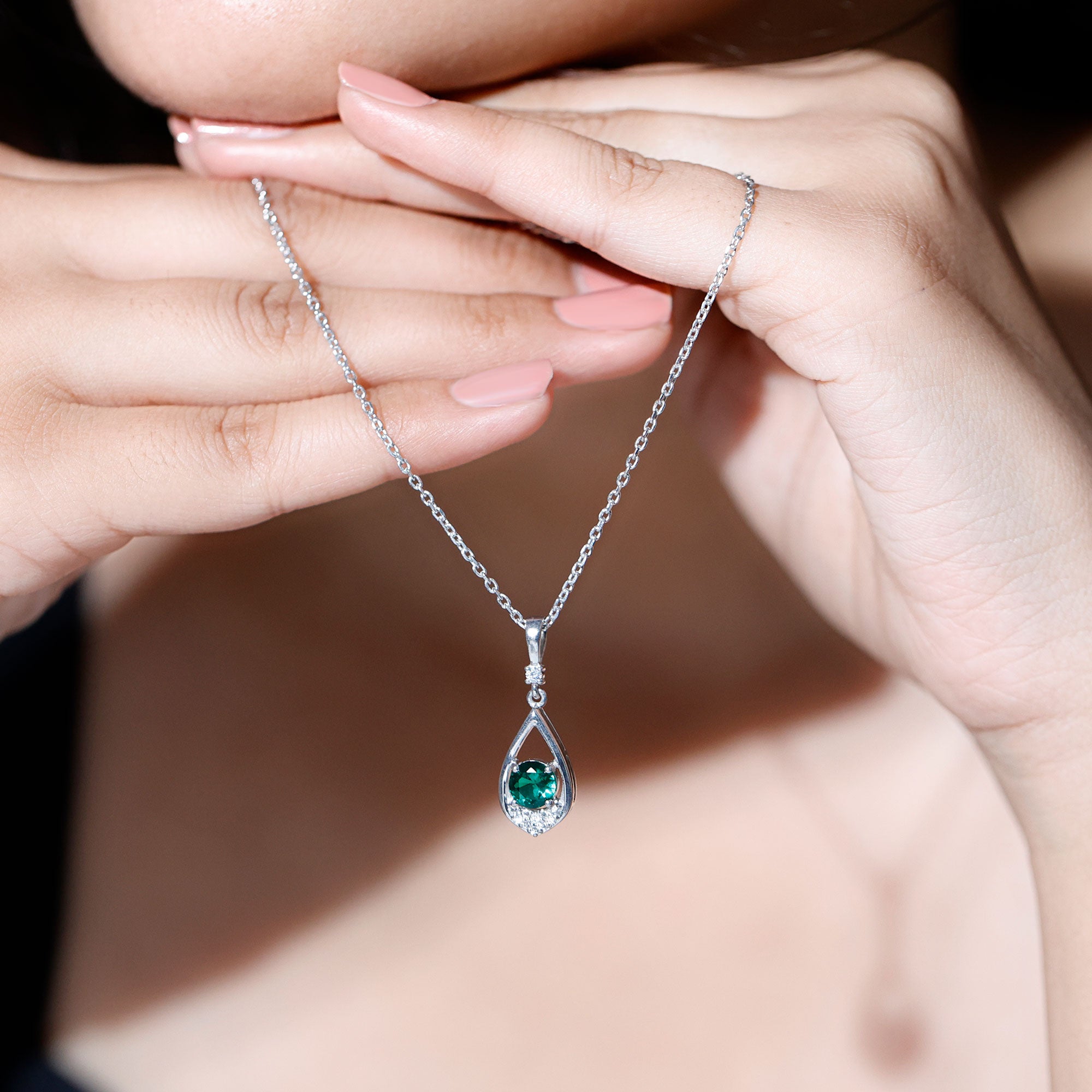 Add a green hue to your overall look with this Lab Grown Emerald Pendant crafted with 14K White Gold Plated Silver. The Teardrop Pendant Necklace is more than just jewelry, it is a symbol of grace, emotion, and mindful luxury. It features a soft, fluid shape which mirrors a teardrop decorated with a 6 MM Round Shape Lab Created Emerald secured in Prong Setting at the center. The bottom of the teardrop frame is encrusted with a cluster of round cut moissanite stones, while a single stone connects the frame with the bail. This Emerald and Moissanite Necklace symbolizes loyalty and wisdom, which makes it a perfect gift for your better half. It feels like a whisper of elegance against your skin, perfect for everyday wear and meaningful enough for special occasions. Our Green Emerald Necklace is a piece of jewelry that connects you to your inner calm while letting the world see you shine. We create this piece with lab grown AAAA quality emerald stone, so it makes a conscious choice for your big day. The pendant will be delivered to you in premium-quality packaging with a certificate of authenticity.