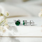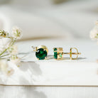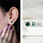 These Lab Created Emerald Stud Earrings are the perfect epitome of elegance and sophistication and come with screw back closure. The 6 mm Round Shaped Emerald of AAAA Quality is securely held in a Prong Setting with a dazzling Lab Grown Diamond sparkling from the top of these beautiful and eye-catching Green Gemstone Earrings. The Unnatural Emerald being richest in its color is similar to gorgeous naturally mined emeralds. The Rosec Jewels lets you shine like a diva and will make your event more special either when worn as Solitaire Studs or are a unique gift for that special person for their special occasion.