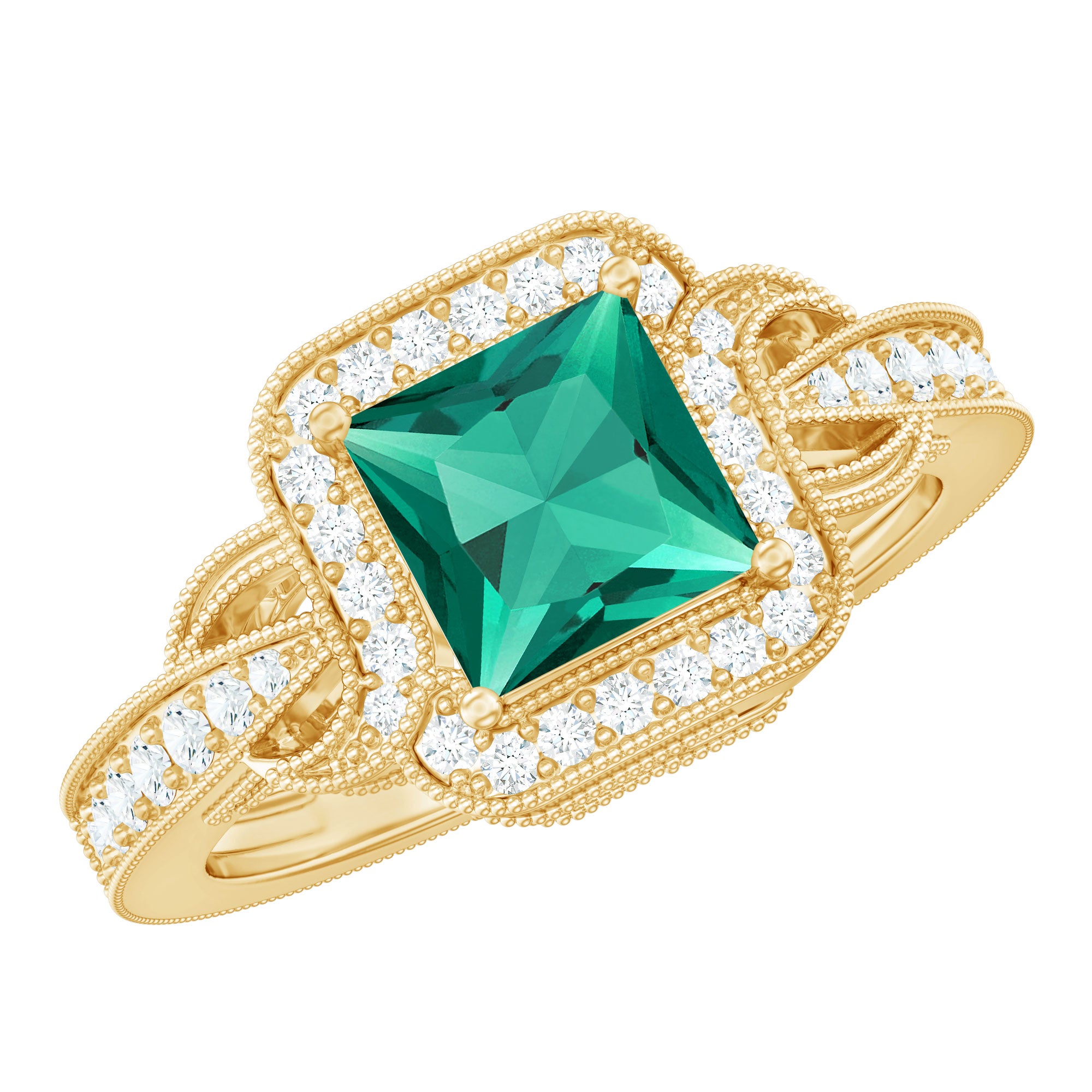 Embark your journey into timeless elegance with this Art Deco Engagement Ring showcasing a stunning 6mm Princess Cut Lab Grown Emerald gemstone set as a centerpiece. Delicate Lab Grown Diamond gemstones and Beaded Detailing enhance the vintage charm, creating a captivating and romantic aesthetic. The Aaaa Quality Emerald and Ef-Vs Quality Diamonds defines sustainability. This enchanting Emerald Diamond Ring (Lab Created) is a testament to our dedication to ethical and eco-friendly practices.