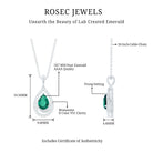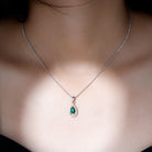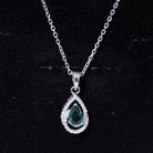 Step into vintage elegance with a piece of jewelry that sparkles like a star - this Lab Grown Emerald Necklace is a true celebration of brilliance and beauty. At the heart of this design lies a captivating 5X7 MM pear shaped Lab Grown Emerald which shines with its AAAA quality, making it a timeless piece. Surrounding the center stones is a teardrop frame studded with dainty round Moissanite stones, creating a halo effect. The prong setting used throughout adds durability and elevates the beauty, giving each stone its moment to shine. The Emerald Teardrop Pendant dangles gracefully from a sleek chain, both handcrafted in White Gold Plated Silver. It is a perfect harmony of old world artistry and timeless sophistication. Whether you are the bride walking down the aisle, a bridesmaid stealing glances, or simply dressing up for a moment worth remembering, this Bridal Necklace for Wedding brings a magical glow that mirrors your joy.