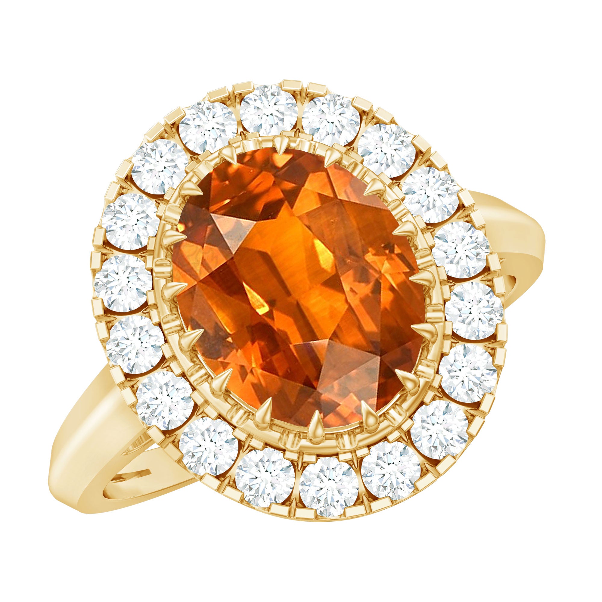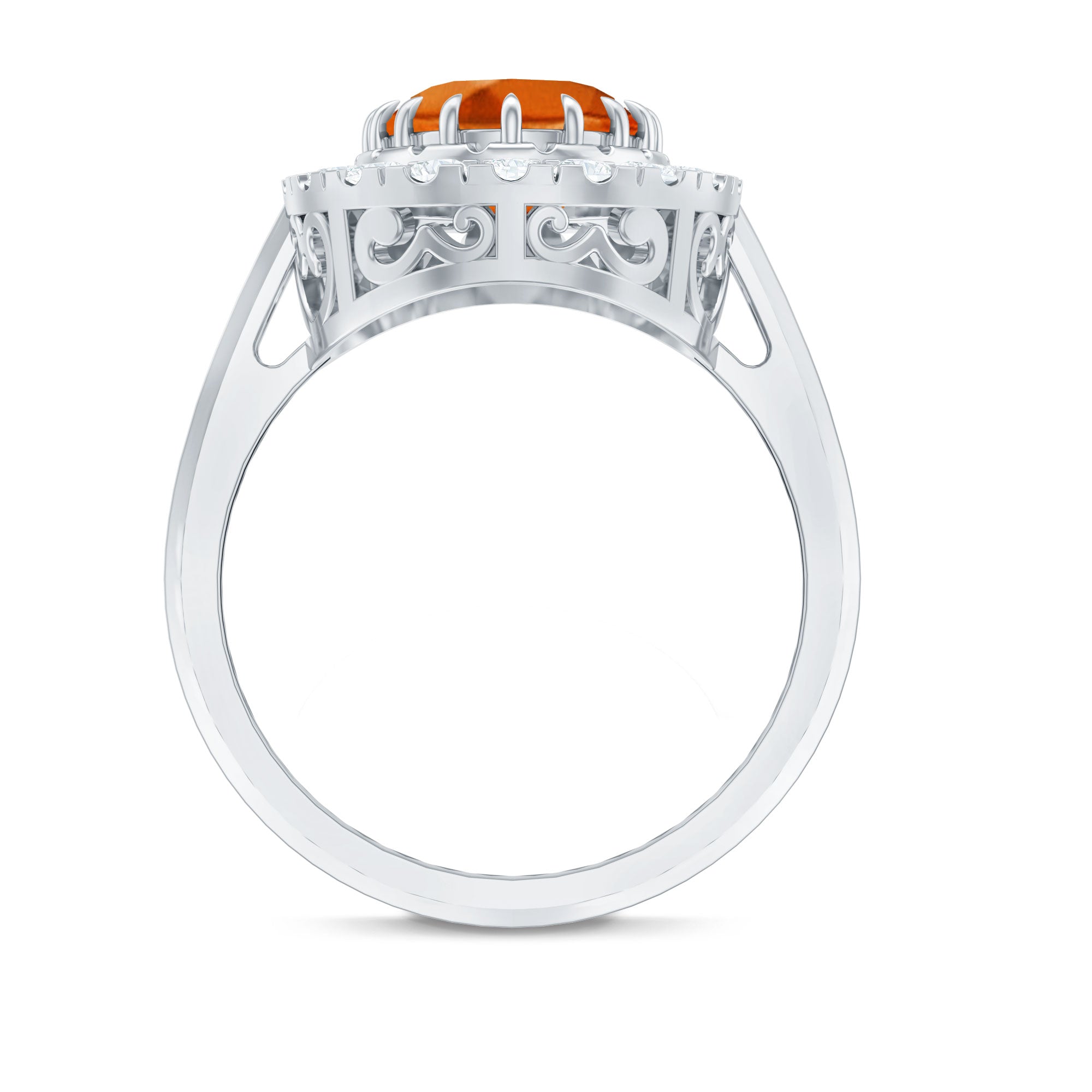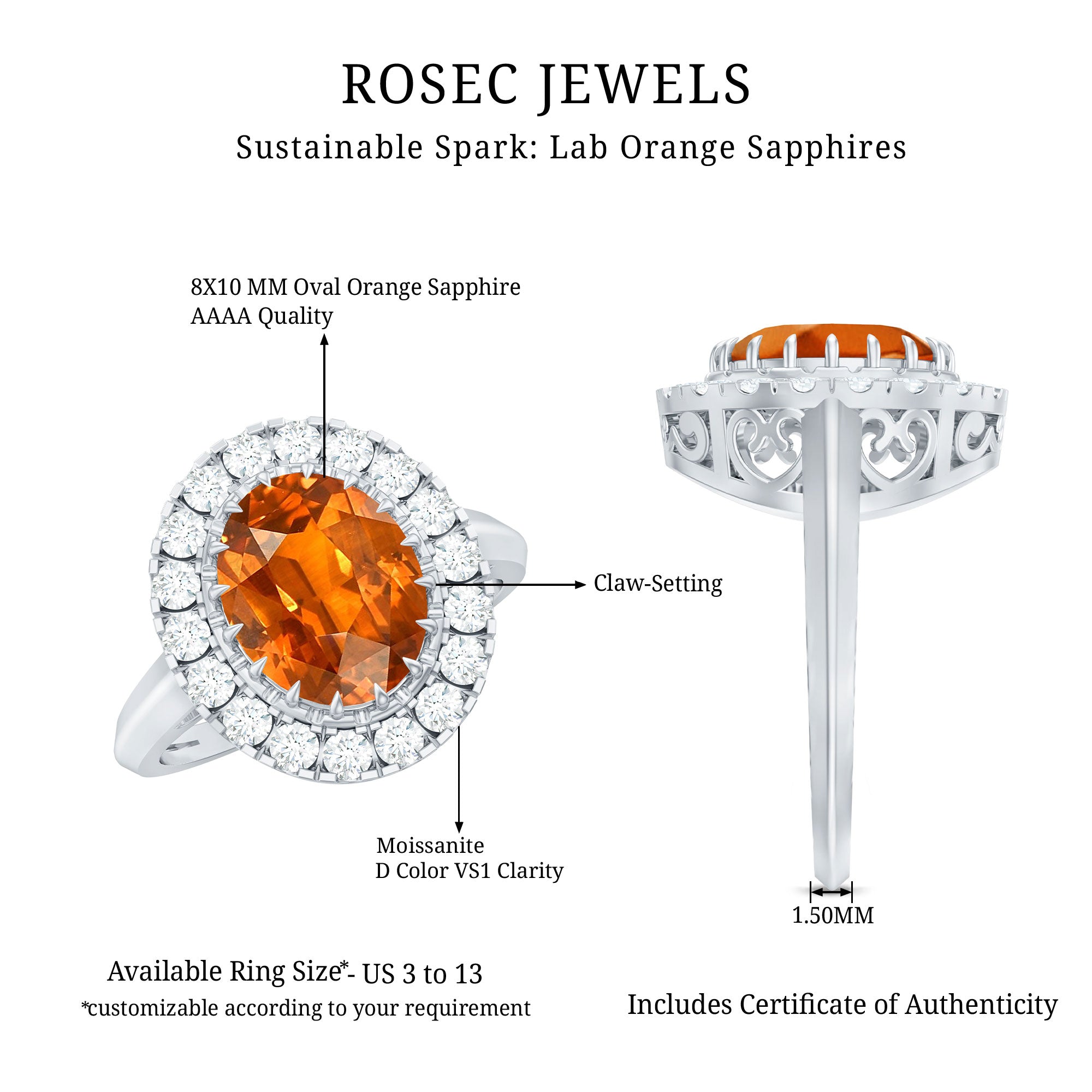 Unique in design, this stunning Engagement Ring is decorated with an Oval Cut Lab Grown Orange Sapphire as a solitaire in Claw Setting while small Round Shape Moissanite studded as Halo. Whether it be a Birthday gift for your mom, daughter, or yourself, an Anniversary Gift for her, or a proposal, this Vintage Style Ring is the best choice!