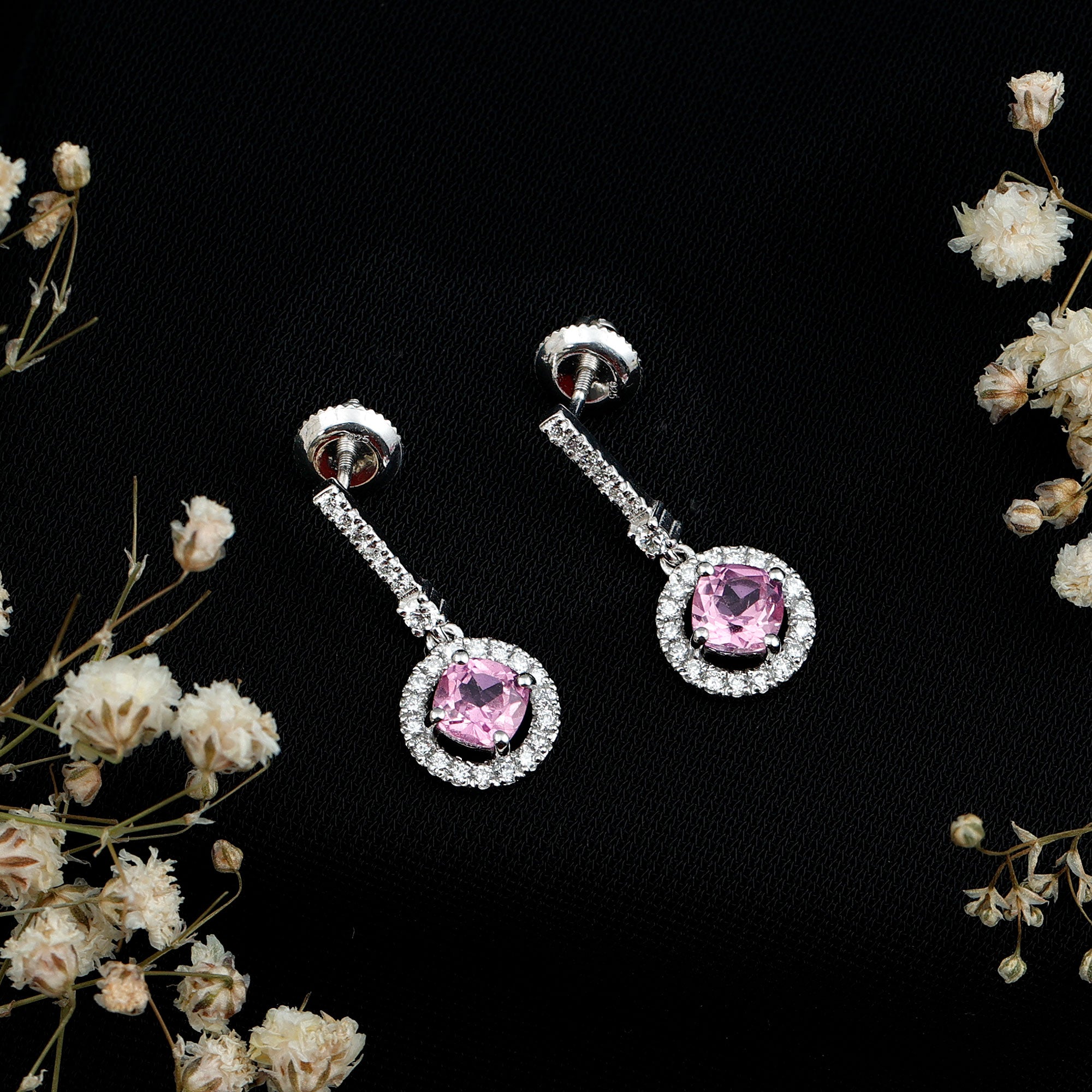 For a bride who loves timeless designs and a pop of color, these Pink Sapphire Earrings say it all, elegance, romance, and timeless beauty. Add a soft, feminine glow to your bridal look with these Sapphire Drop Earrings. Crafted in white gold plated silver, they feature a stunning 5 MM cushion cut lab created pink sapphire. Set in prong setting, the sapphire symbolizes love, strength, and passion, making it a perfect gemstone for brides on their big day. Surrounding the center stone is a dazzling halo of lab grown diamonds, each one meticulously placed to form a perfect circle of sparkle and elegance. The vertical line of round lab grown diamonds at the top creates a sleek and sparkling pathway from your ear to the main drop. The Sapphire and Diamond Earrings are designed with a secure screw-back closure that ensures comfort and confidence as you wear them throughout your wedding day and beyond. These Wedding Drop Earrings are not just an accessory, they are a statement. Whether paired with a classic bridal gown or even worn as anniversary or special occasion jewelry later on, they bring the perfect mix of charm, sentiment, and sparkle. For the bride who dreams in pink and shines with love, this duo is the finishing touch that completes the picture.