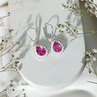 These enchanting Lab Grown Sapphire Drop Earrings are a perfect blend of elegance and contemporary design. Crafted from White Gold Plated Silver, these Hoop Drop Earrings are embellished with 7X10 MM Pear Shape Lab Grown Pink Sapphire in Prong Setting with the Round brilliant cut Moissanite Halo. The captivating Teardrop design catches the light beautifully by adding a contemporary edge with a striking interplay of shape that turns heads with every turn. Embodying a unique flair, these Teardrop Drop Earrings embody a unique artistic flair, with a statement piece of jewelry. Embrace the sophistication and timeless beauty of these exquisite Pear Shape Earrings and let them illuminate your look with elegance and charm. With their enchanting style and timeless appeal, these Halo Earrings tell a story of elegance and grace. Whether you are dressing up for a special occasion or adding a touch of glamour to your everyday ensemble, these earrings will undoubtedly elevate your style.