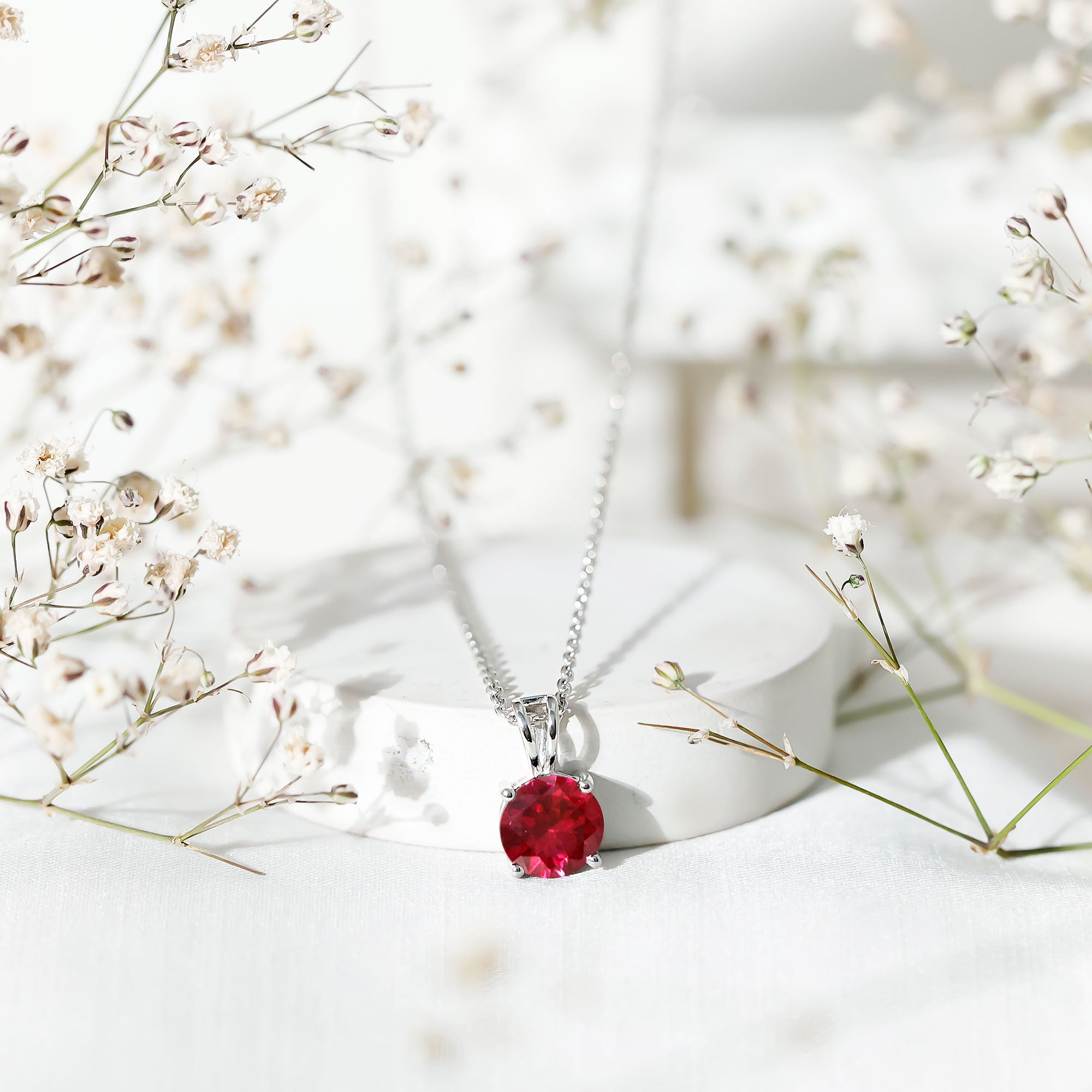Create a lasting impression with this classic Round Cut Pendant, crafted to enchant every woman. This simple yet elegant Solitaire Pendant Necklace is made from 14k white gold plated sterling silver and features a stunning 8 MM round cut lab grown ruby gemstone. The Ruby Solitaire Necklace includes a matching cable chain that fastens with a lobster clasp for easy length adjustments. The bail has a simple design that showcases the solitaire elegantly without overshadowing it and secure prong setting maximizes the visibility of the sparkling gemstone for all to see. Its forever round cut design makes it easy to layer with other chain or gemstone necklaces. The AAAA quality lab created ruby boasts a rich deep red hue that glimmers in the light. With its timeless design and classic beauty, this Red Gem Necklace is sure to be a treasured piece for years to come.