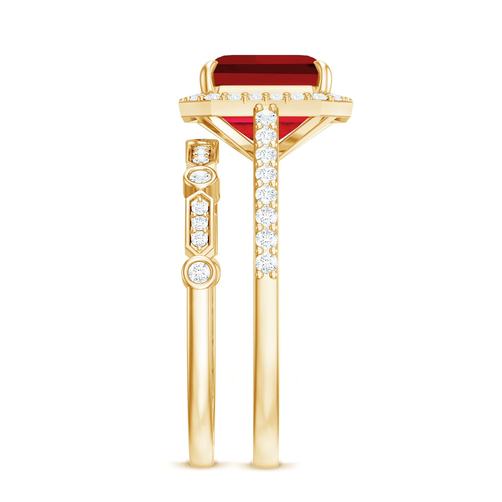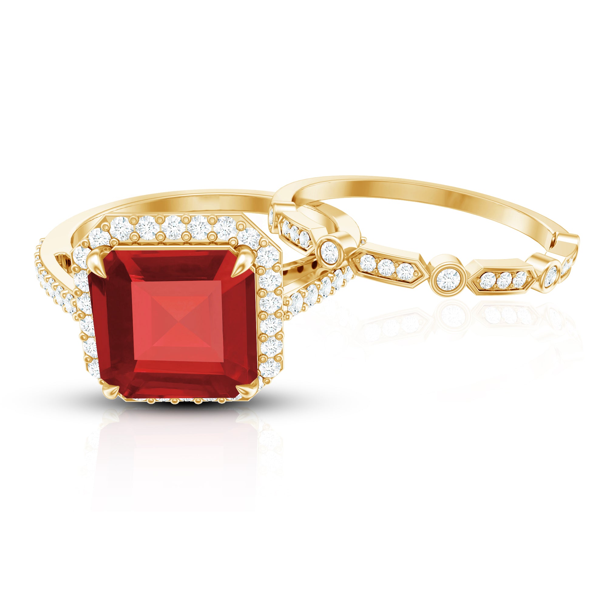 The Lab Created Ruby Wedding Ring Set is a two piece bridal beauty that perfectly mixes elegance, comfort, and meaning. It is designed for couples who want something truly special to symbolize their forever story. The main engagement ring shows off a stunning 8 MM asscher cut lab created ruby, safely held in claw setting. Around it sits a bright halo of tiny diamonds that shimmer beautifully whenever light touches them. The band is either covered in small diamonds that add an extra sparkle. Every angle of this ring catches attention in the most graceful way. What makes the Halo Bridal Set even more charming is the diamond enhancer ring that comes with it. It is designed to wrap around the engagement ring smoothly, creating a full and finished look. Together, both rings form a picture-perfect match that feels complete and balanced. The halo design and the snug fit of the enhancer make the entire Ruby and Diamond Wedding Ring Set look luxurious, yet romantic at the same time. Made with AAAA quality lab grown ruby and HI-SI quality diamonds, the craftsmanship is top-notch. Available in a variety of sizes, the rings are comfortable enough to wear every day while still making you feel special. It is a symbol of love, unity, and brilliance that will never fade.