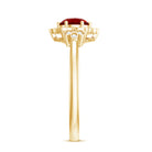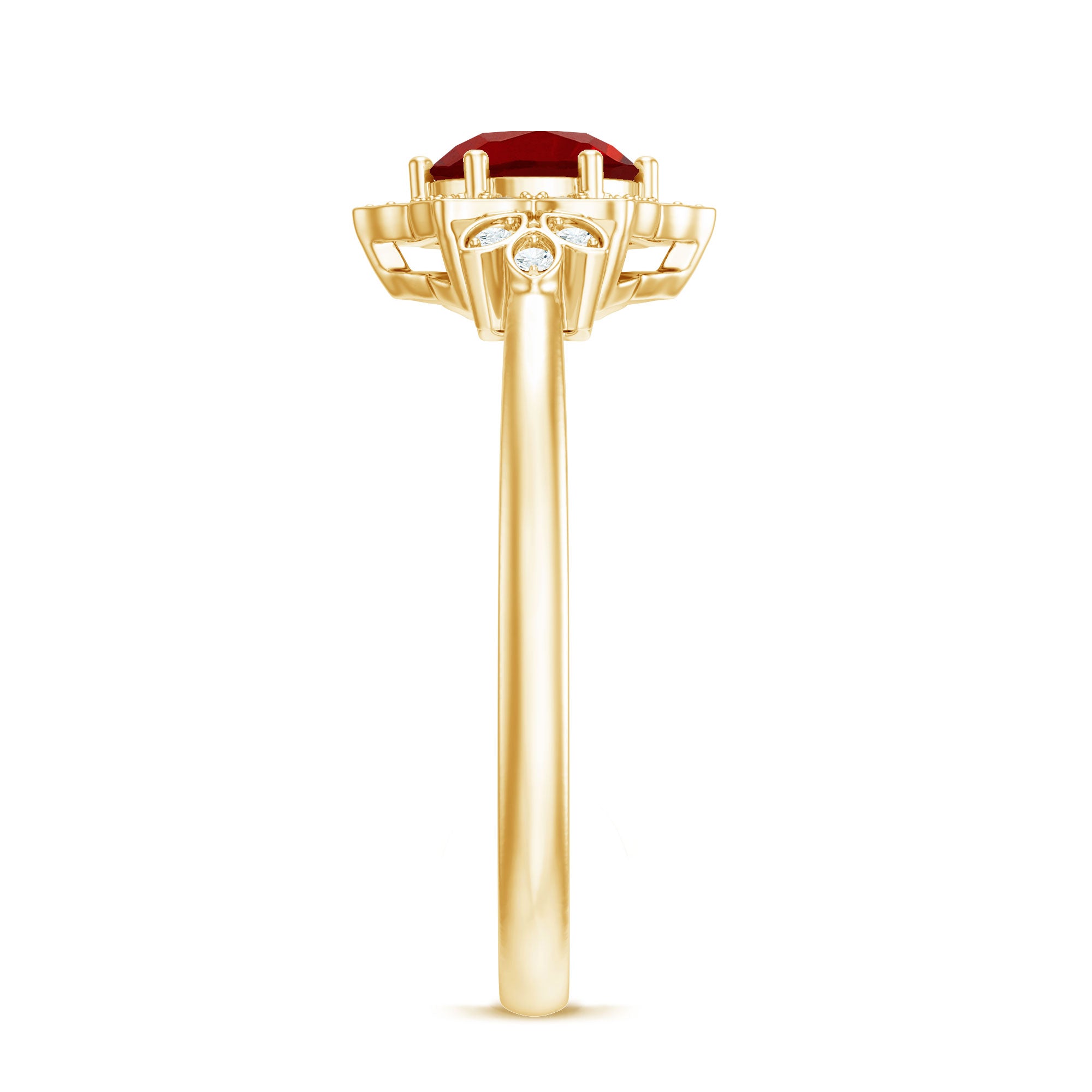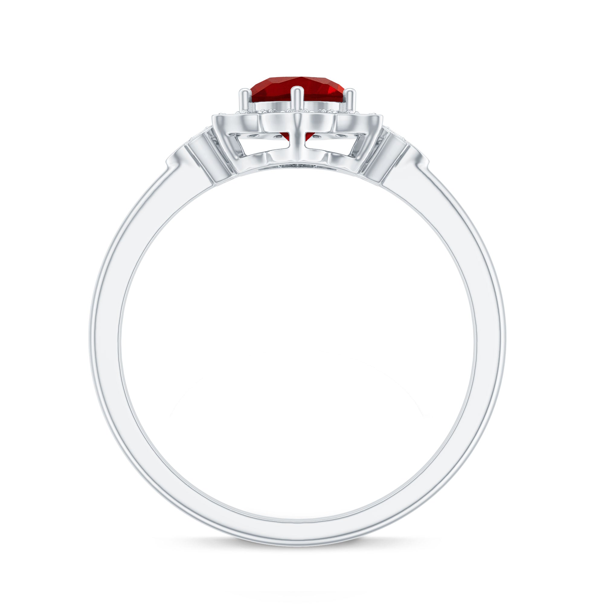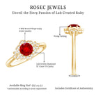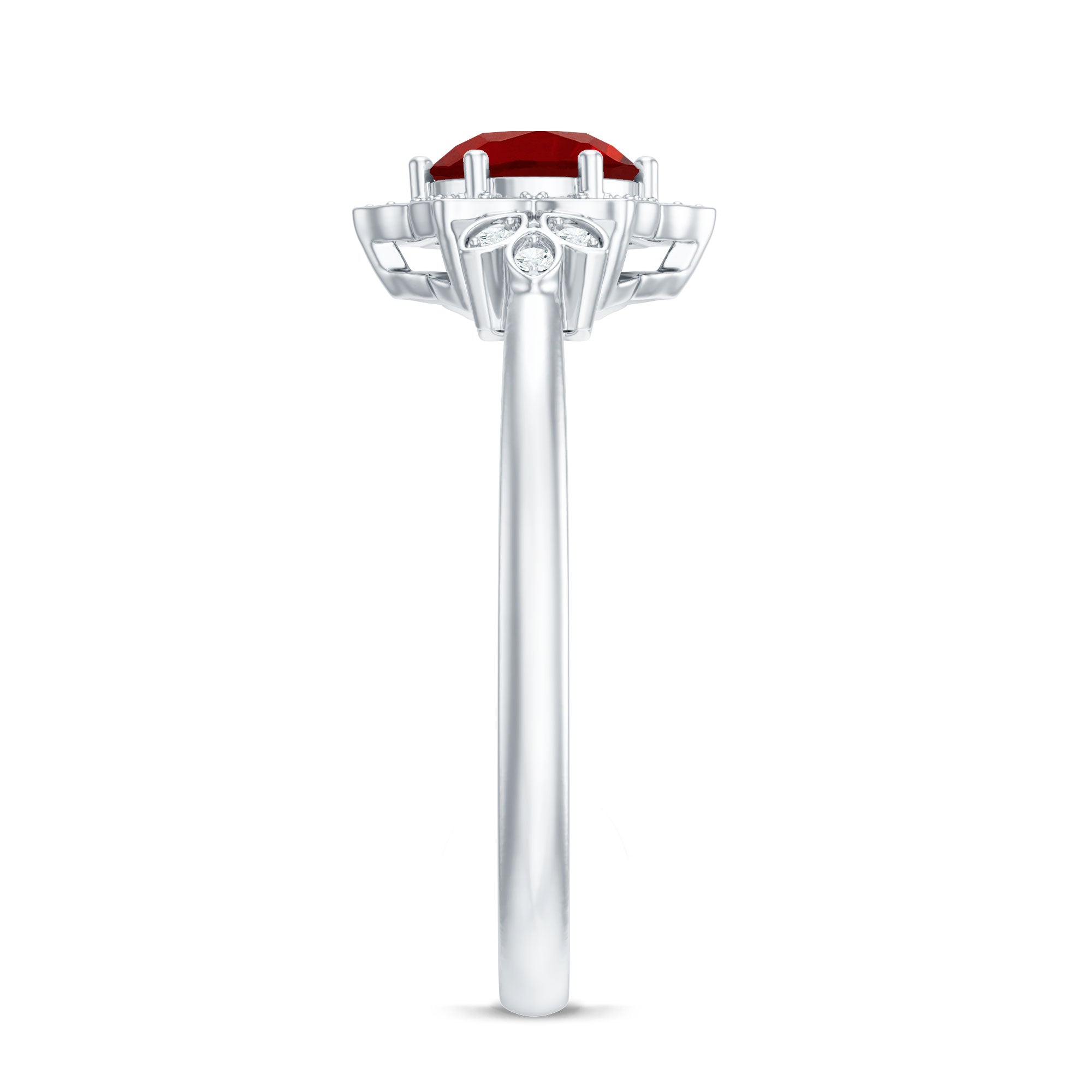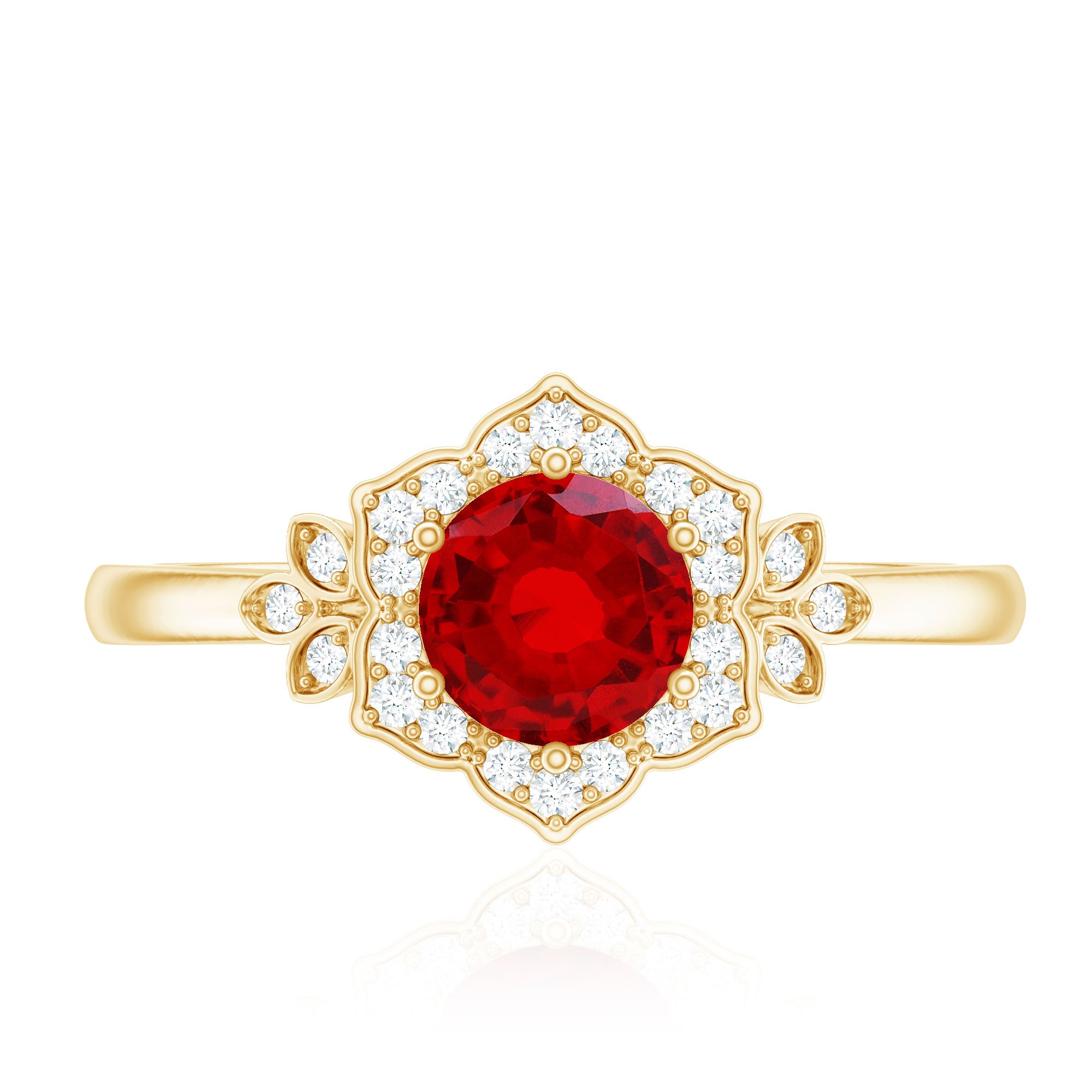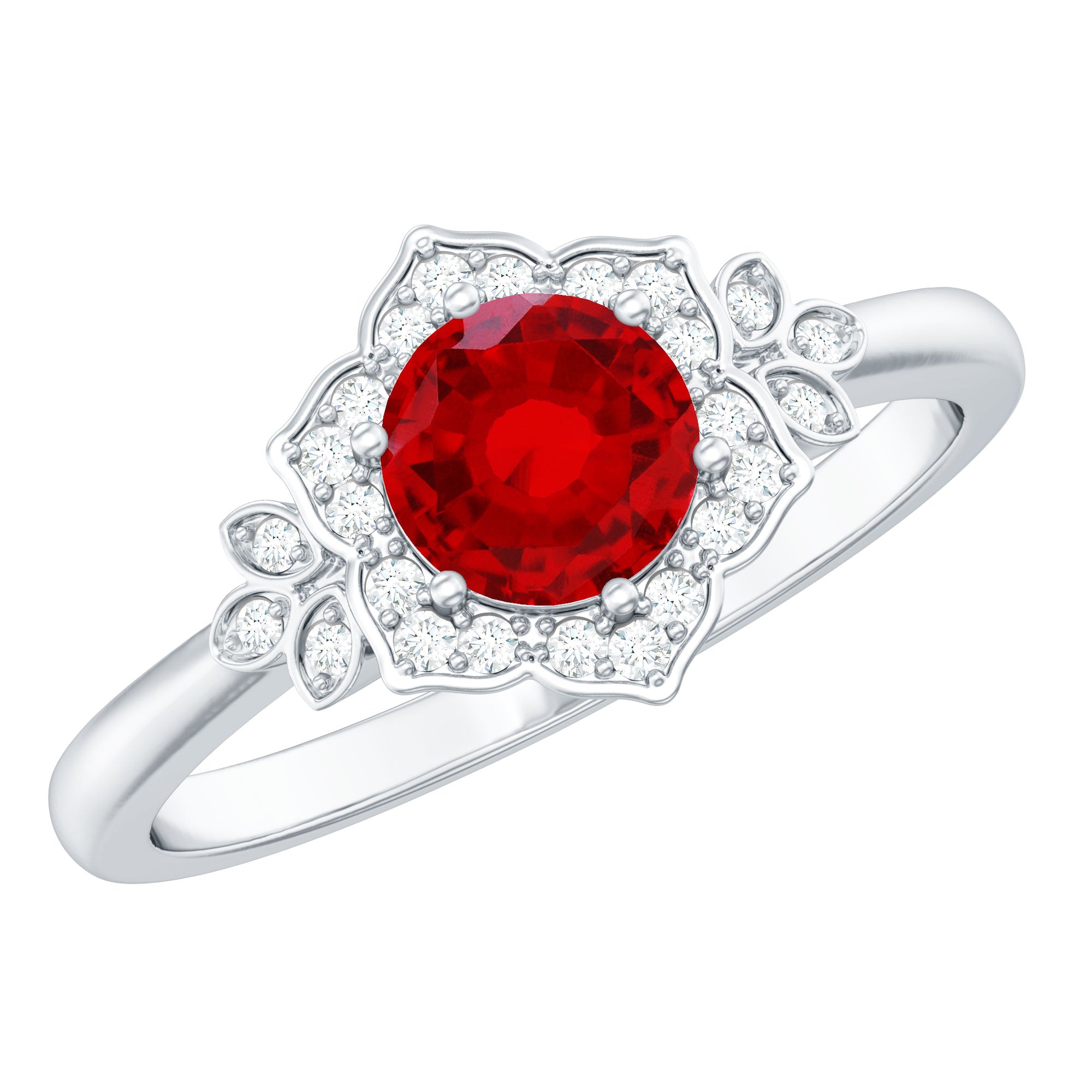 Let nature’s beauty shine through your love story with this charming Lab Created Ruby Engagement Ring. Designed for those who love a touch of natures elegance to their jewelry, this Floral Engagement Ring brings a classic touch to a very special moment. At the heart of the ring is a 6 MM round shaped lab grown ruby of AAAA quality. The ruby sparkles brightly and is safely held in prong setting. Surrounding the center stone are small round lab created diamonds that form a delicate flower halo. These EF-VS quality diamonds add the perfect amount of shine, making the Nature Inspired Engagement Ring feel both fresh and romantic. The use of lab created stones makes it an affordable yet high quality option, so you can show your love without worry for the environment. This Ruby and Diamond Engagement Ring is carefully crafted to capture the spirit of natural beauty and is packed in a lovely jewelry box, ready to be gifted. Whether you are planning a romantic surprise or marking a special milestone, this Ruby Flower Ring is a heartfelt way to show your love.