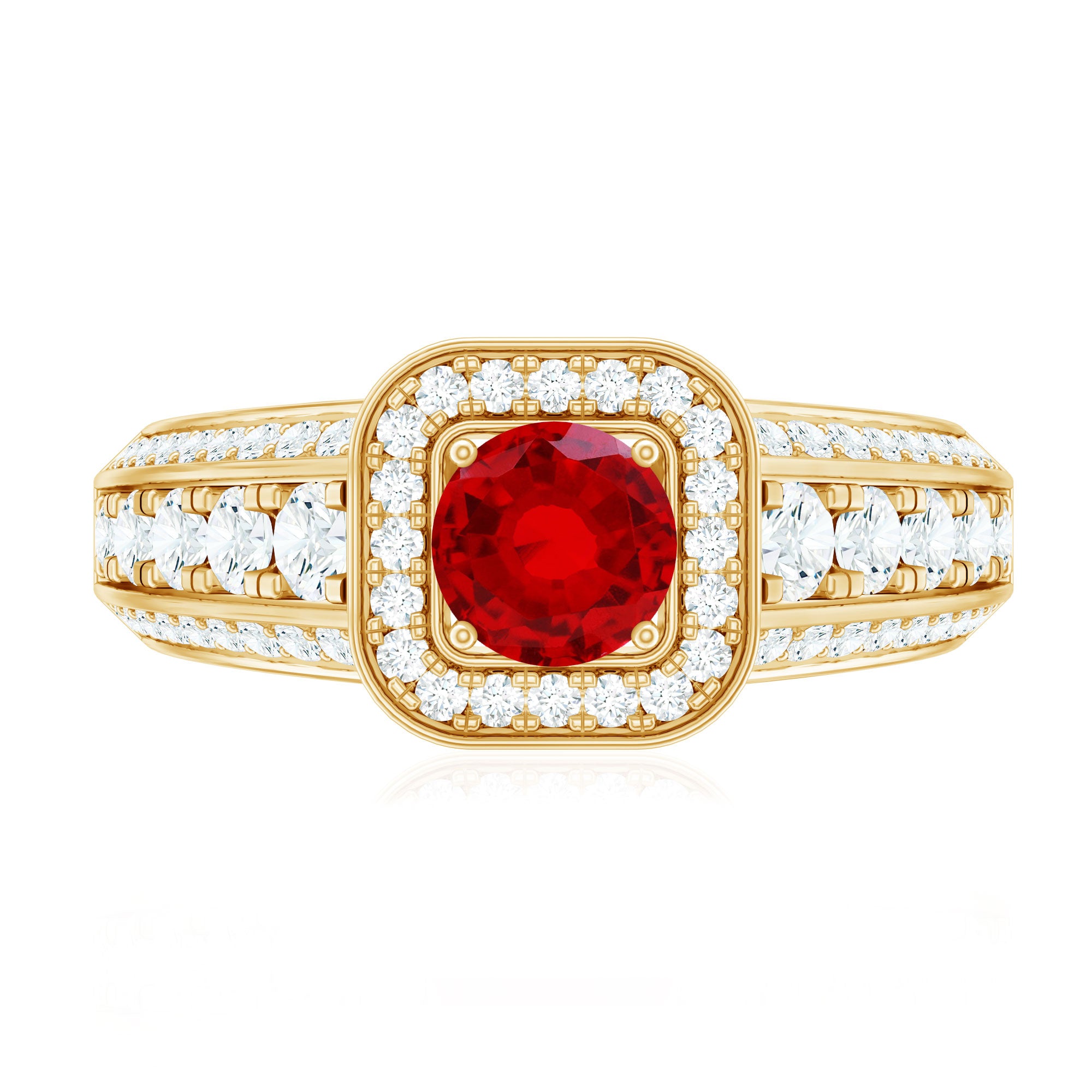 Enhance your look with a romantic touch by wearing this exquisite Statement Ring adorned with a Round Cut Lab Created Ruby at the center, accompanied by sparkling Round Cut Moissanite in an Accent Setting. This Created Ruby Ring is the perfect go-to accessory for all women. Let the allure of this stunning ring add a touch of elegance and charm to your style, making every occasion special and memorable.