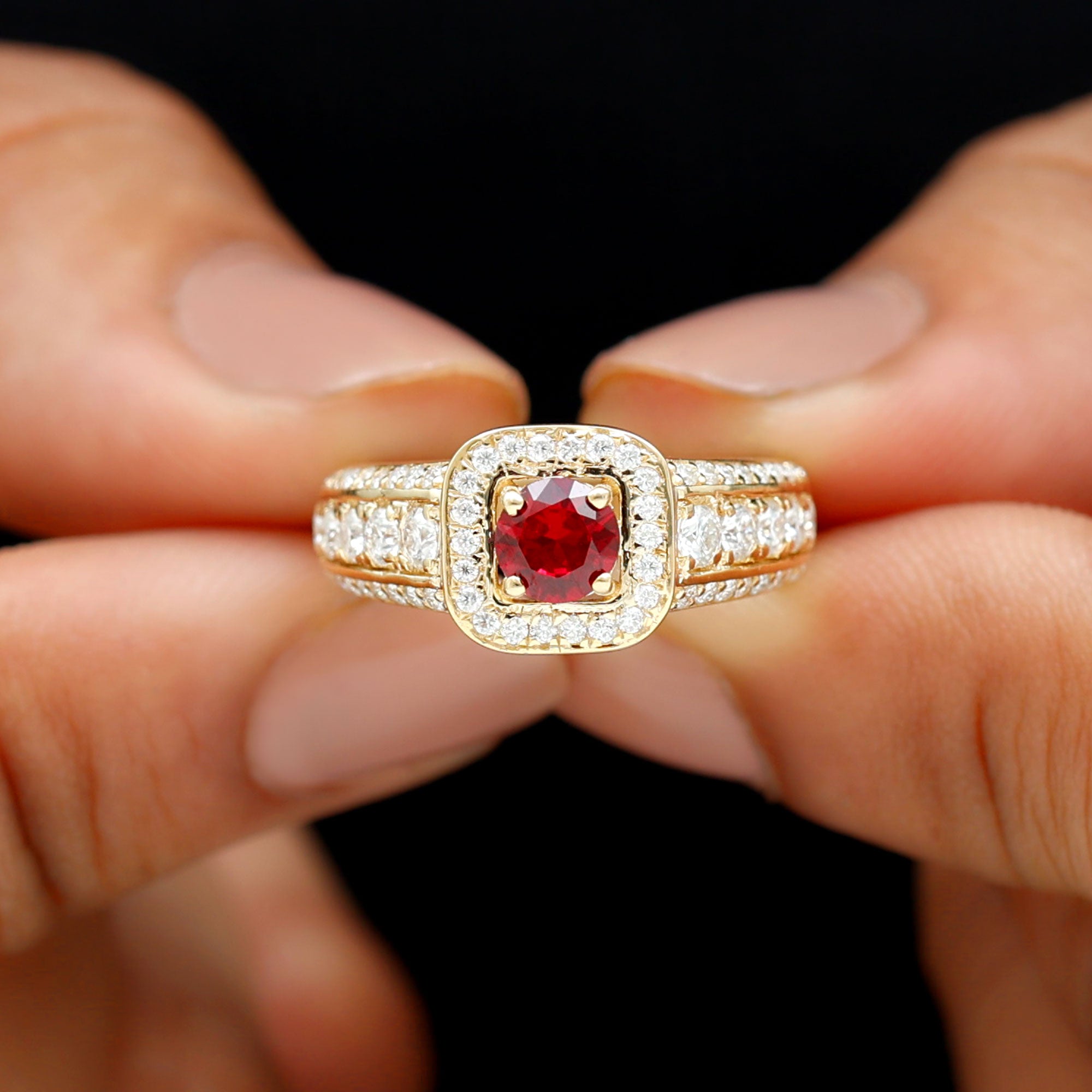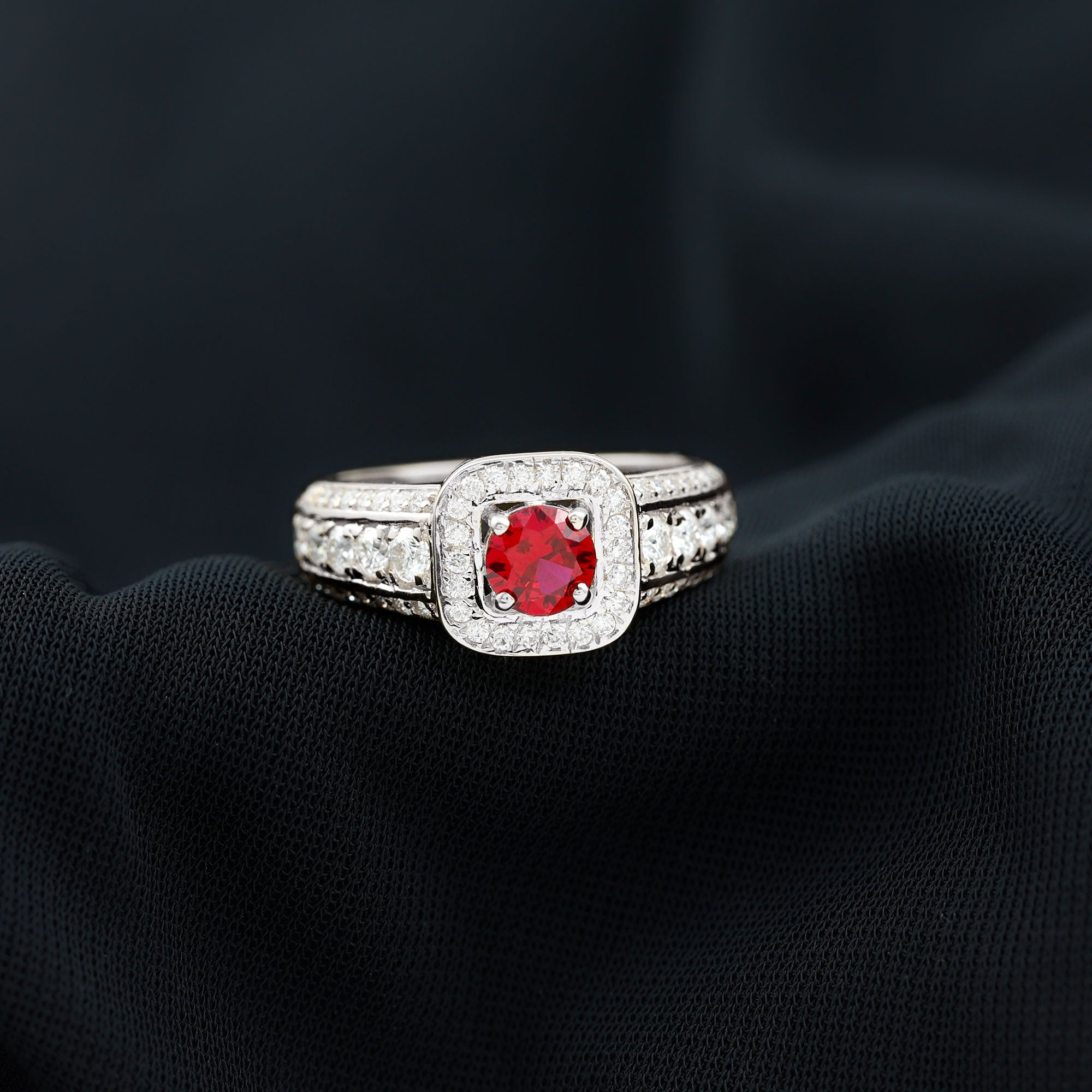 Enhance your look with a romantic touch by wearing this exquisite Statement Ring adorned with a Round Cut Lab Created Ruby at the center, accompanied by sparkling Round Cut Moissanite in an Accent Setting. This Created Ruby Ring is the perfect go-to accessory for all women. Let the allure of this stunning ring add a touch of elegance and charm to your style, making every occasion special and memorable.